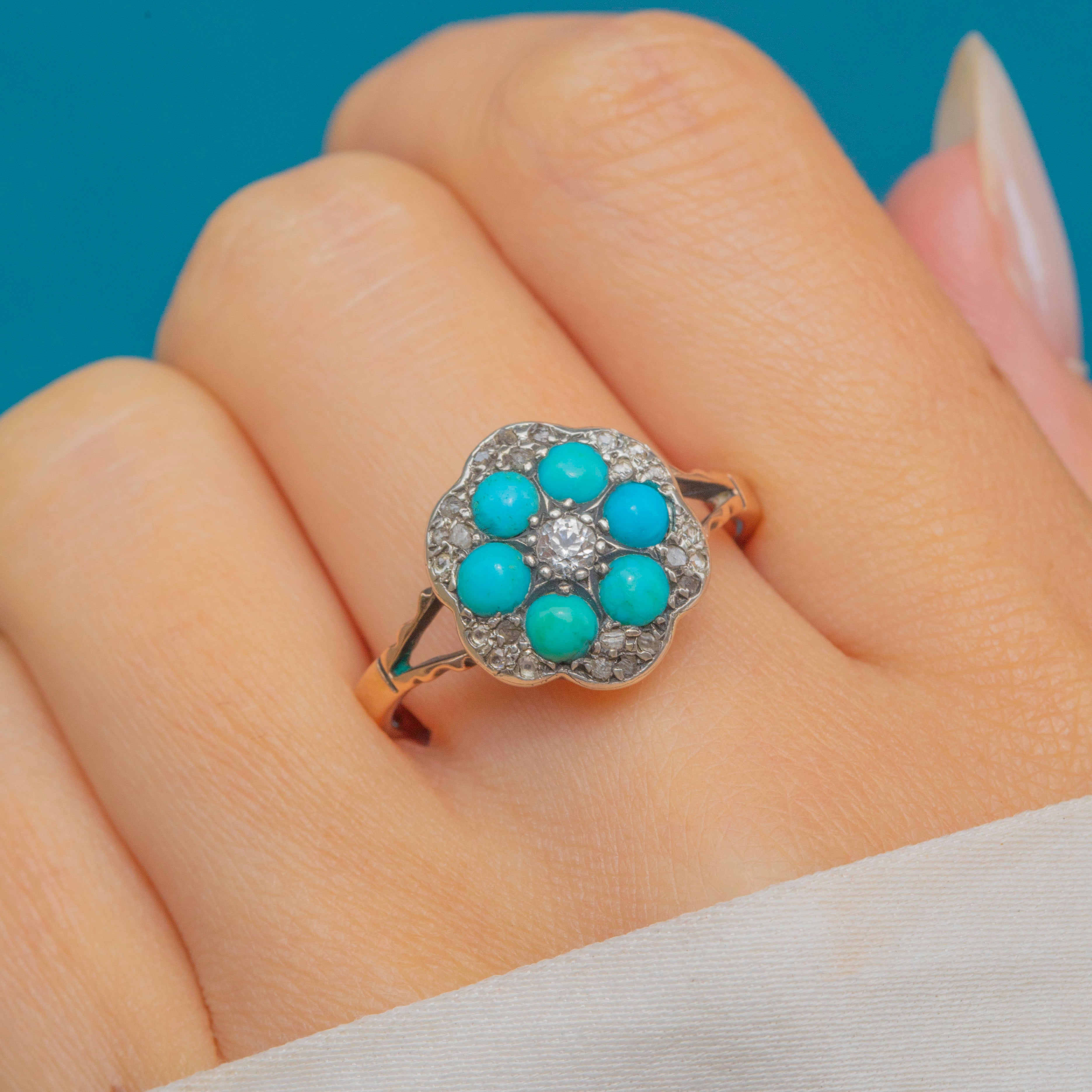 This Victorian flower cluster ring showcases a radiant central White Sapphire set within an intricate floral design, surrounded by a halo of vibrant Turquoise cabochons and twinkling rose-cut Diamonds.