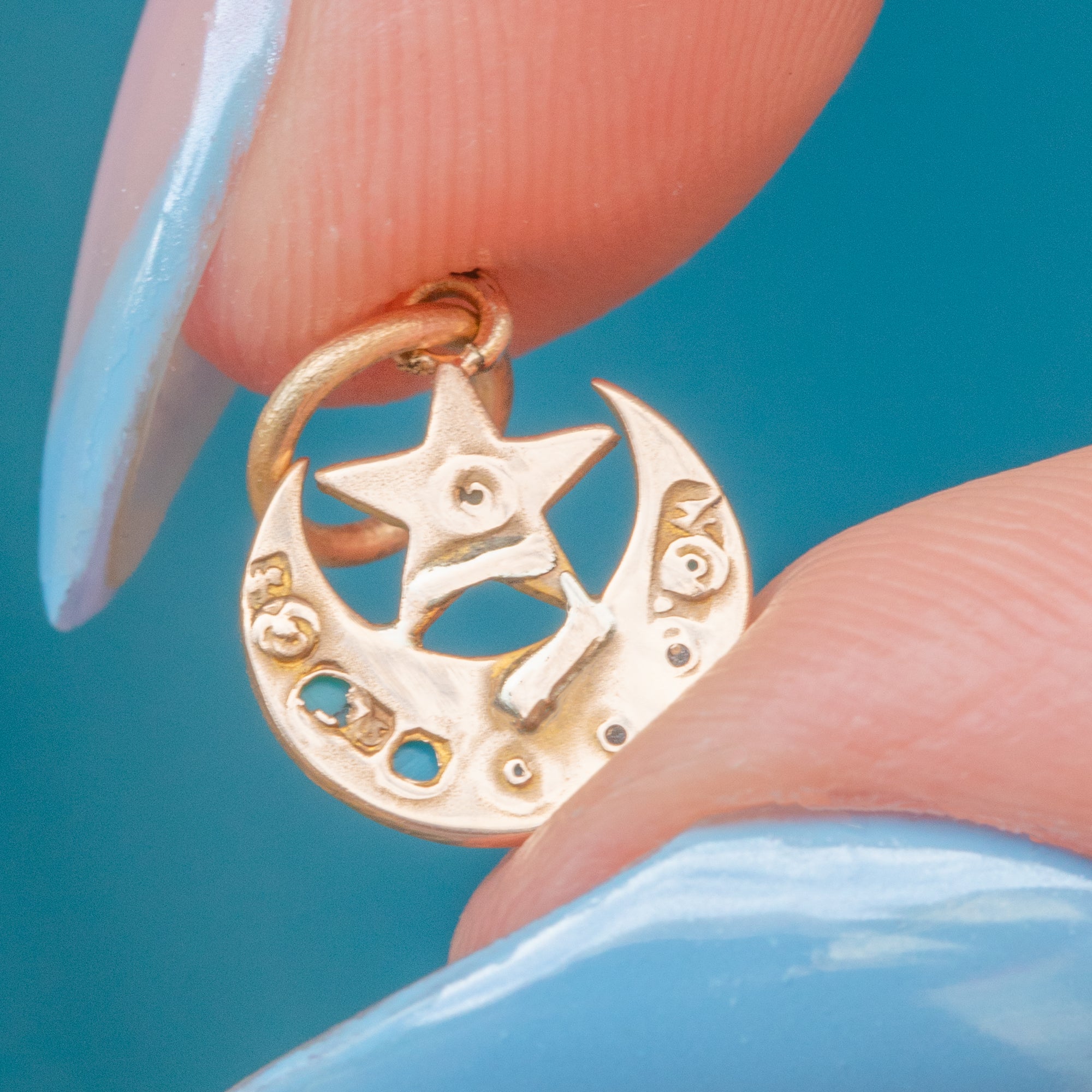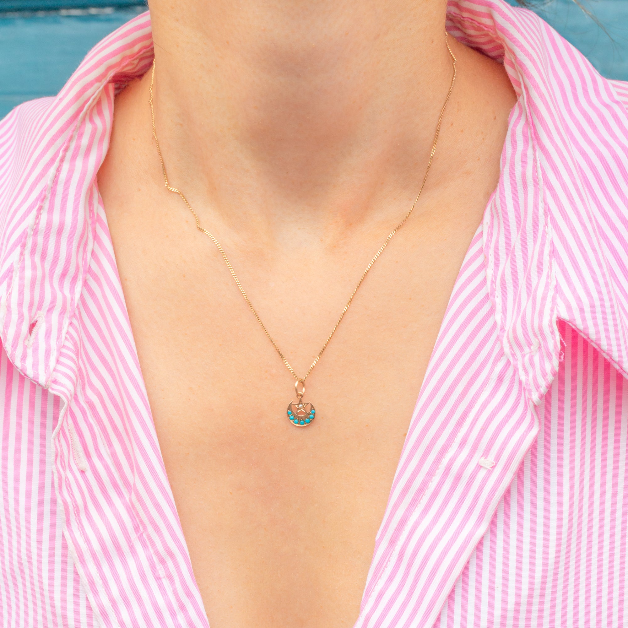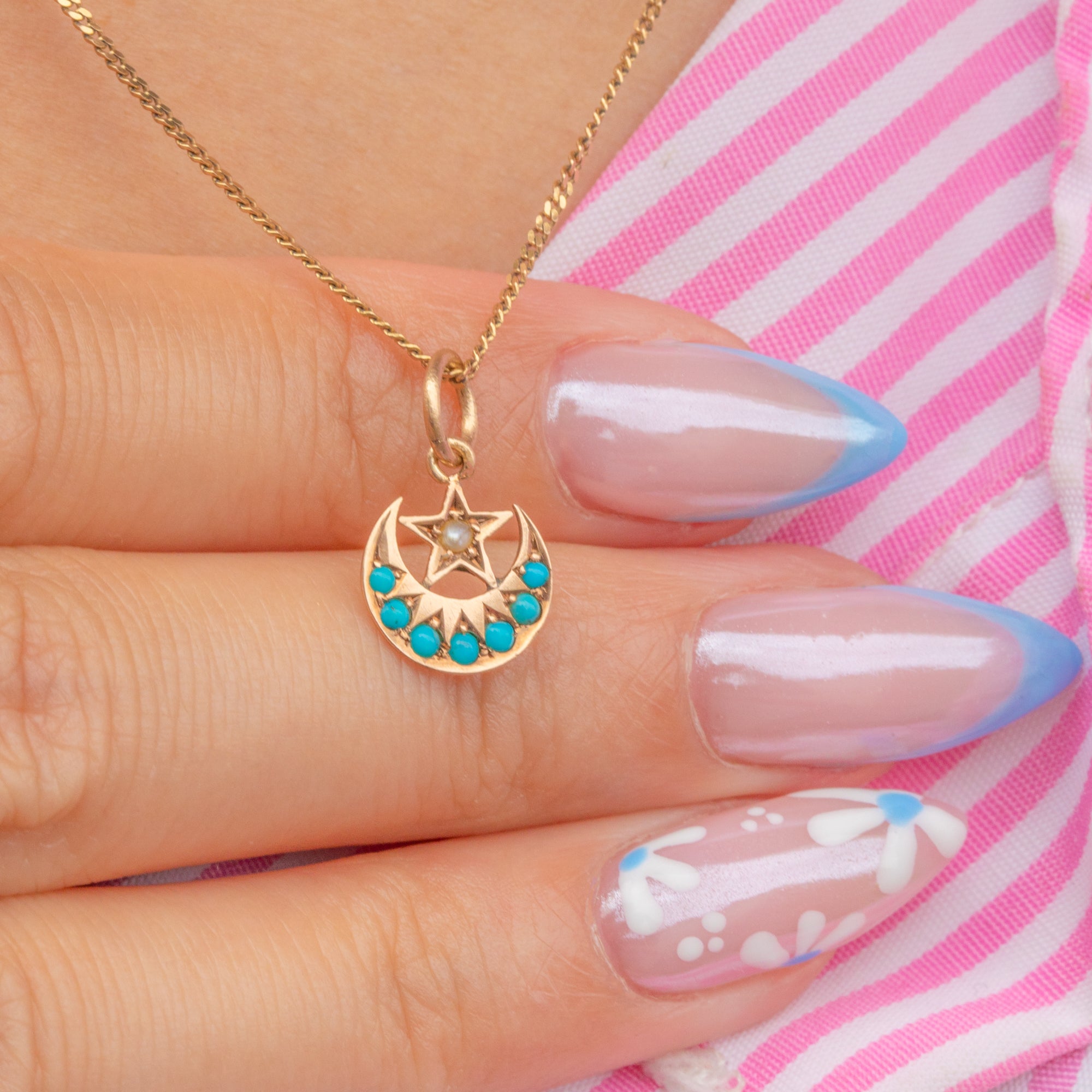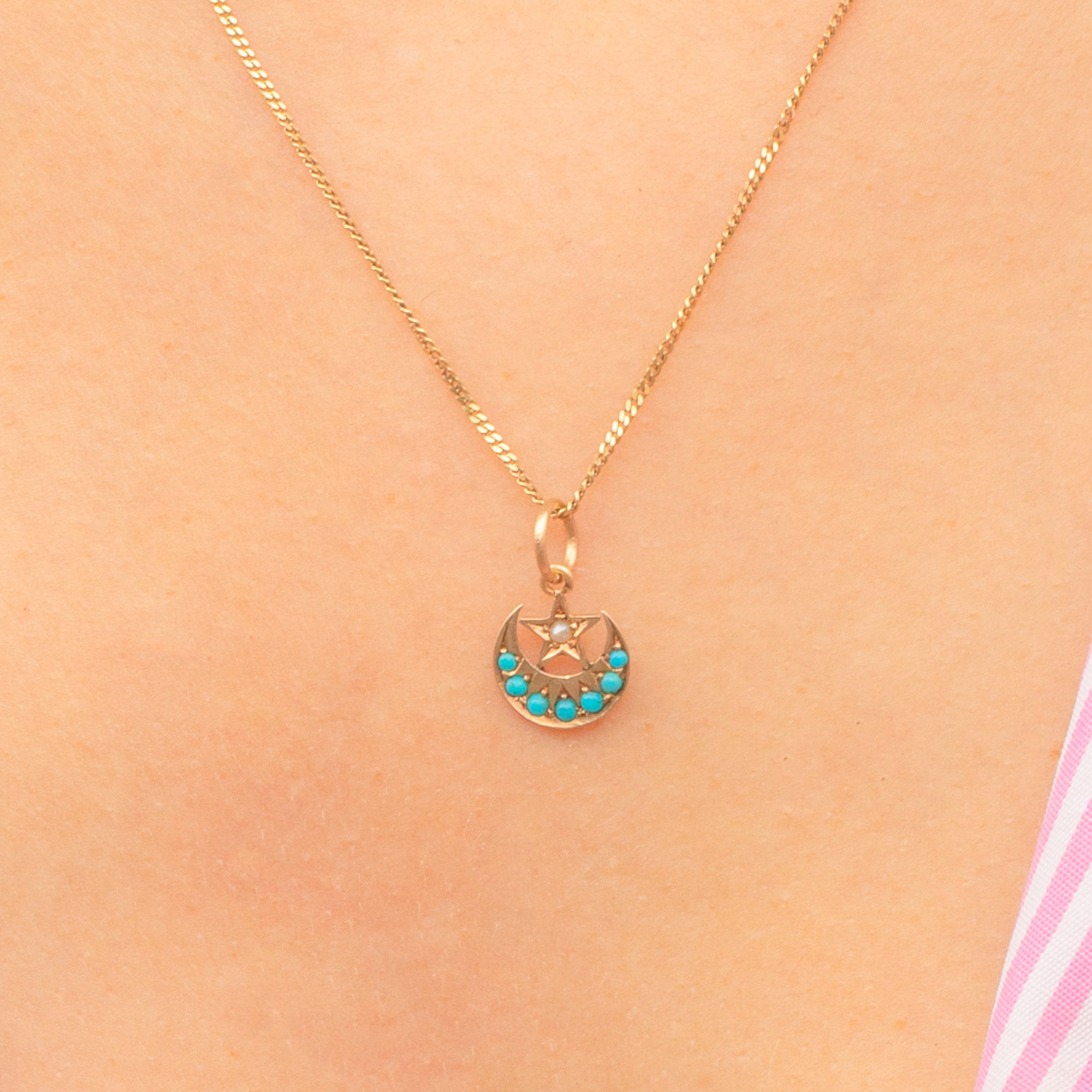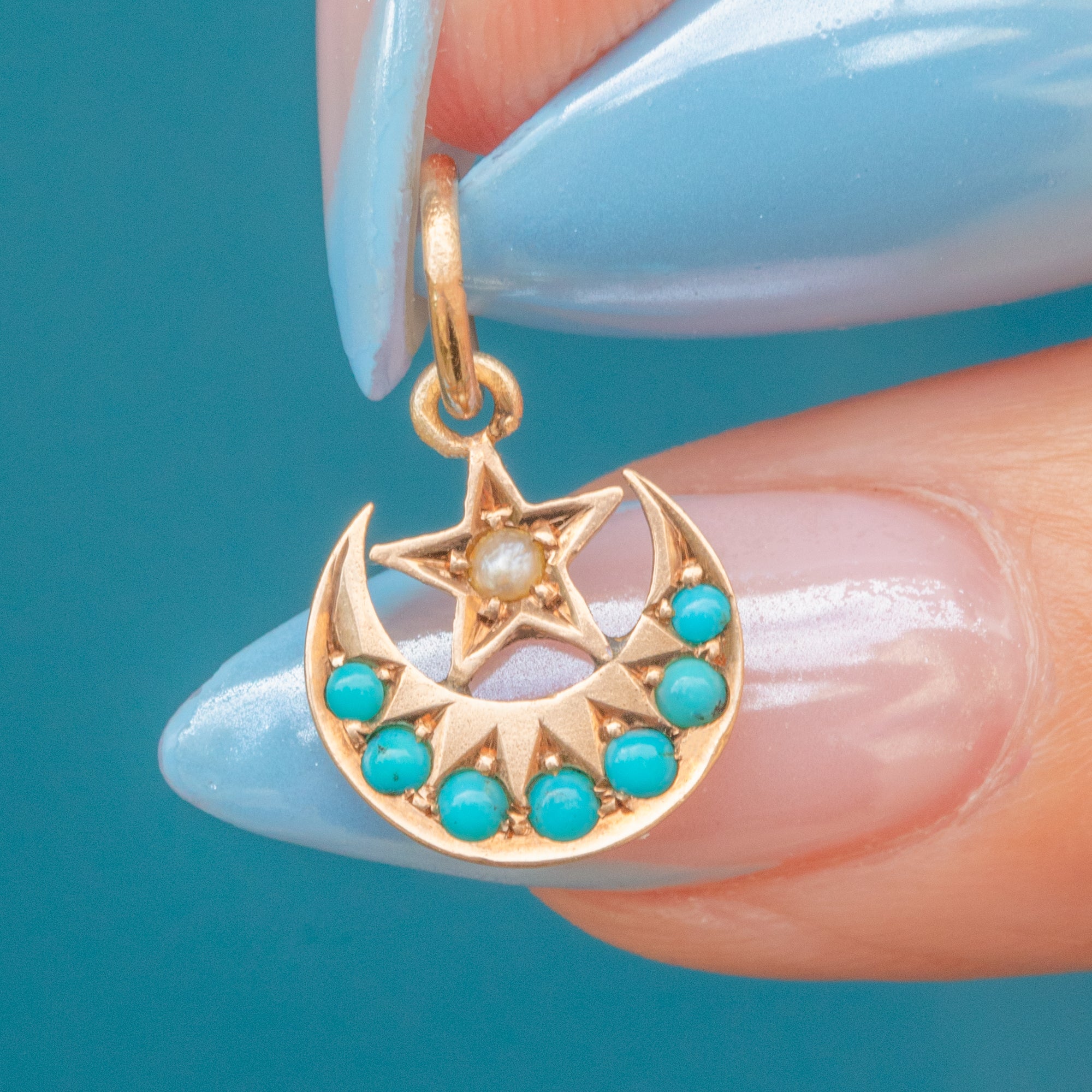 This dainty Victorian charm has been delicately crafted into a crescent moon and star, with the crescent adorned by vibrant graduating Turquoise stones.