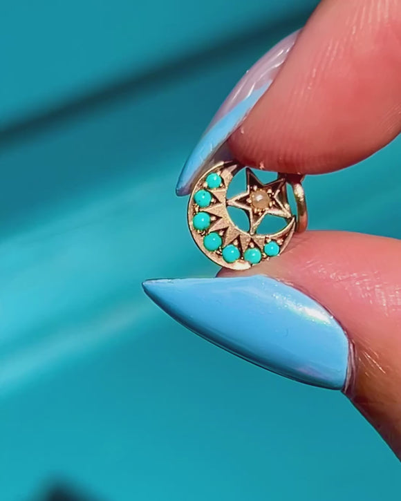 Antique 9ct Gold Turquoise Pearl Crescent Moon Charm
