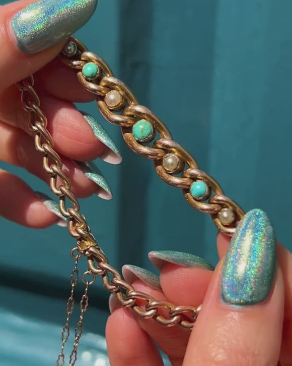 Antique 9ct Gold Turquoise Pearl Curb Link Bracelet