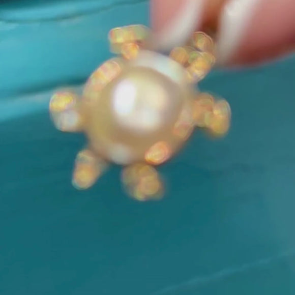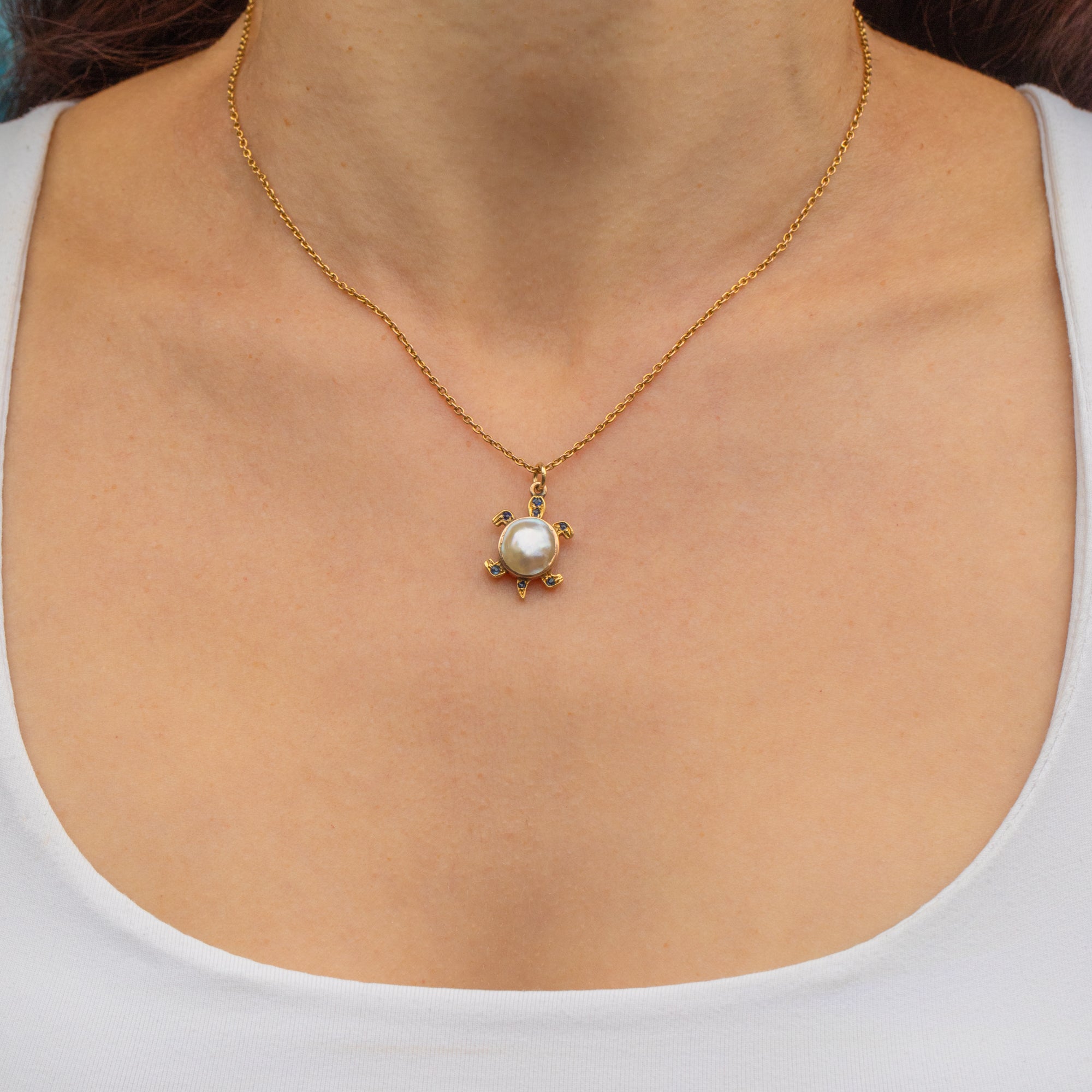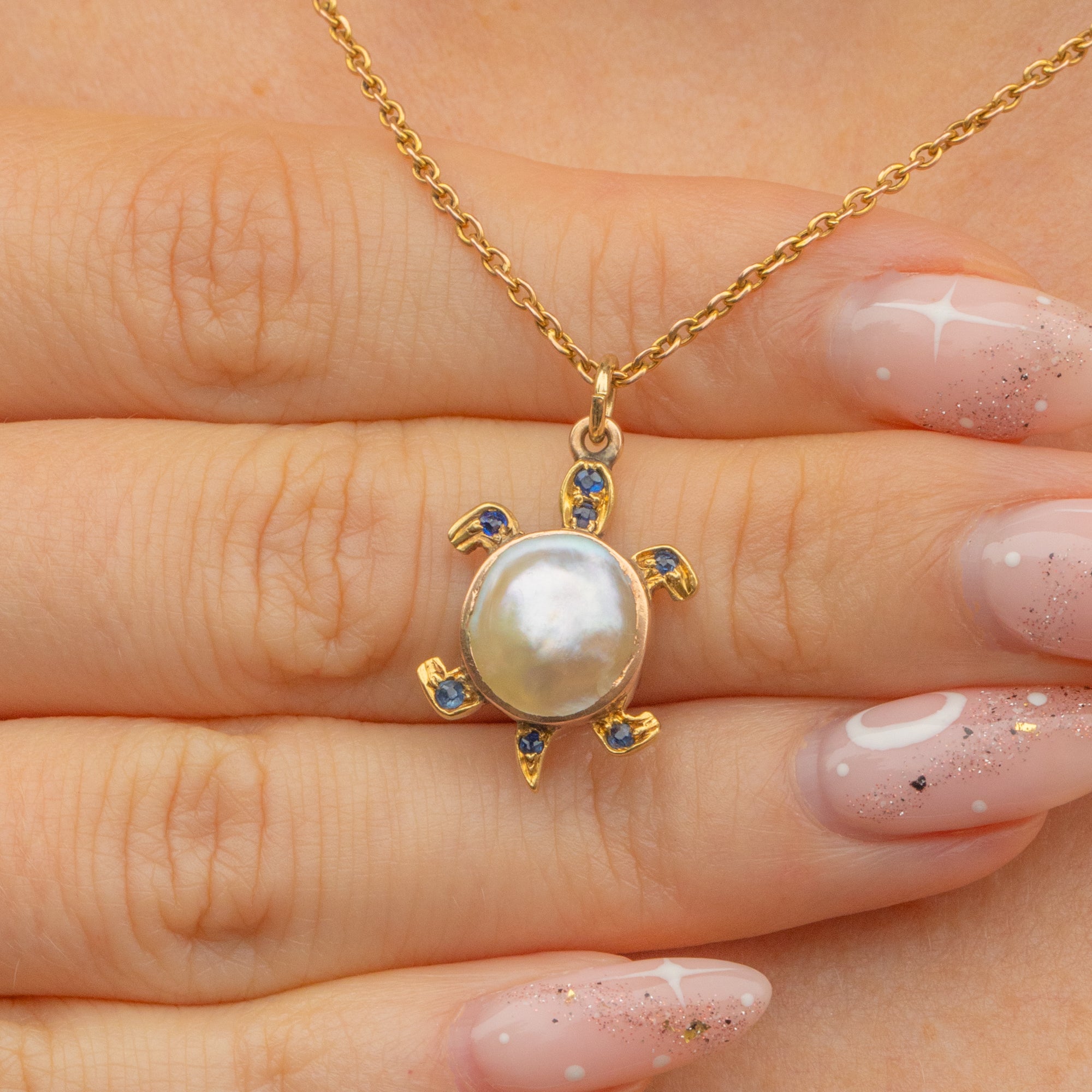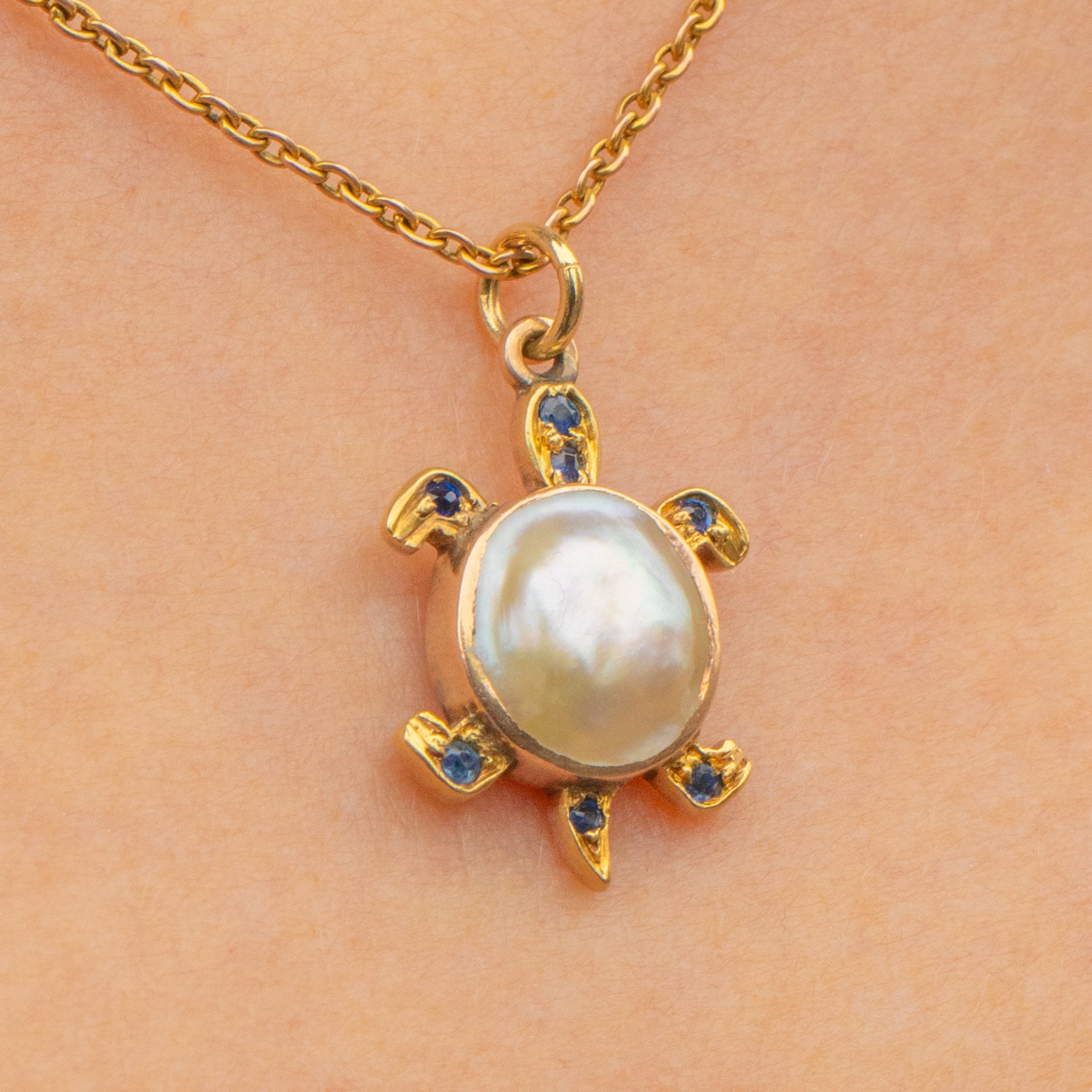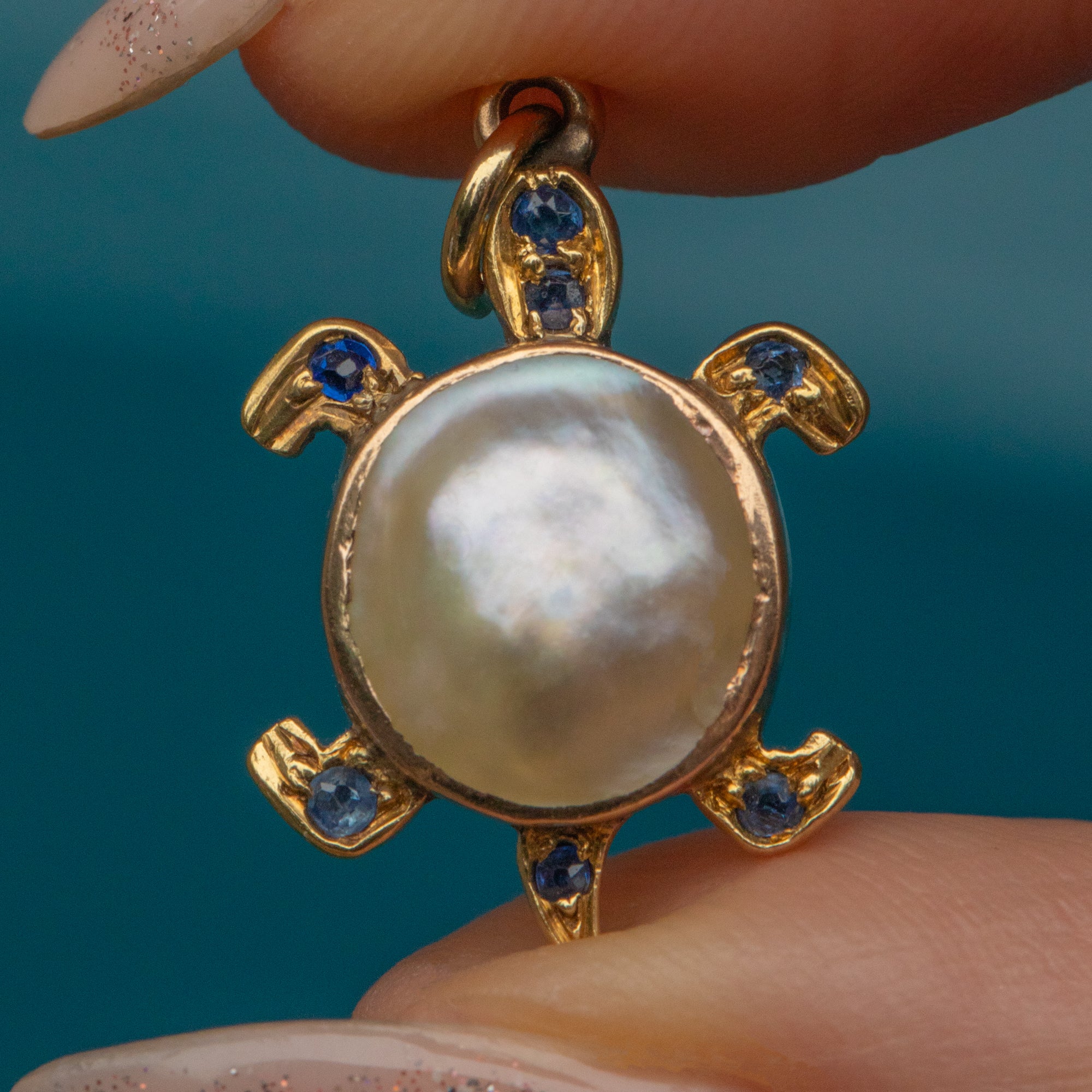 VERY GOOD. This Edwardian 9ct Gold Pearl Sapphire Turtle charm is in very good condition! The Pearl and surrounding Sapphires are all secure within their settings, with no damage to note, complimenting each other effortlessly. The pendant itself is well formed and although there are solder marks on the back of the pendant, this cannot be seen when worn. The prettiest turtle of all the oceans!