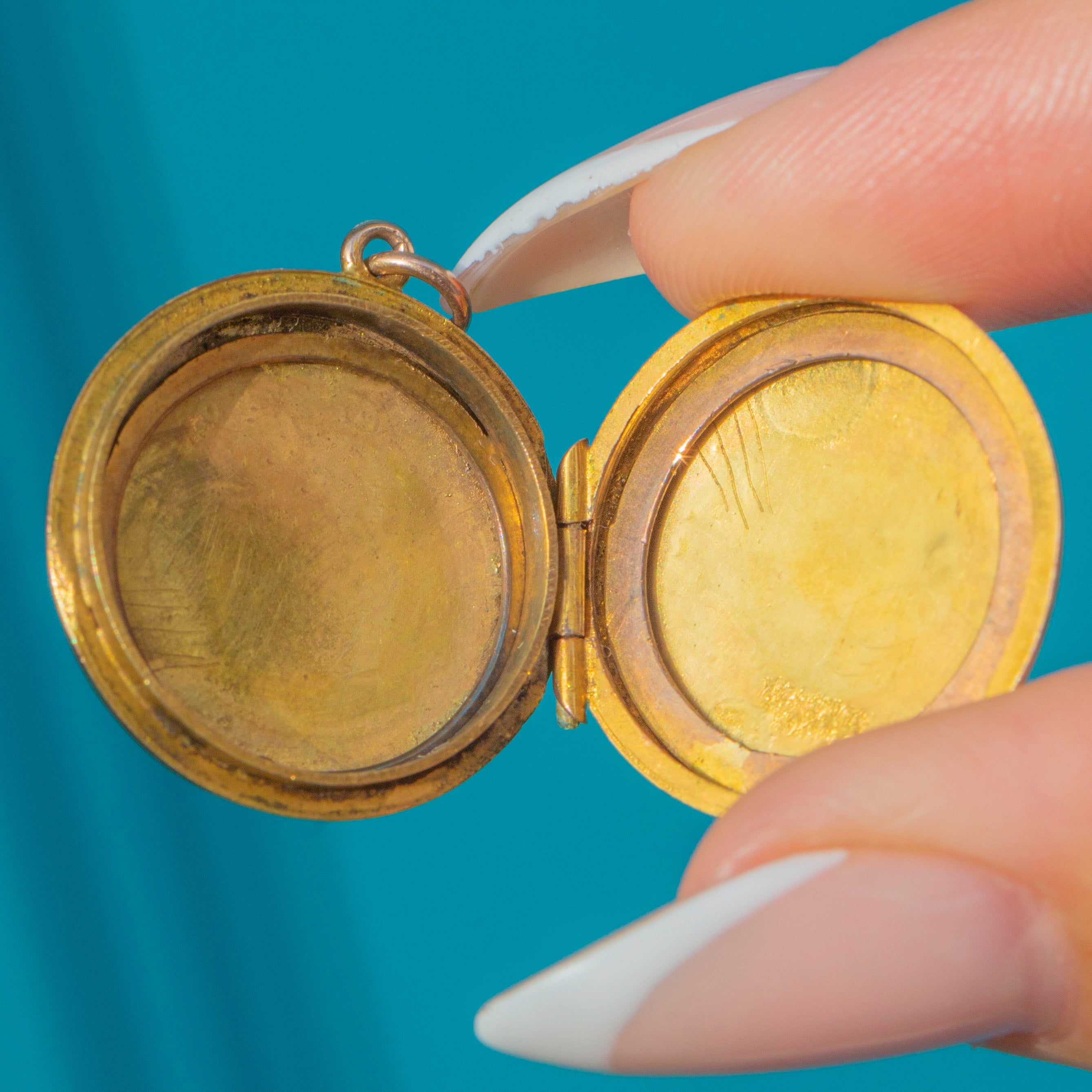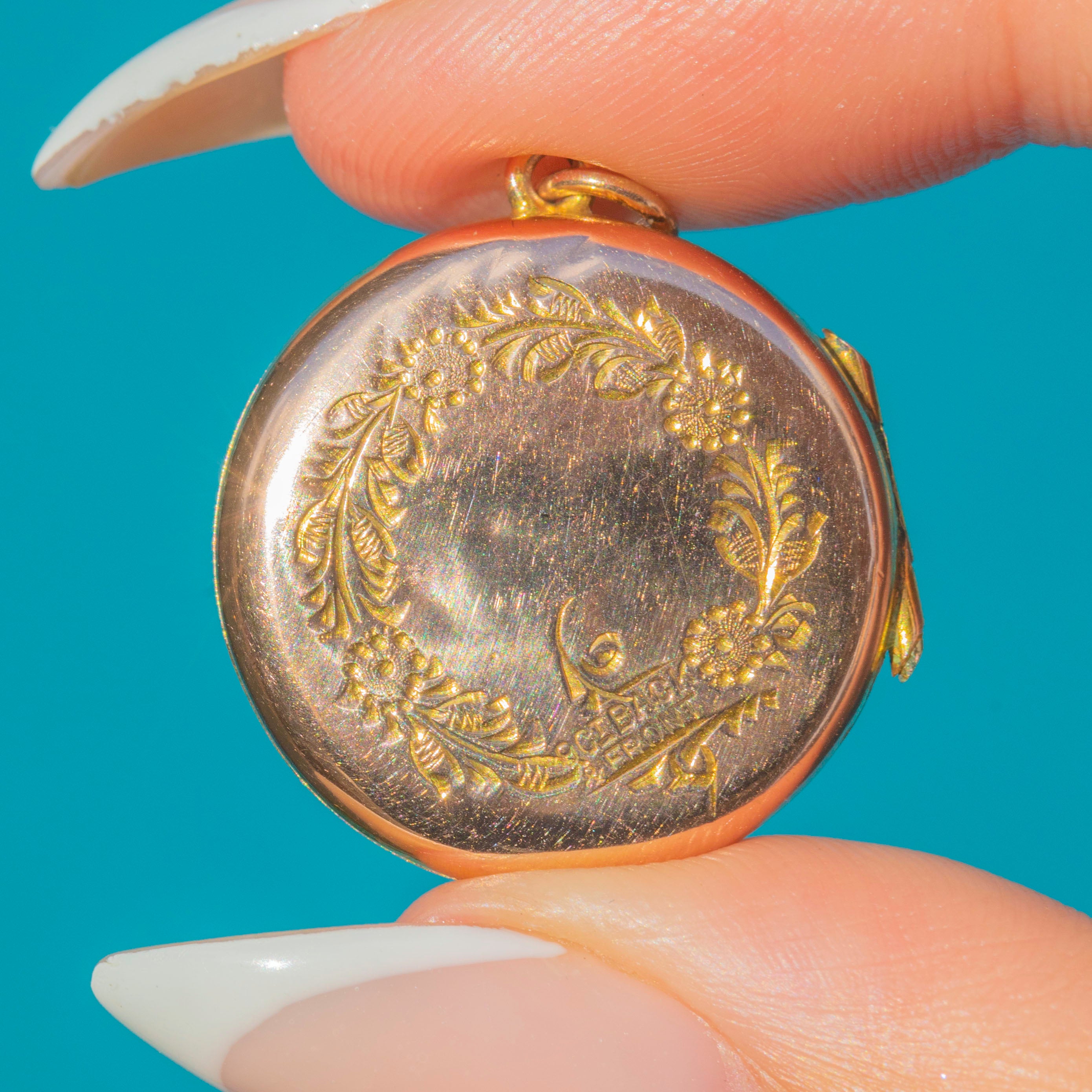 This Edwardian locket is crafted in 9ct Gold and adorned with a beautiful embossed floral wreath to the front. The circular design opens to reveal two internal frames, perfect for holding treasured photographs or mementos.