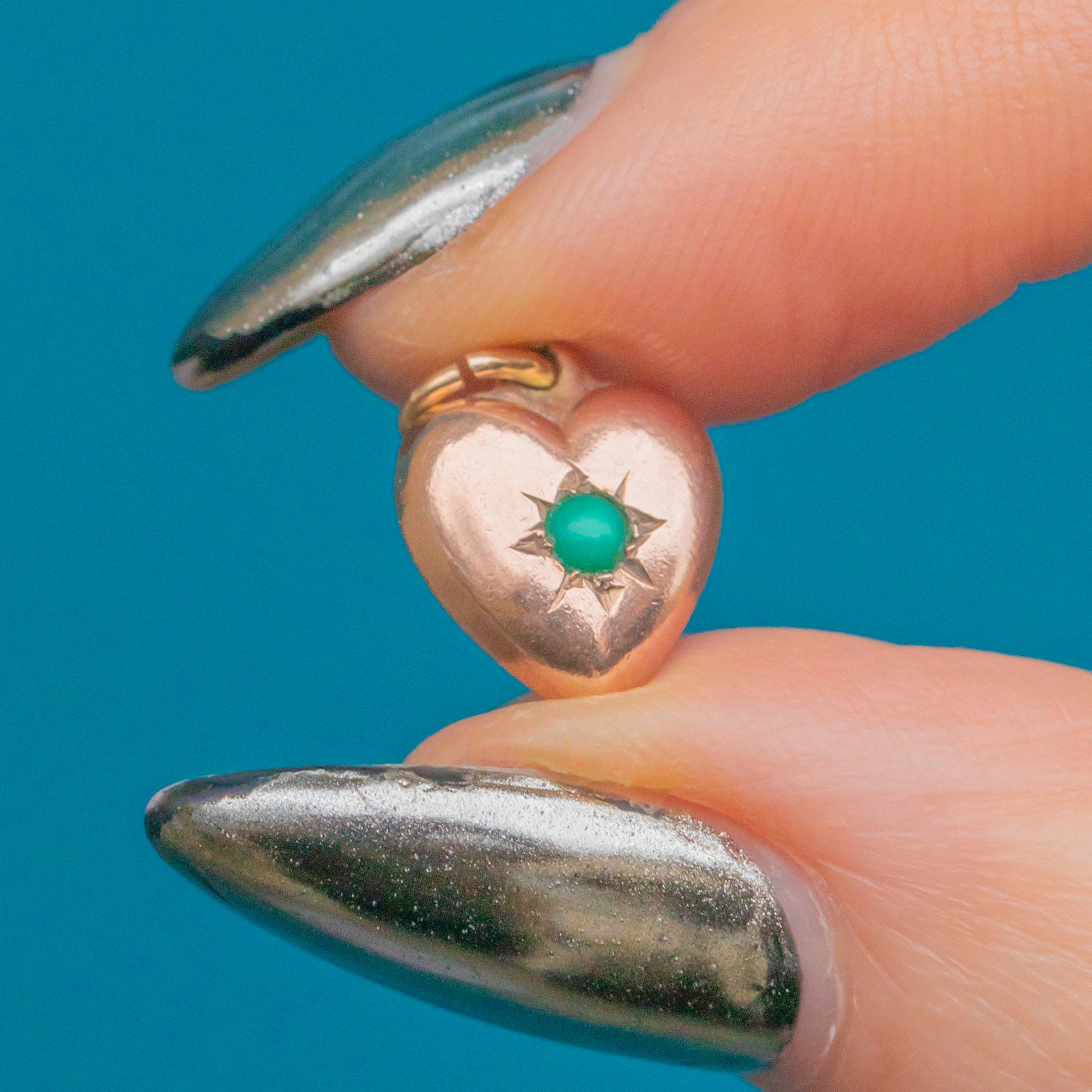 This antique 9ct Gold Turquoise puffy heart charm is a dainty delight and ready to be added to your neck stack! Her verdant Turquoise sits poised at the centre, beaming within her star setting, adding a lovely accent of colour and celestial charm.