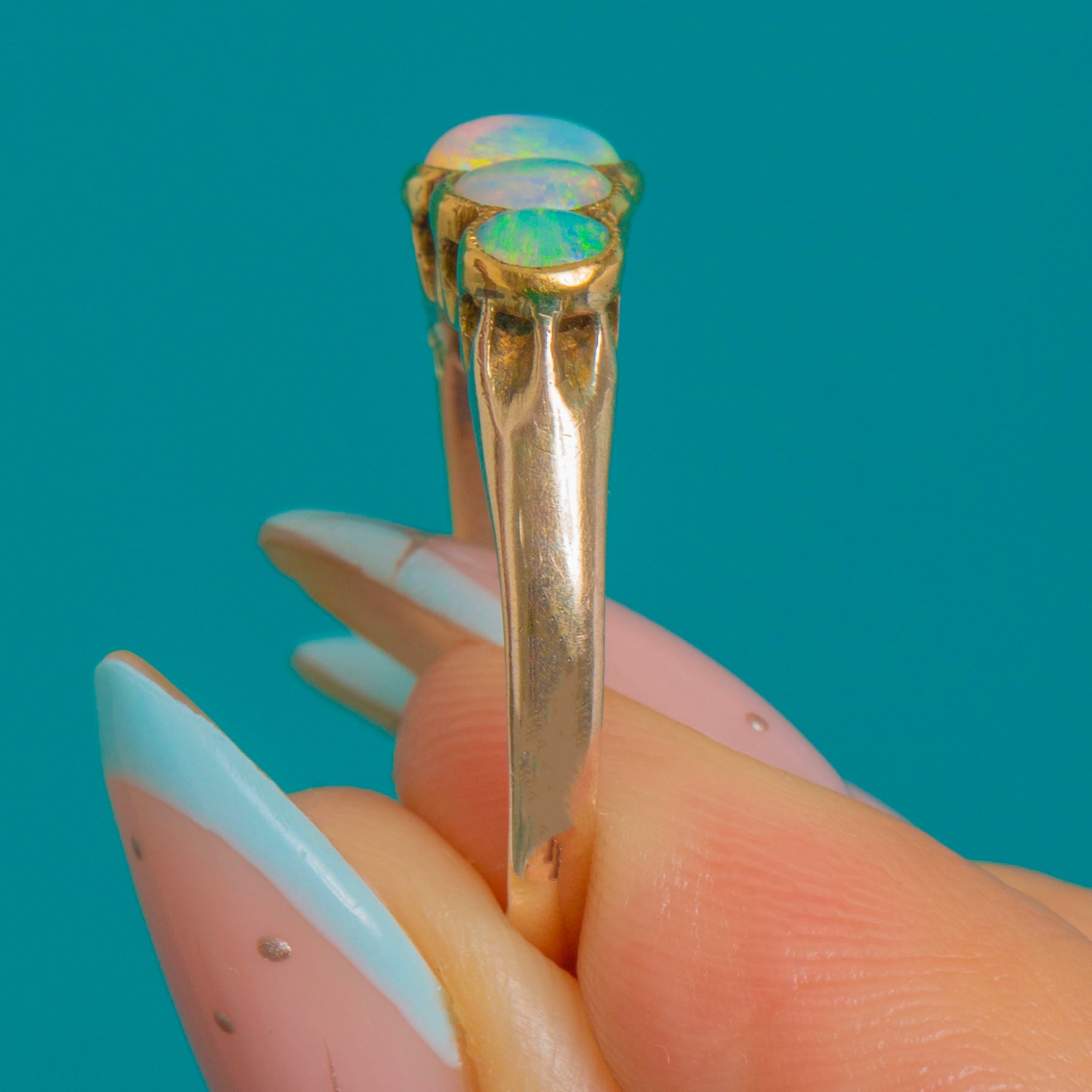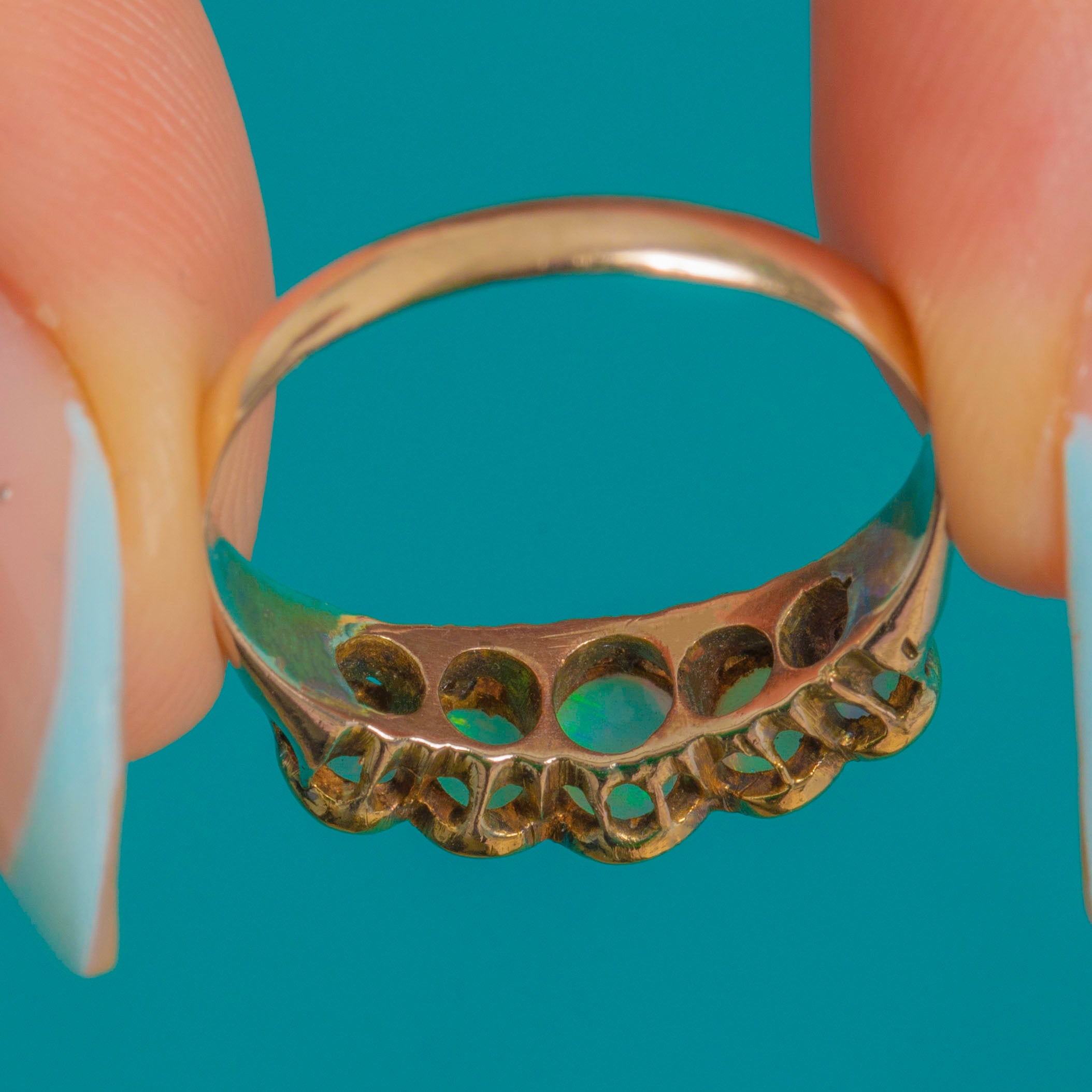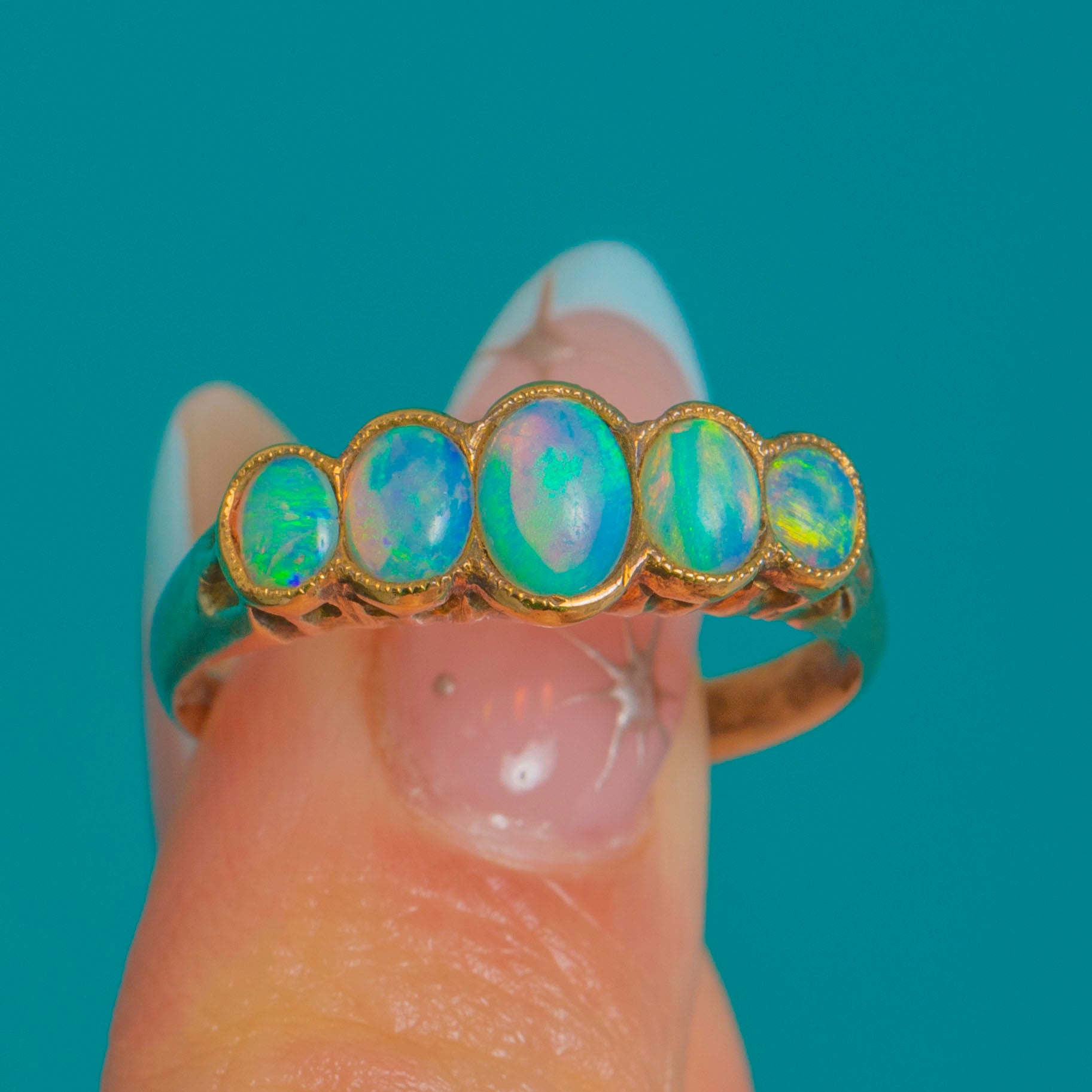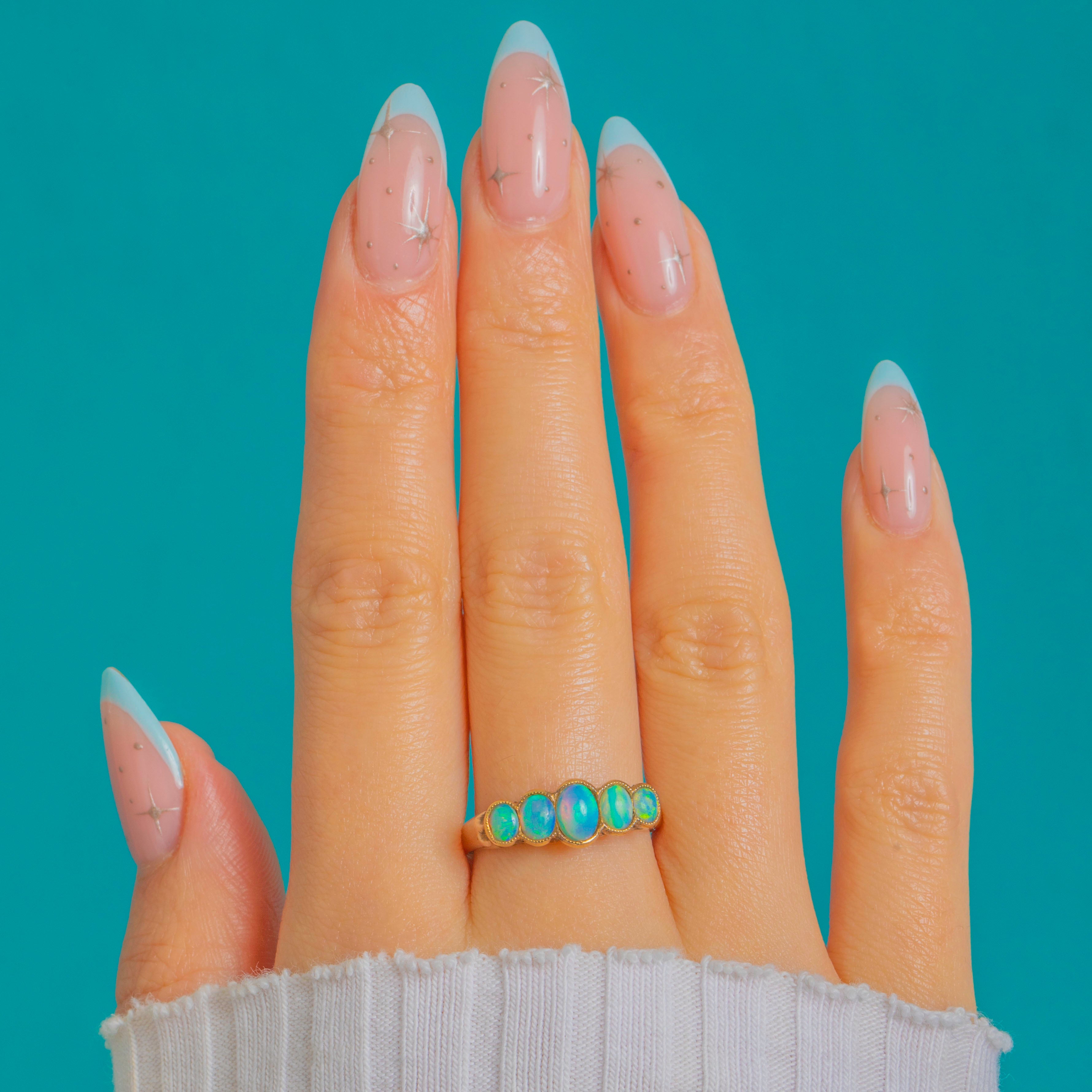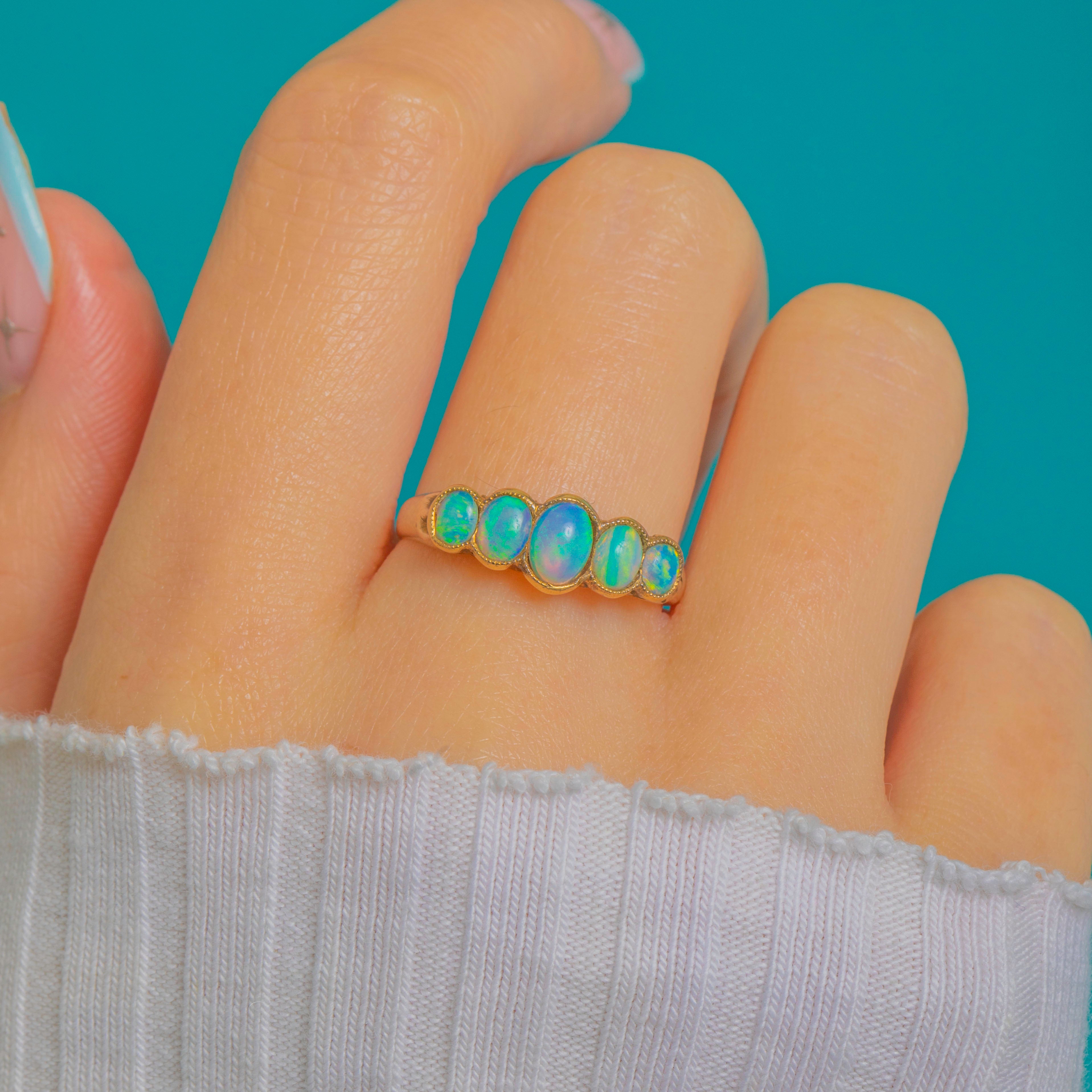 A luminous Art Deco five-stone Opal ring in 9ct Gold, set with graduated oval cabochons that glow with vivid blue-green play-of-colour and flashes of aqua, pink, yellow and orange. Each Opal is embraced by a fine milgrain bezel, joining to form a graceful scalloped half-hoop.