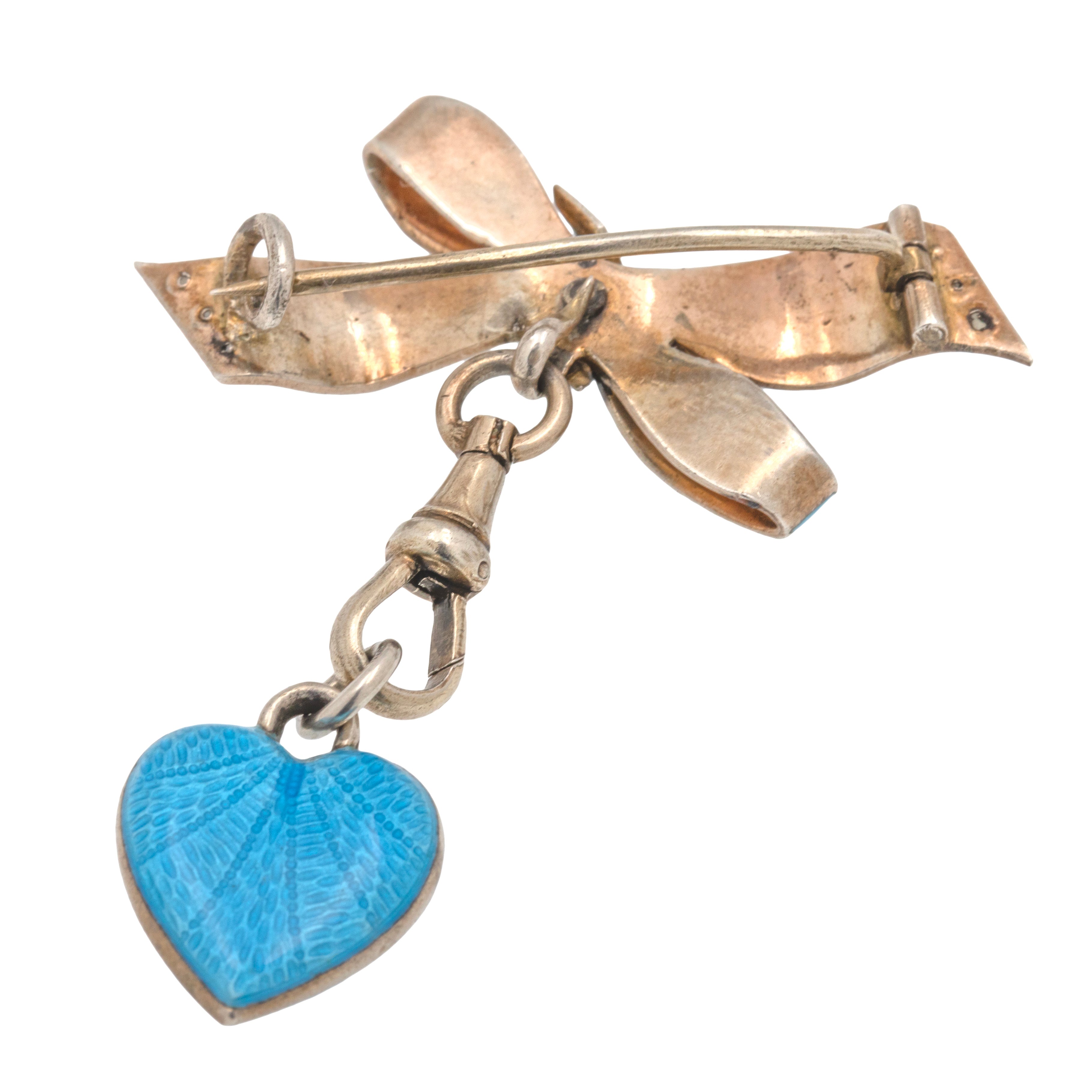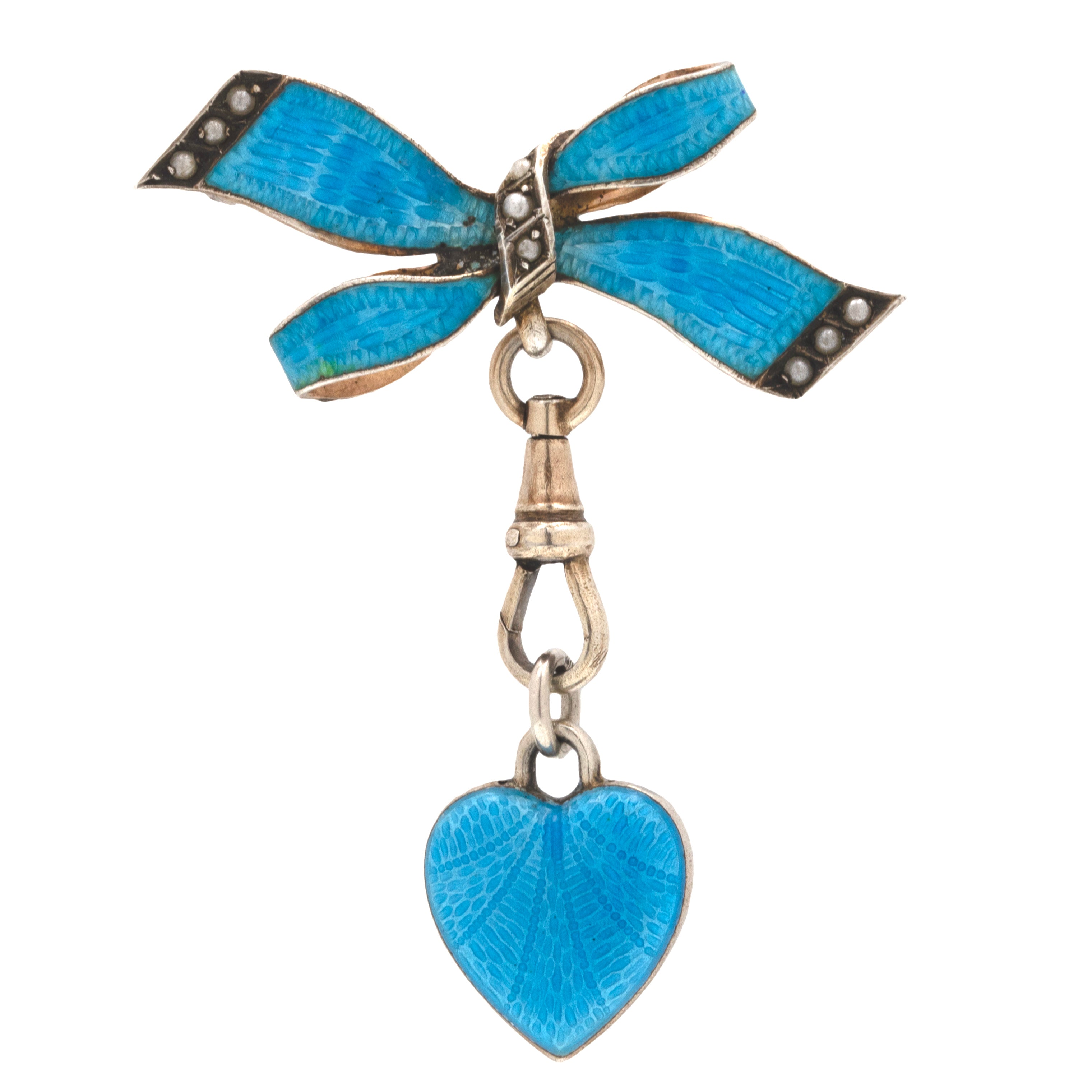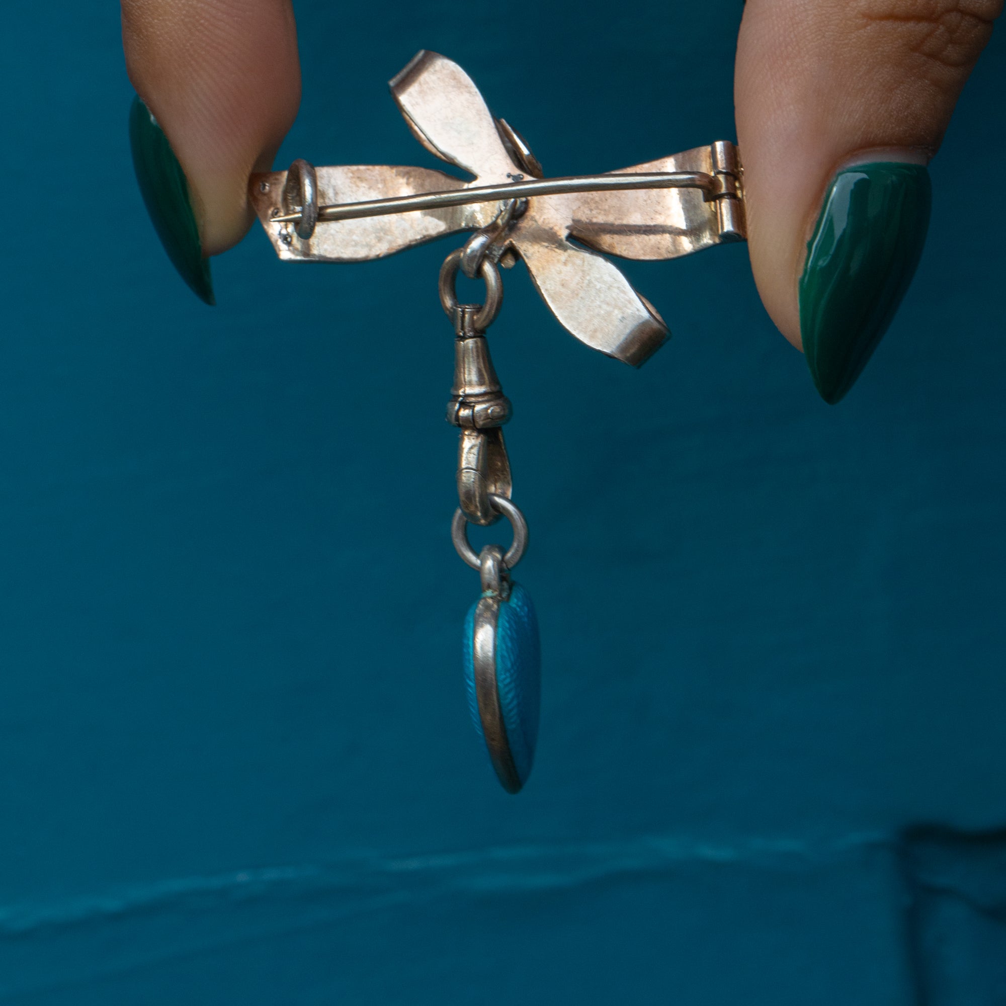 アンティーク ブルーエナメル パール ブローチ、ブルーエナメル ハートドロップ付き