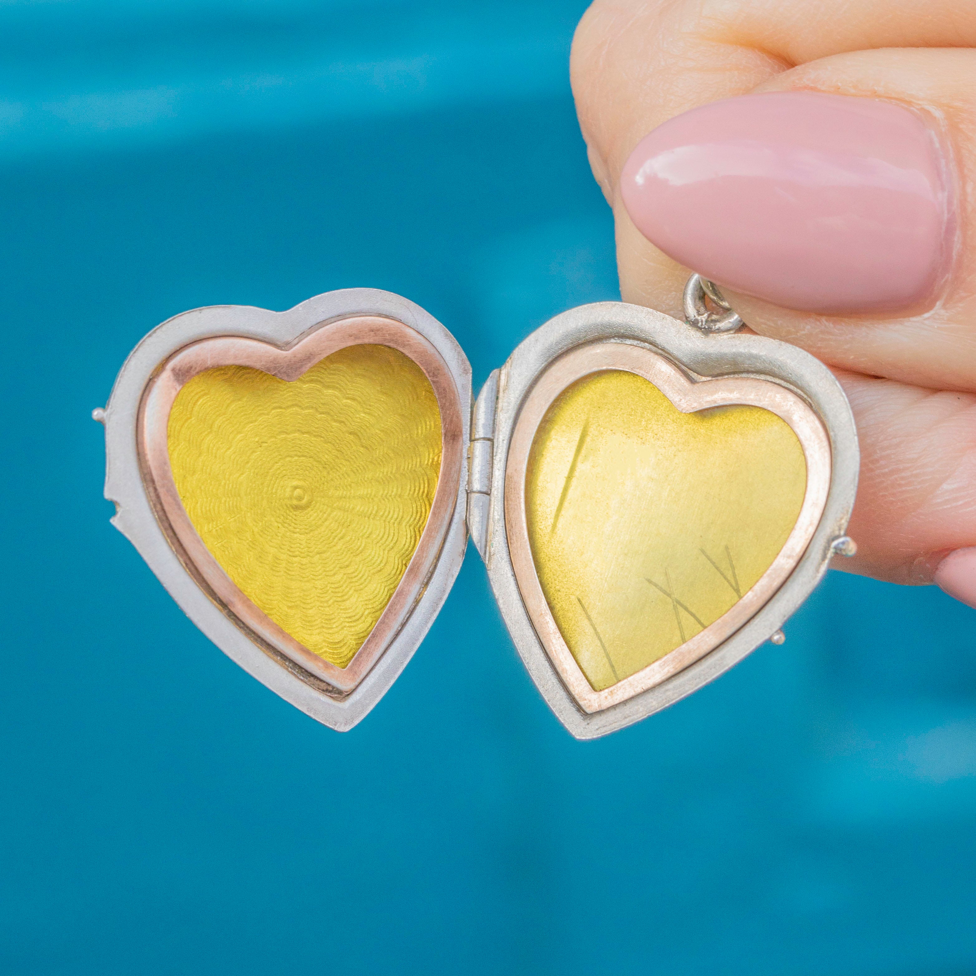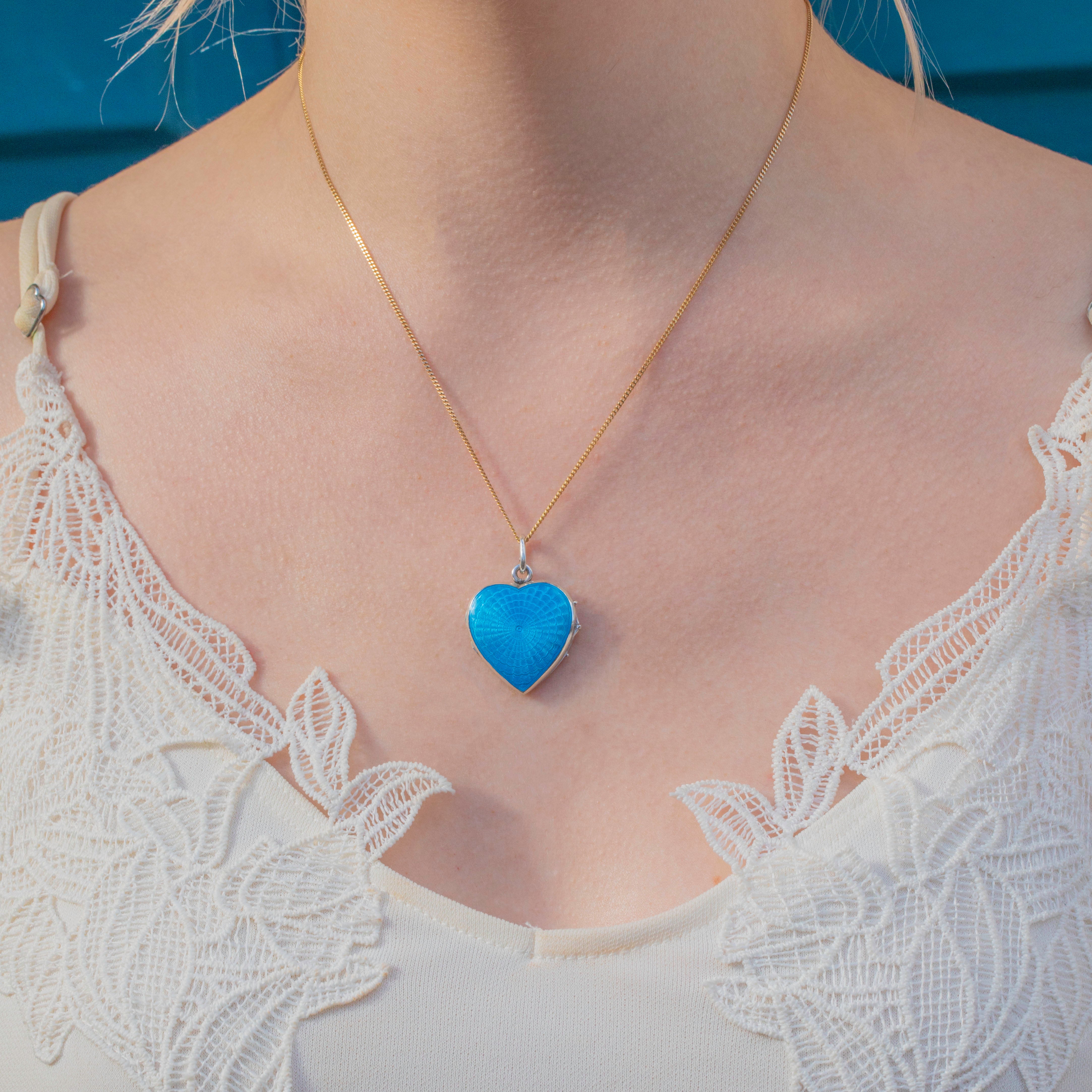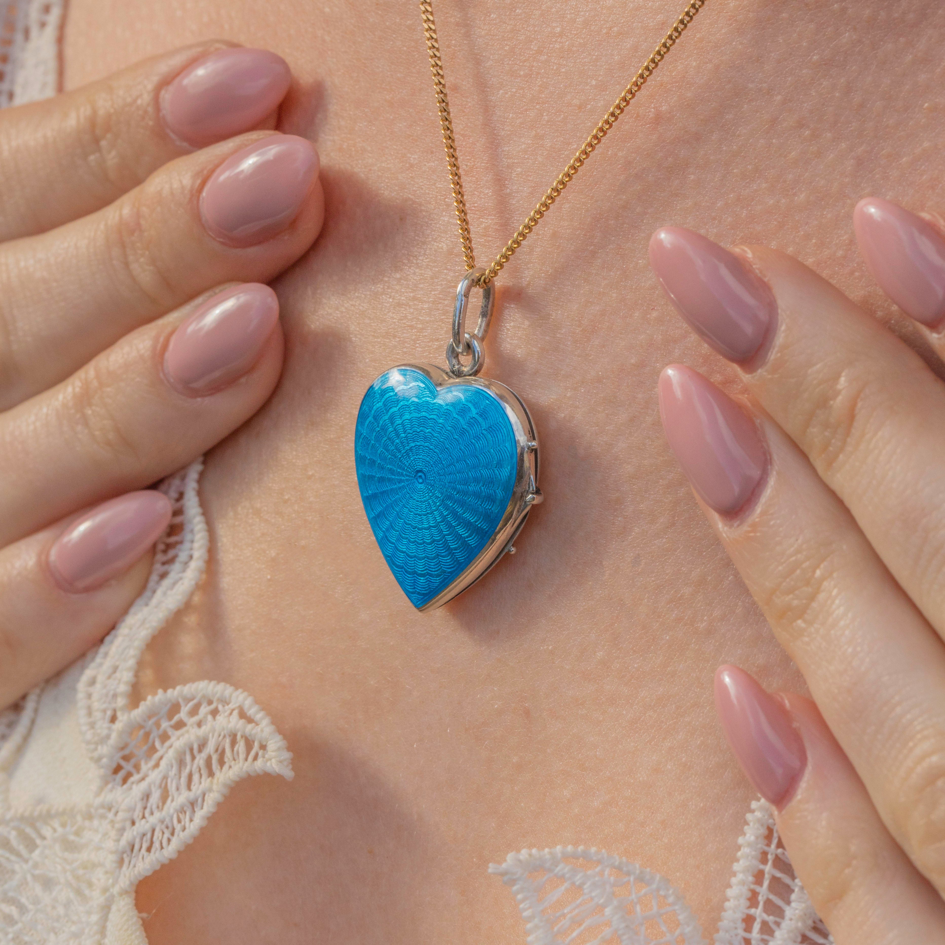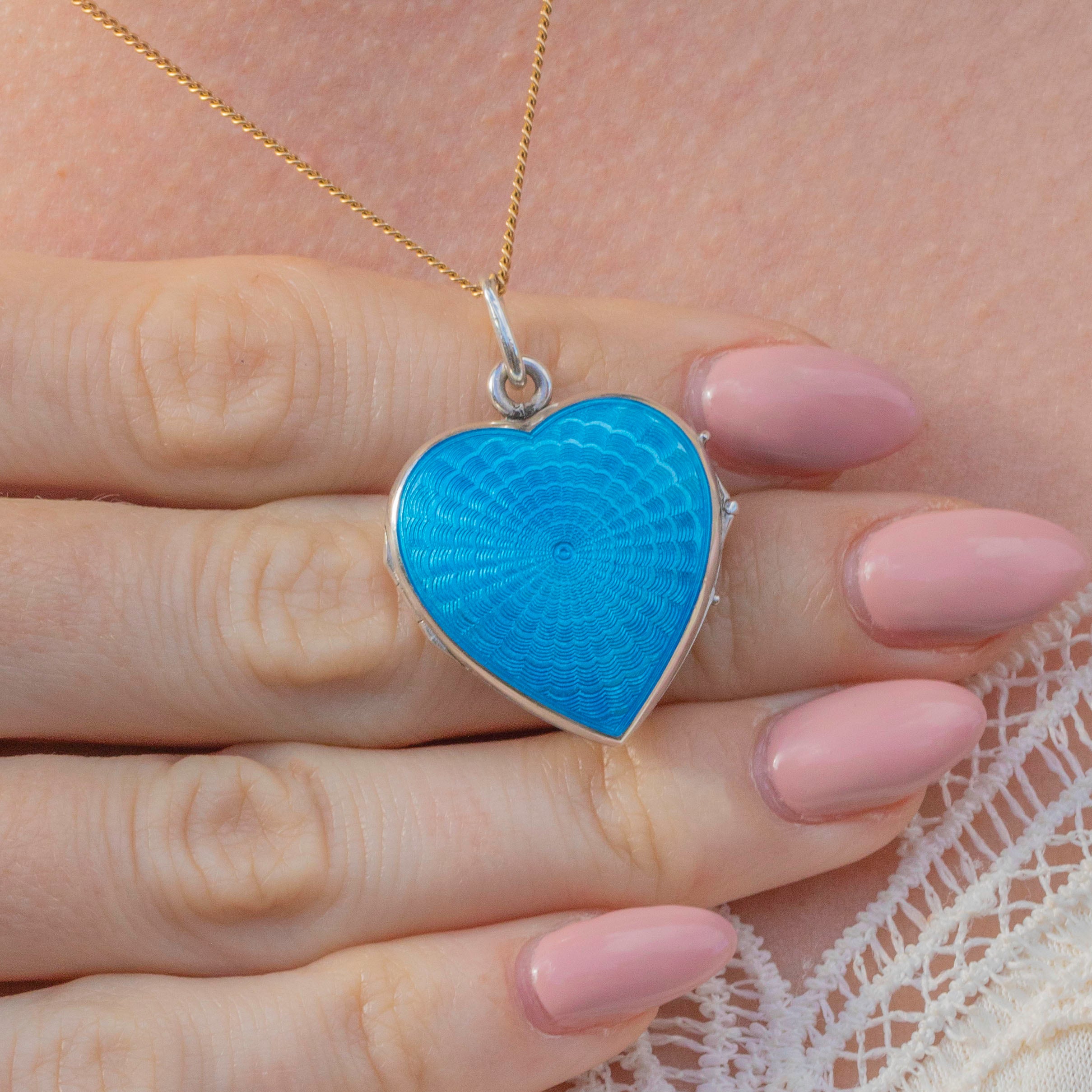 This antique Blue Guilloché enamel heart locket perfectly captures the exquisite craftsmanship of the Art Nouveau era! Bold and steeped in romantic sentiment, this antique heart locket is adorned with vibrant sky blue Guilloché enamel that shimmers in the light.