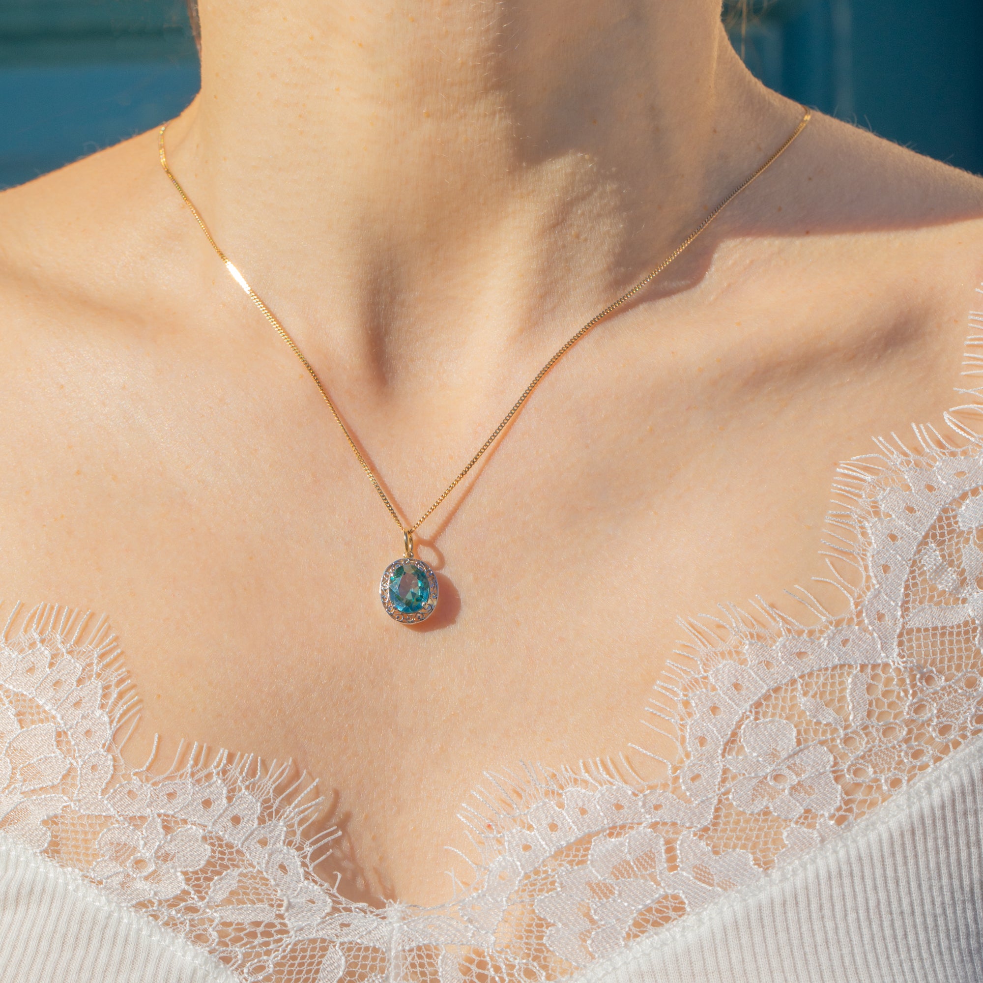 In her centre sits a 2.60ct blue Zircon, faceted wonderfully and radiating cool azure hues as she catches the light. She is steeped in antique charm, with an ornate Silver setting, providing a lovely depth and texture to this pendant.