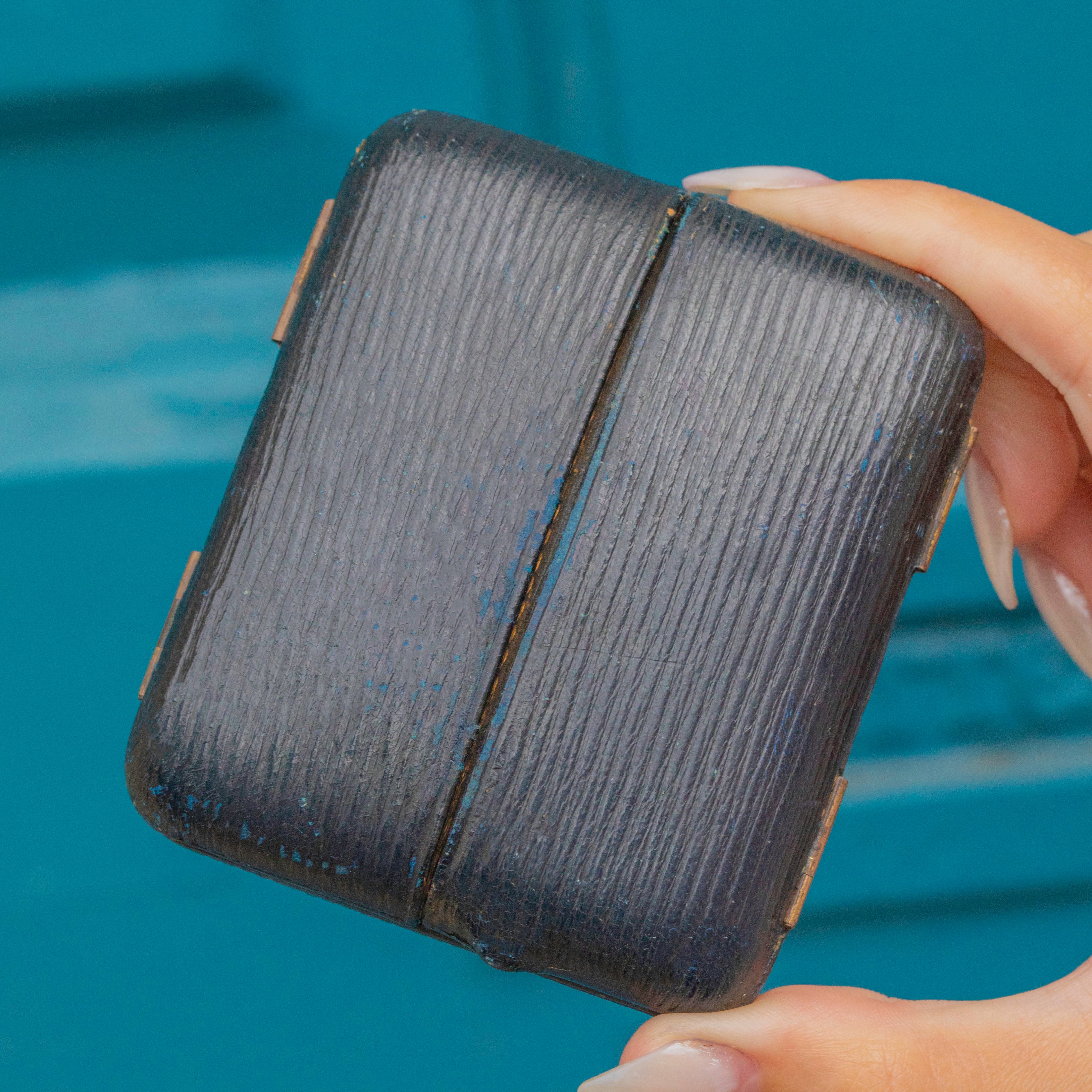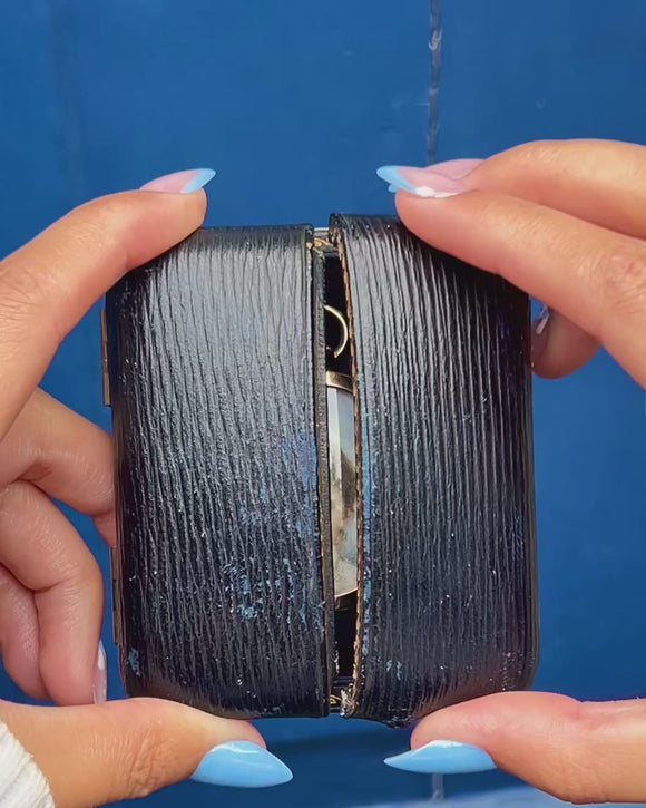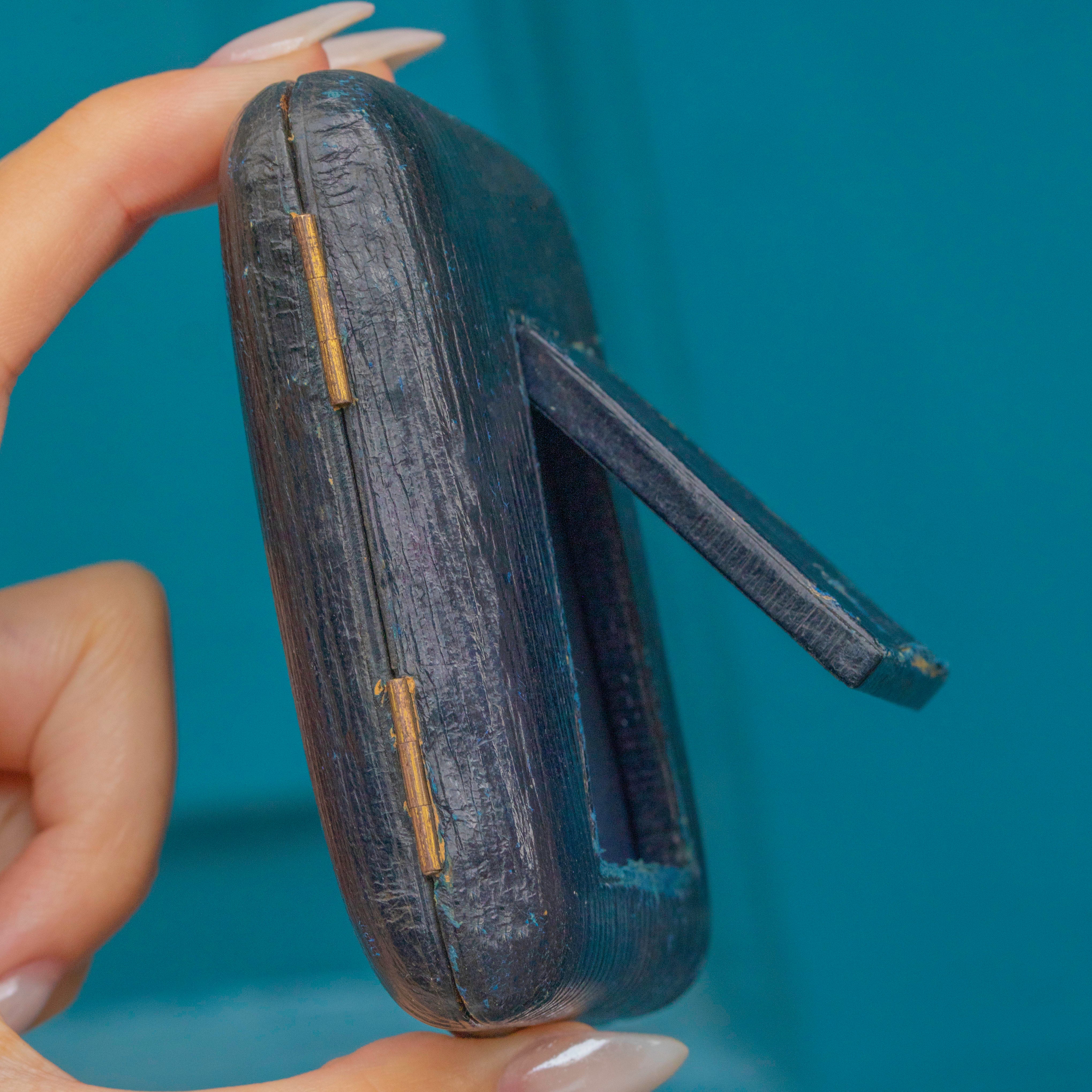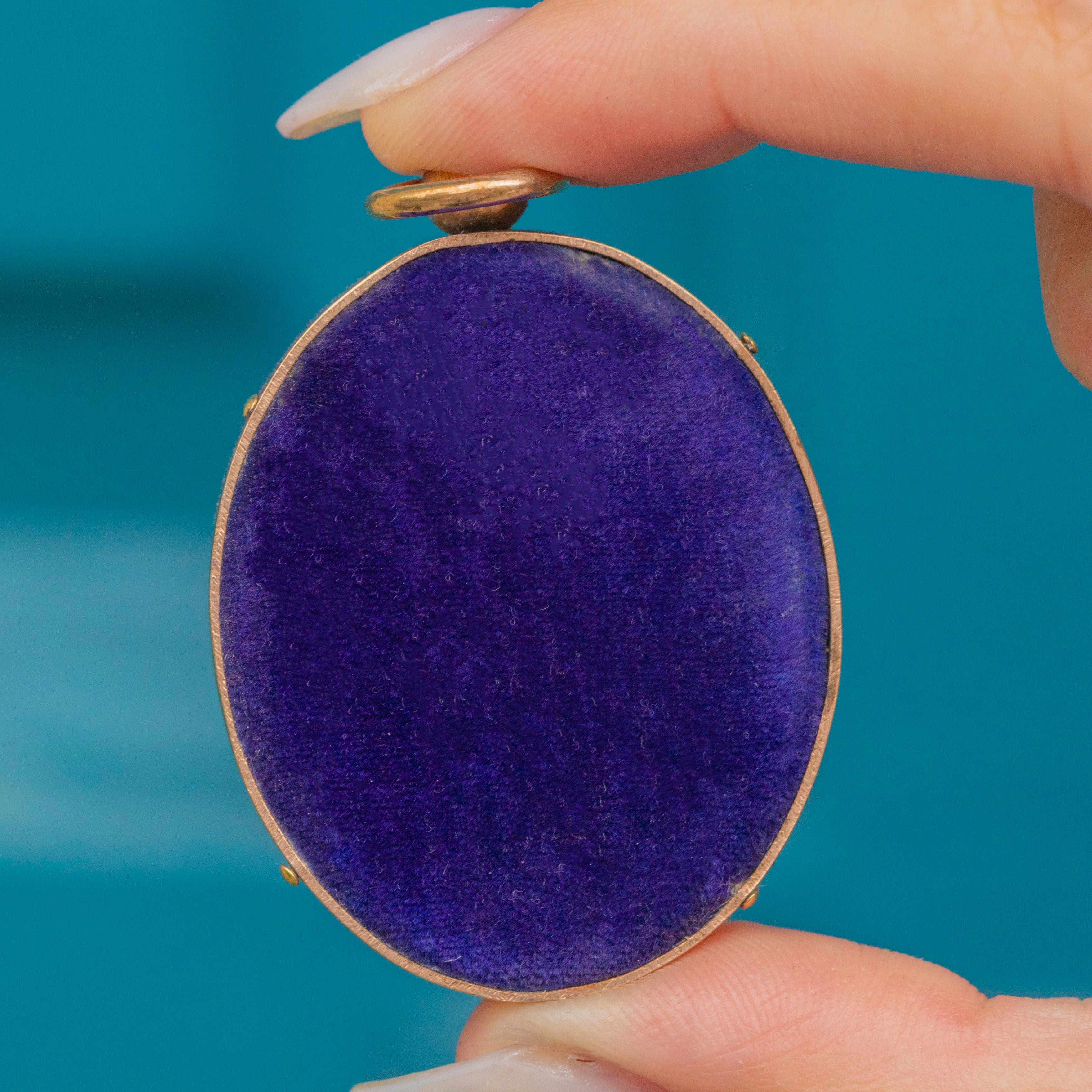 This Edwardian locket is a wonderful way to connect to a bygone era, sitting snug in its original fitted box, with a navy blue faux leather exterior and a royal purple velvet interior.