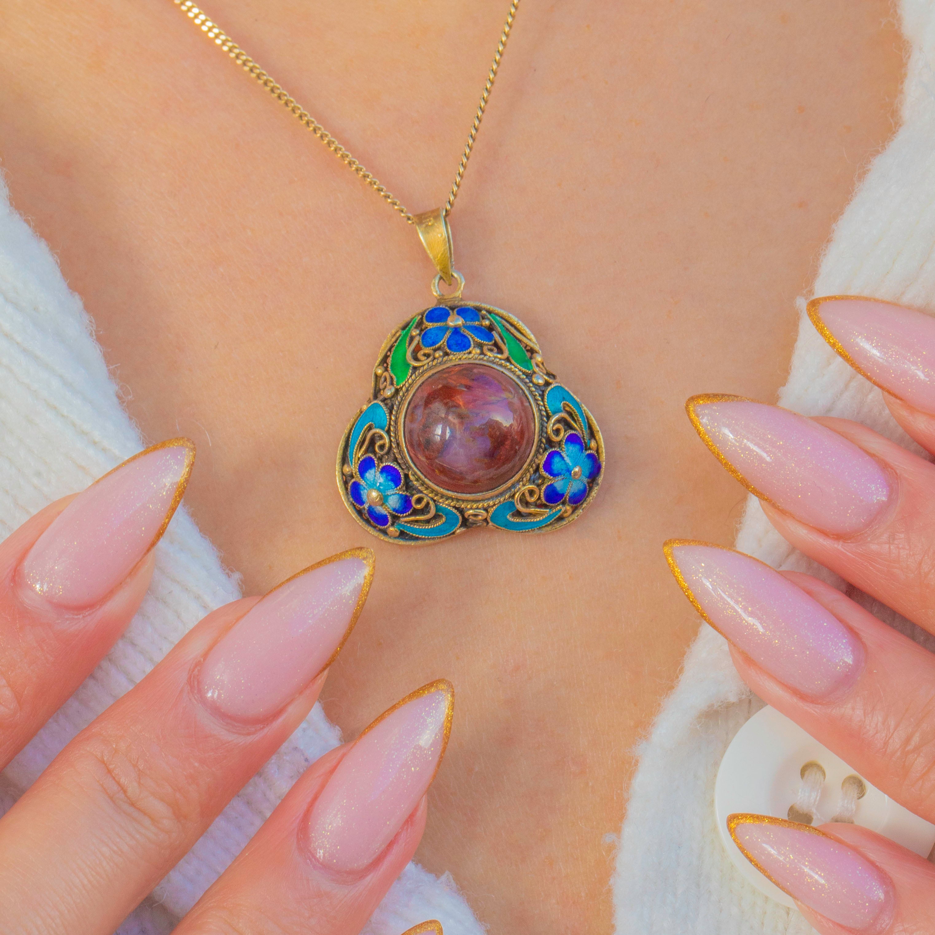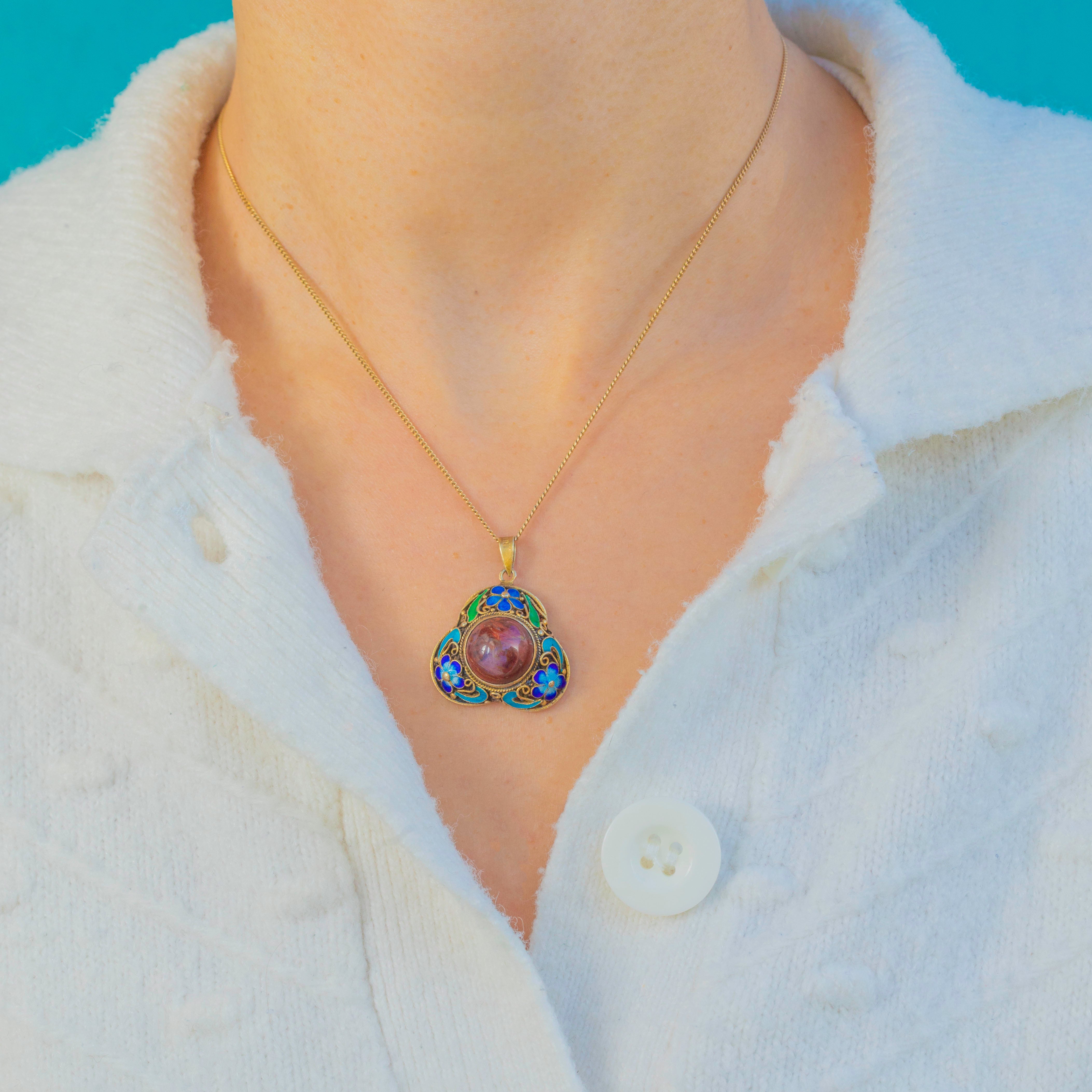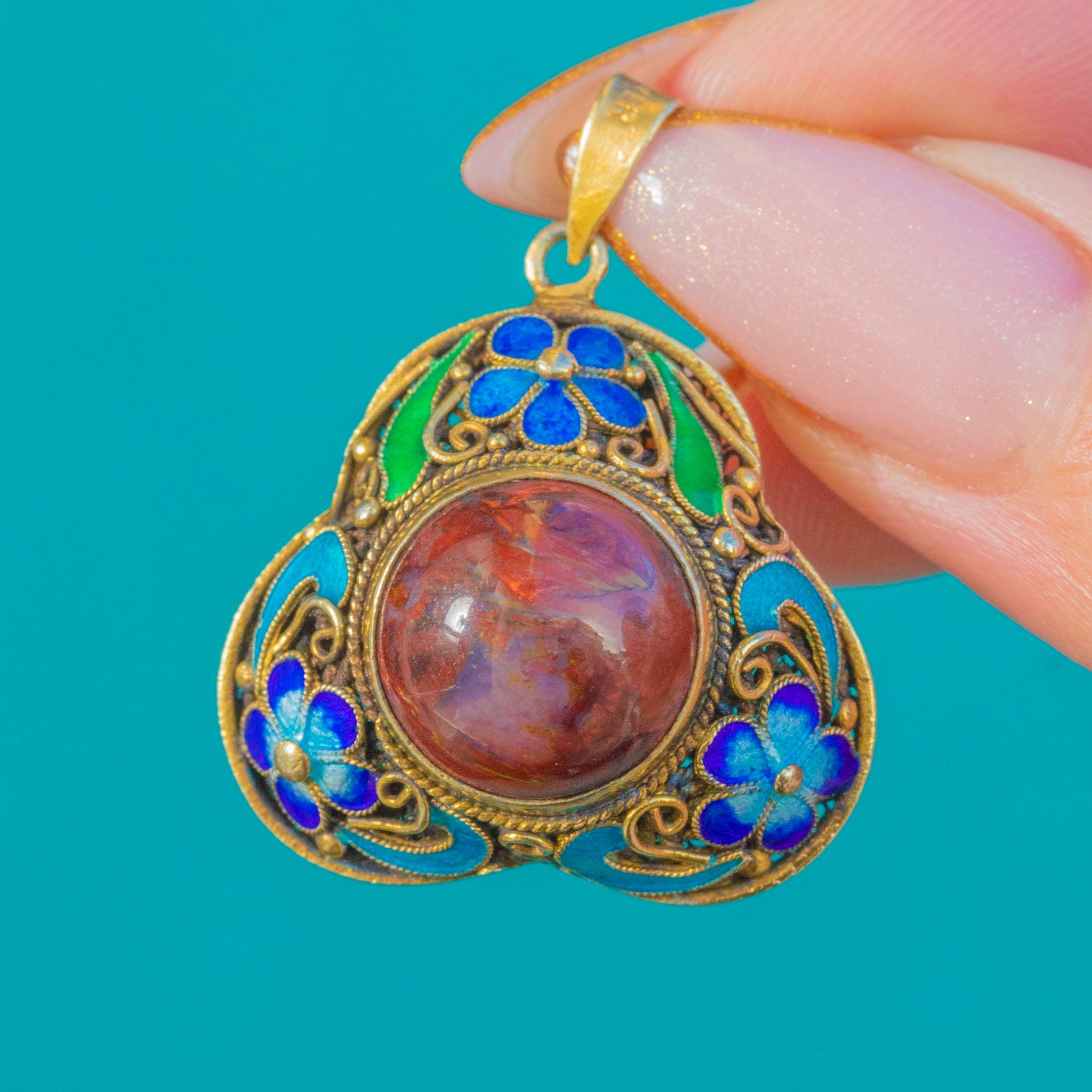 アンティーク中国七宝焼ペンダント、赤い北京ガラスカボション