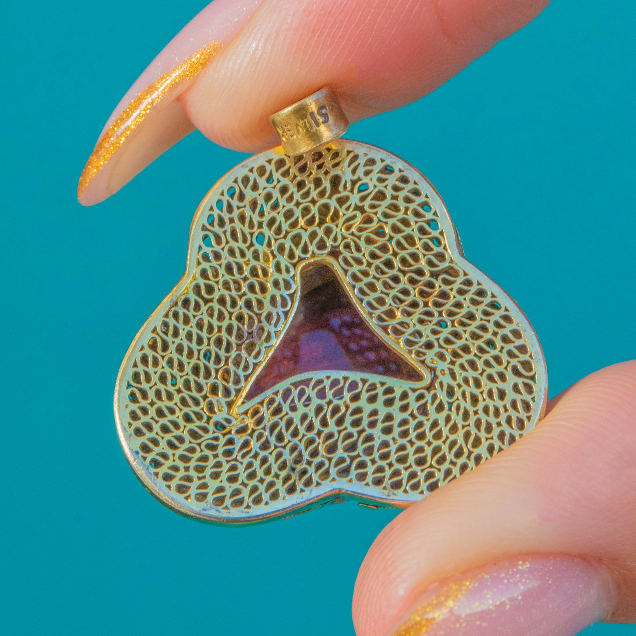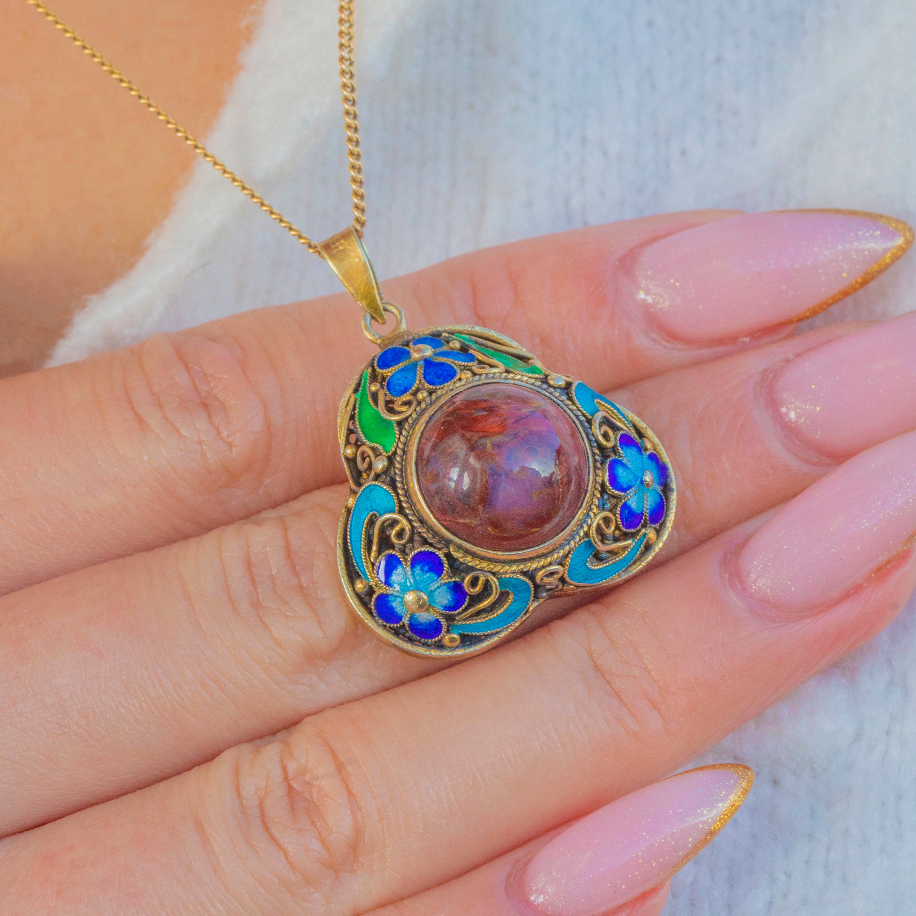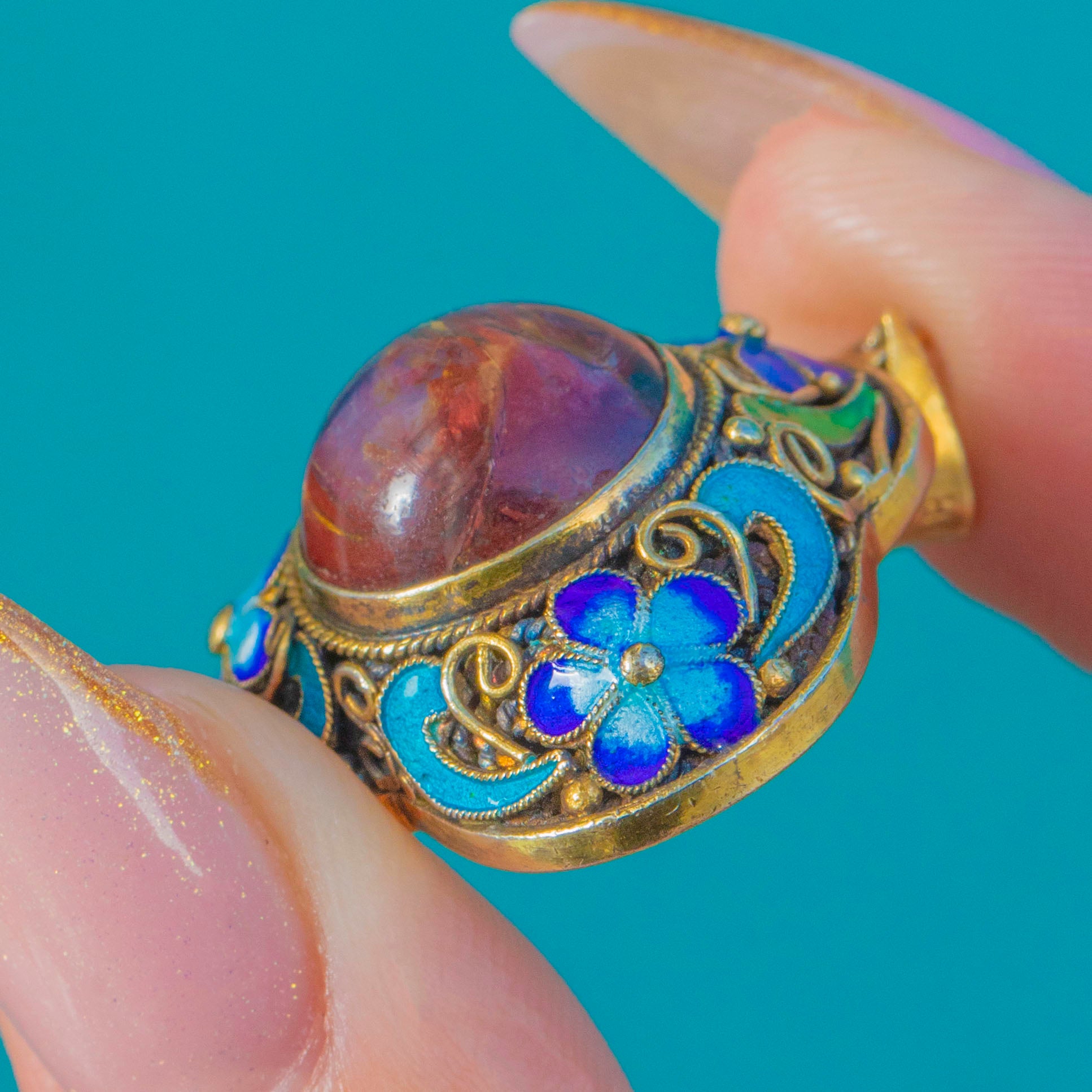 アンティーク中国七宝焼ペンダント、赤い北京ガラスカボション