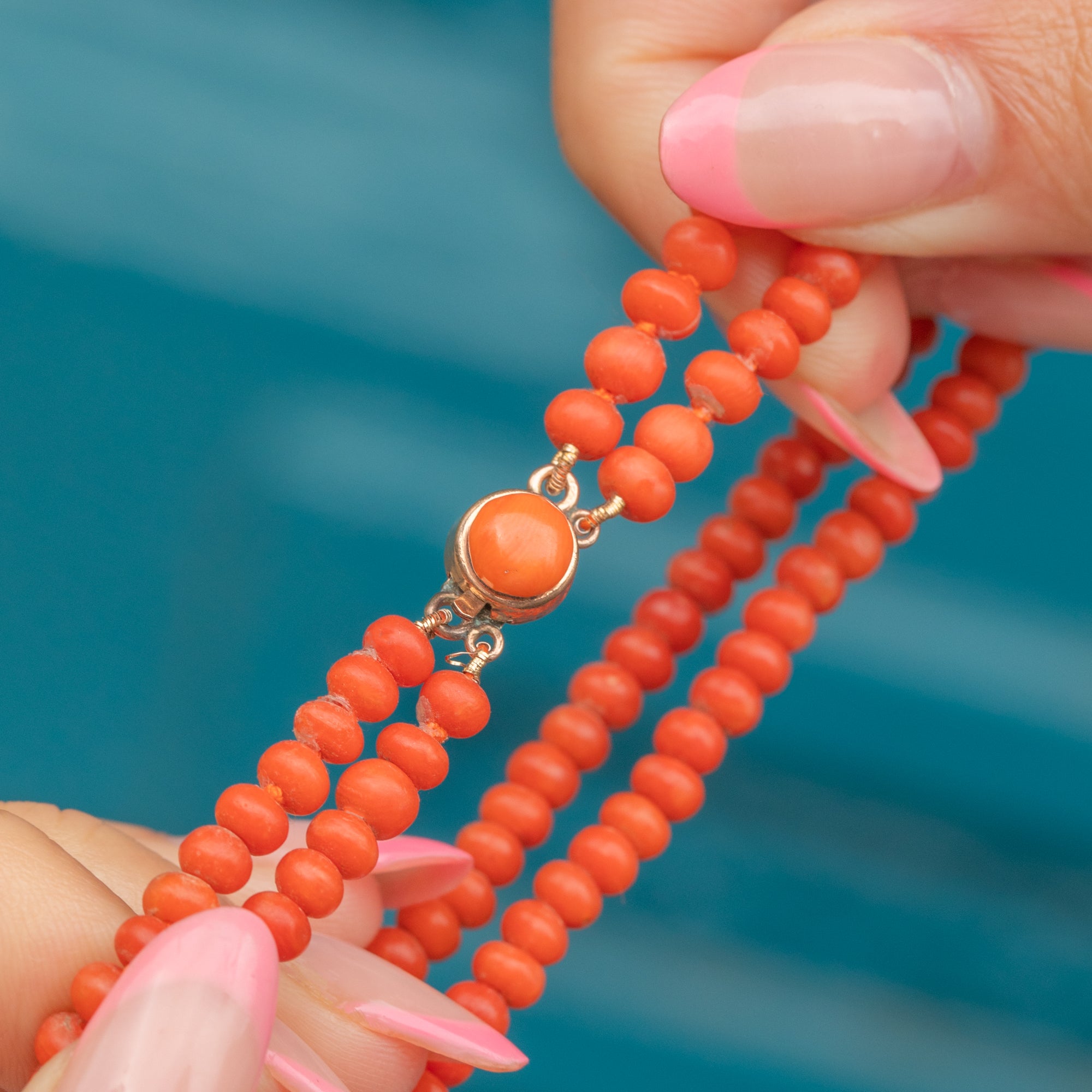 This antique Coral beaded bracelet is a scrumptions piece of wrist candy! The two rows of Coral beads provide wonderful coverage and drape elegantly around the wrist.