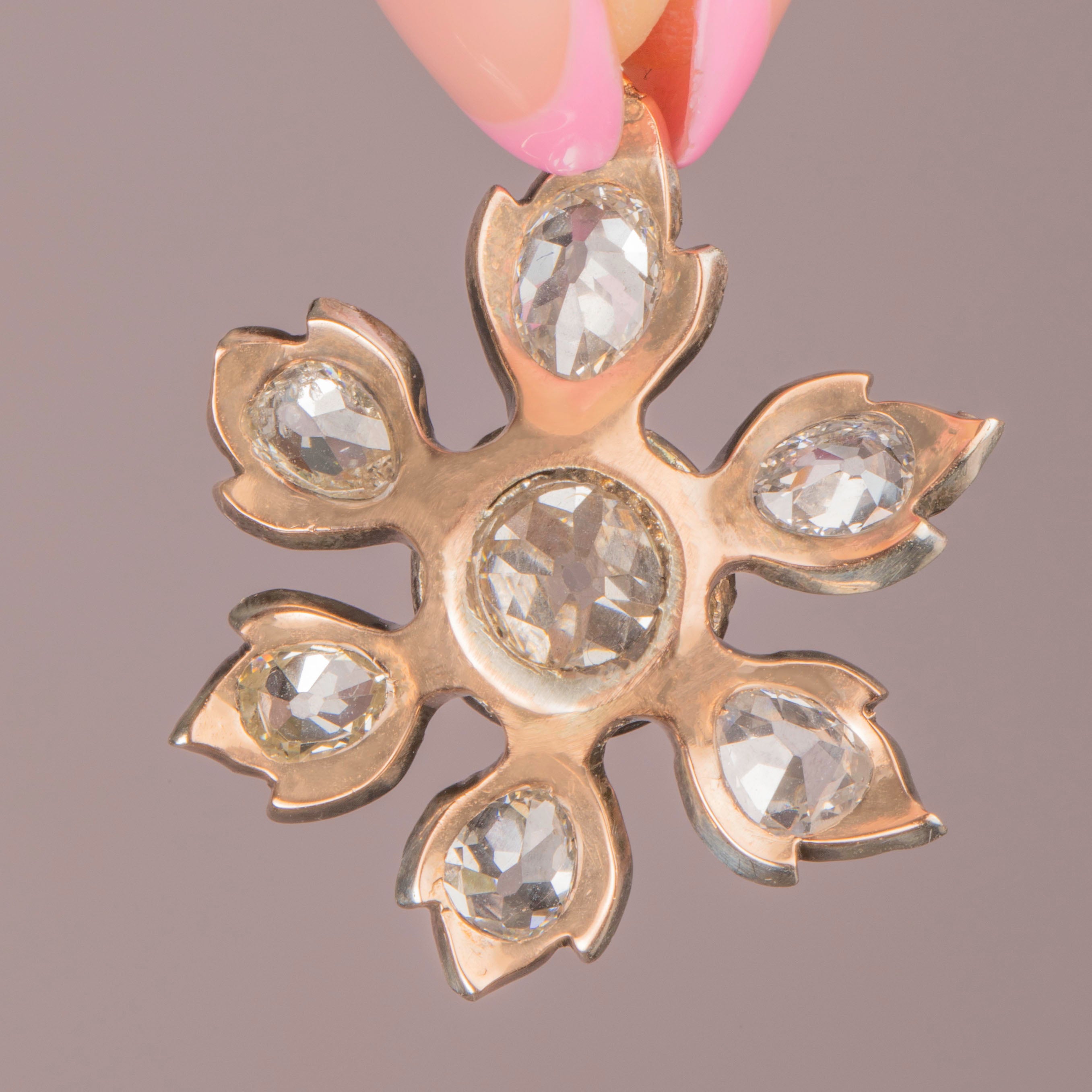 Each of her six petals are inlaid with rare antique pear cut Diamonds, giving this antique Diamond pendant a total approximate carat weight of 2.40ct. The unmissable glistens that dance between the hand-cut facets will brighten up the day of anyone lucky enough to lay eyes on her.