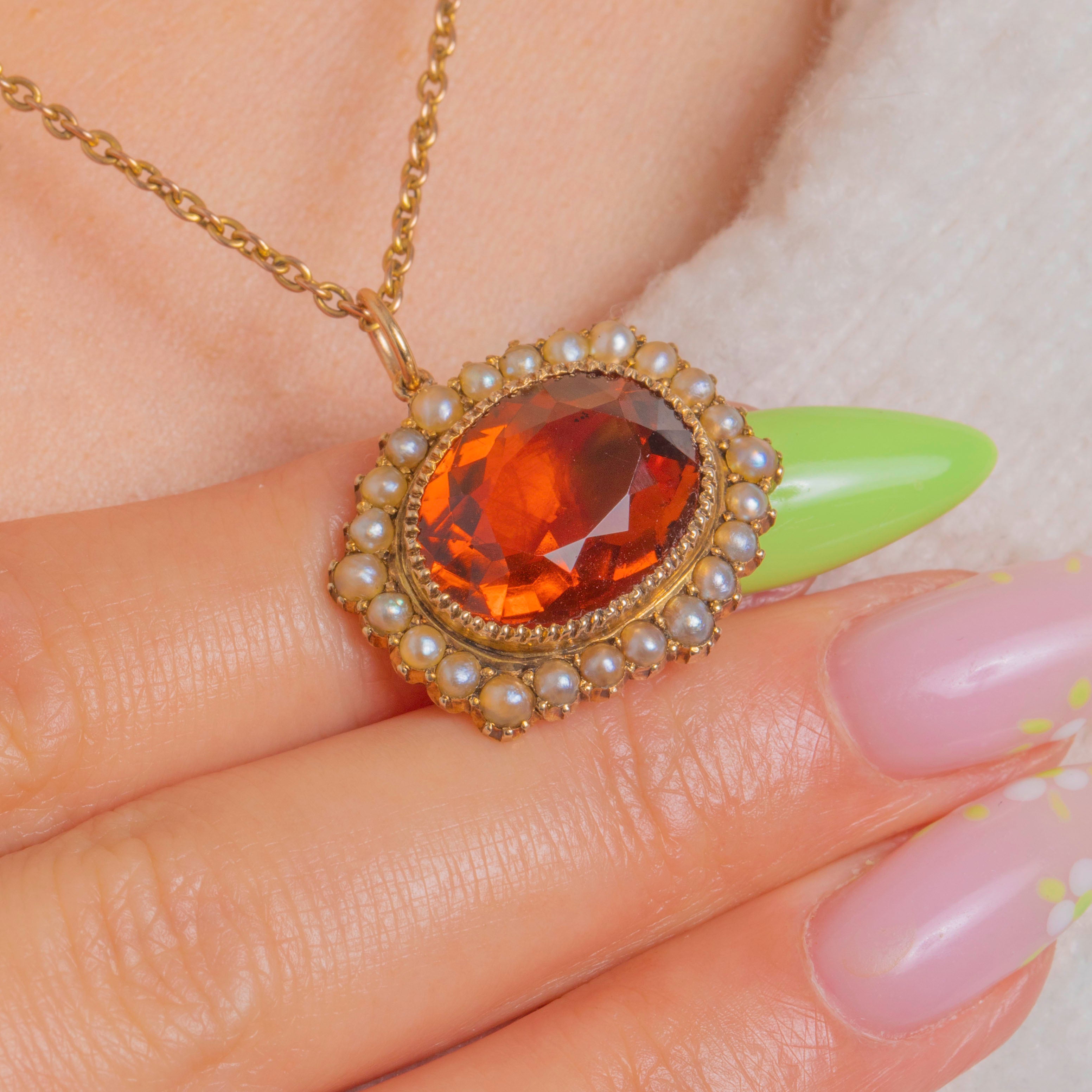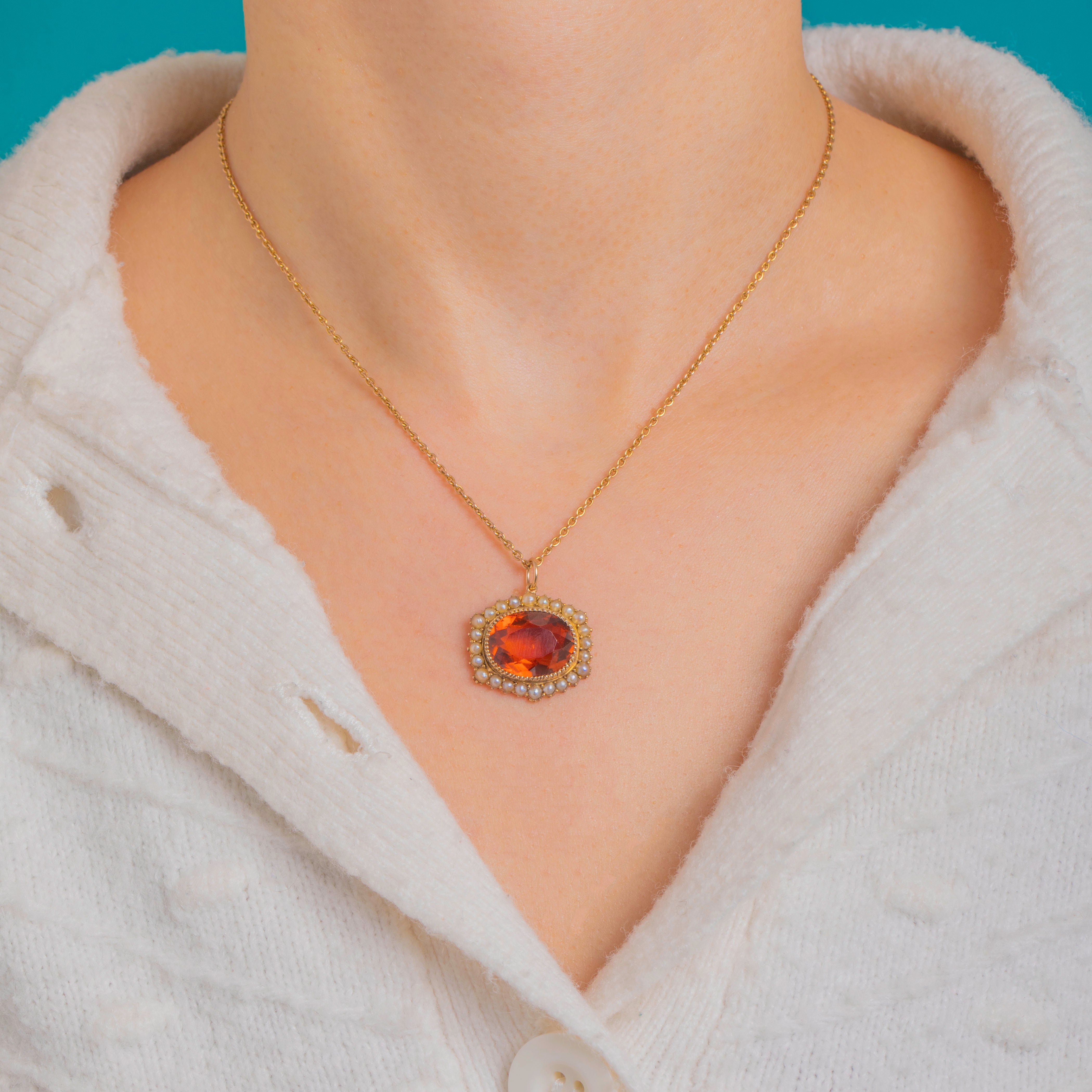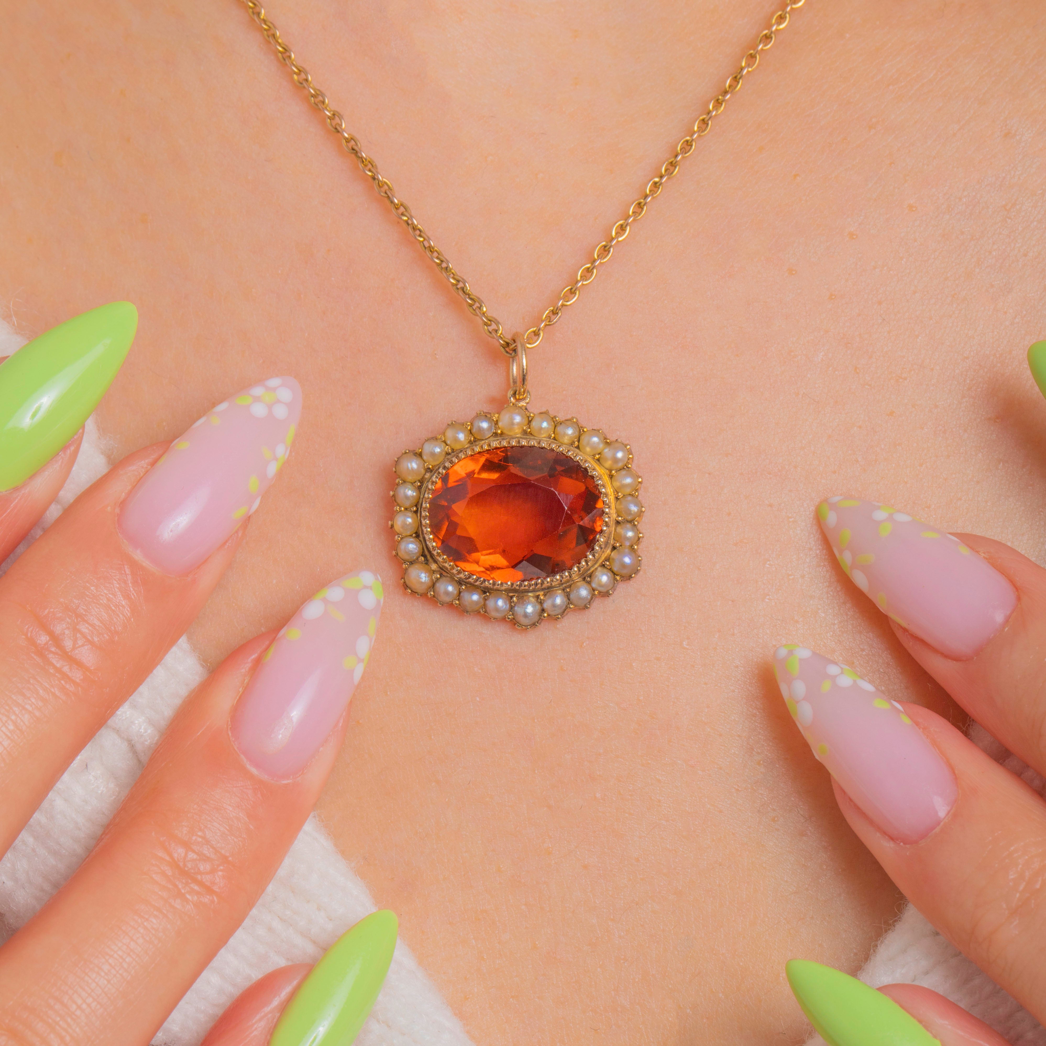 アンティークの優雅さを讃える輝きに満ちた逸品。Edwardian ペンダントは、贅沢なマデイラシトリンをクリーミーなシードパールのハローで縁取っています。オーバルカットのシトリンは、豊かなエンバーオレンジとゴールドの色調を放ち、その温もりは繊細なビーズ装飾が施された上質な15ctゴールドのセッティングによって一層引き立てられています。小粒のパール一粒一粒が丁寧にセットされ、鮮やかな中心石を柔らかくロマンティックに縁取ります。