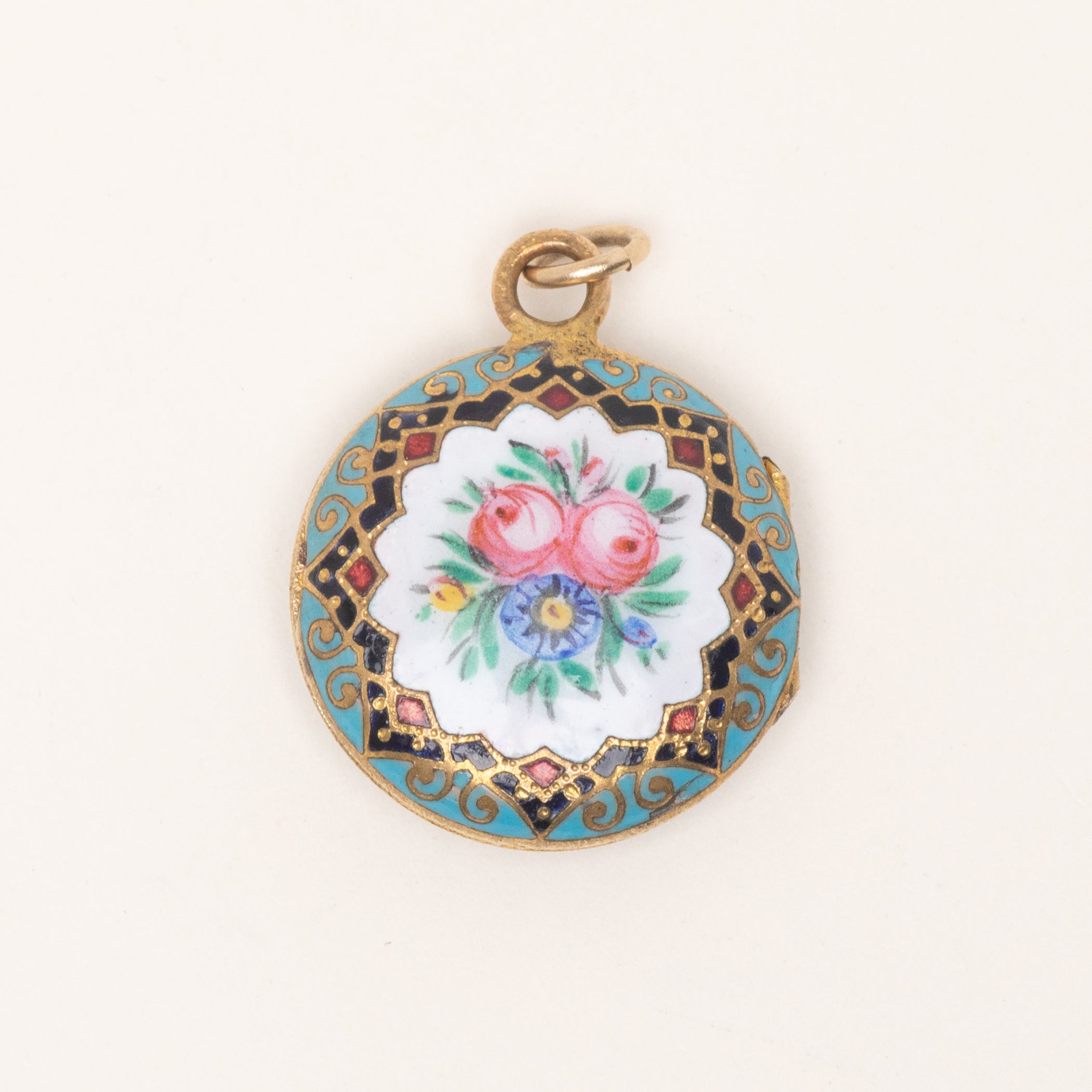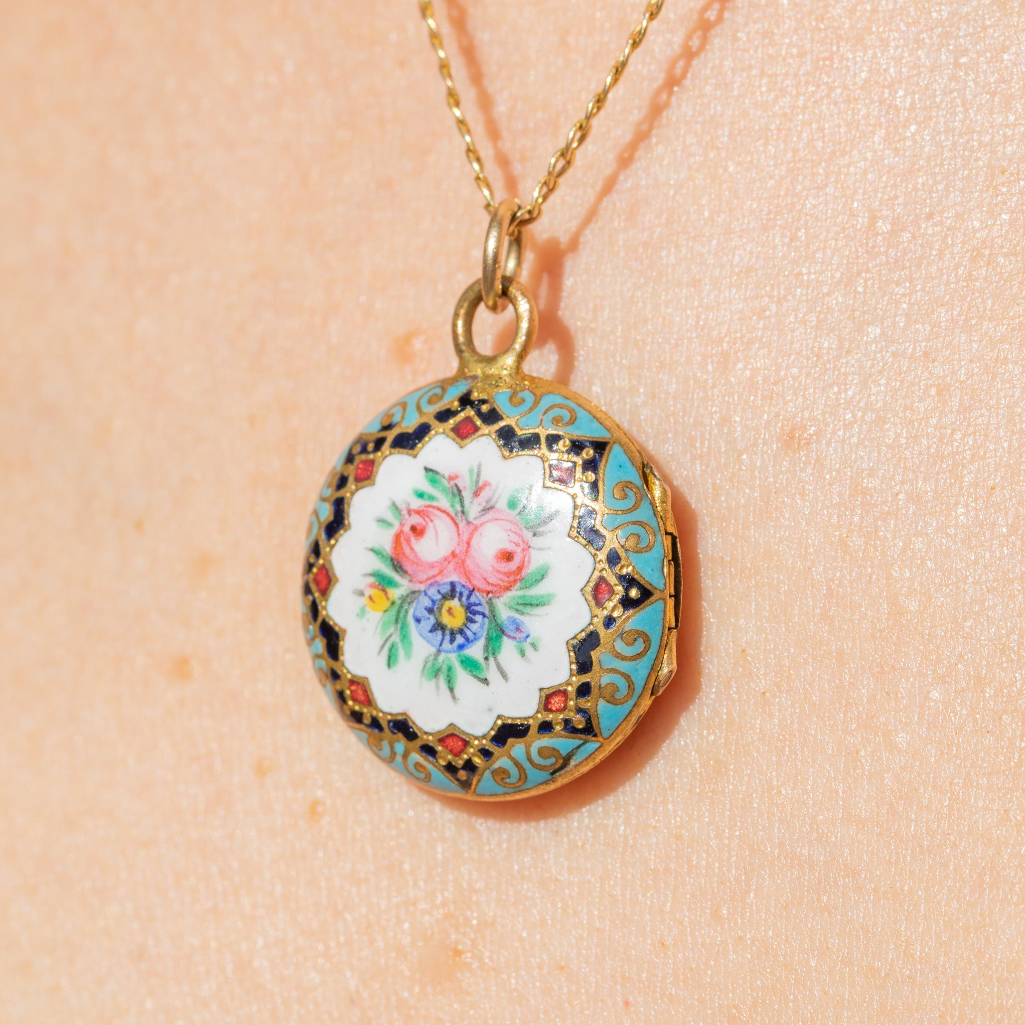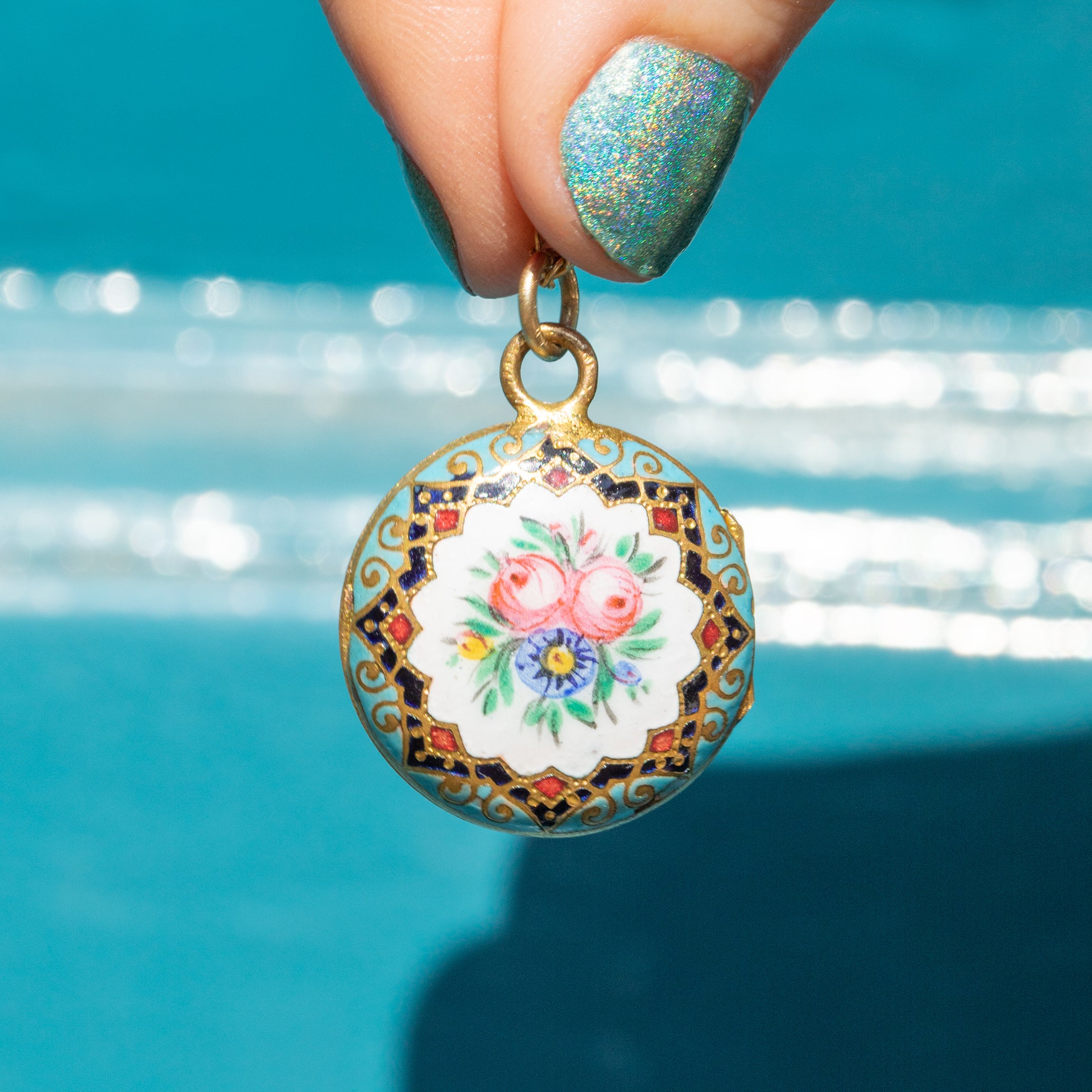 This antique Enamel flower locket will cheer up anyone lucky enough to lay eyes on her! Both her front and back flaunt a bunch of flowers in full bloom, framed by mandala-esque detailing crafted from Enamel.