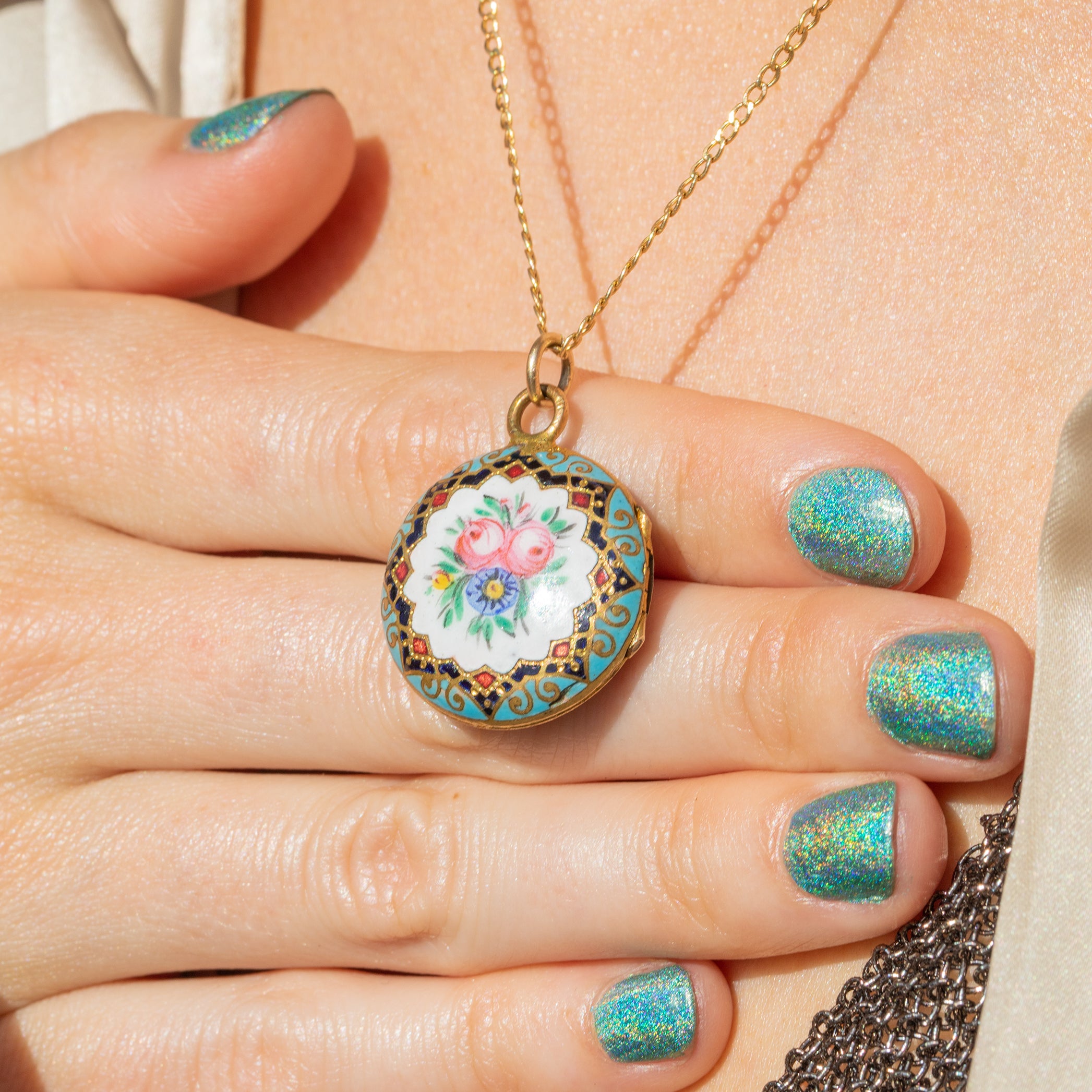 The colour palette of this Victorian locket is bursting, from sky blue to terricotta and every colour in between, she is bound to draw in attention wherever you wear her. With space inside to home one photograph and a hinged frame to secure, this antique flower locket has been expertly crafted.