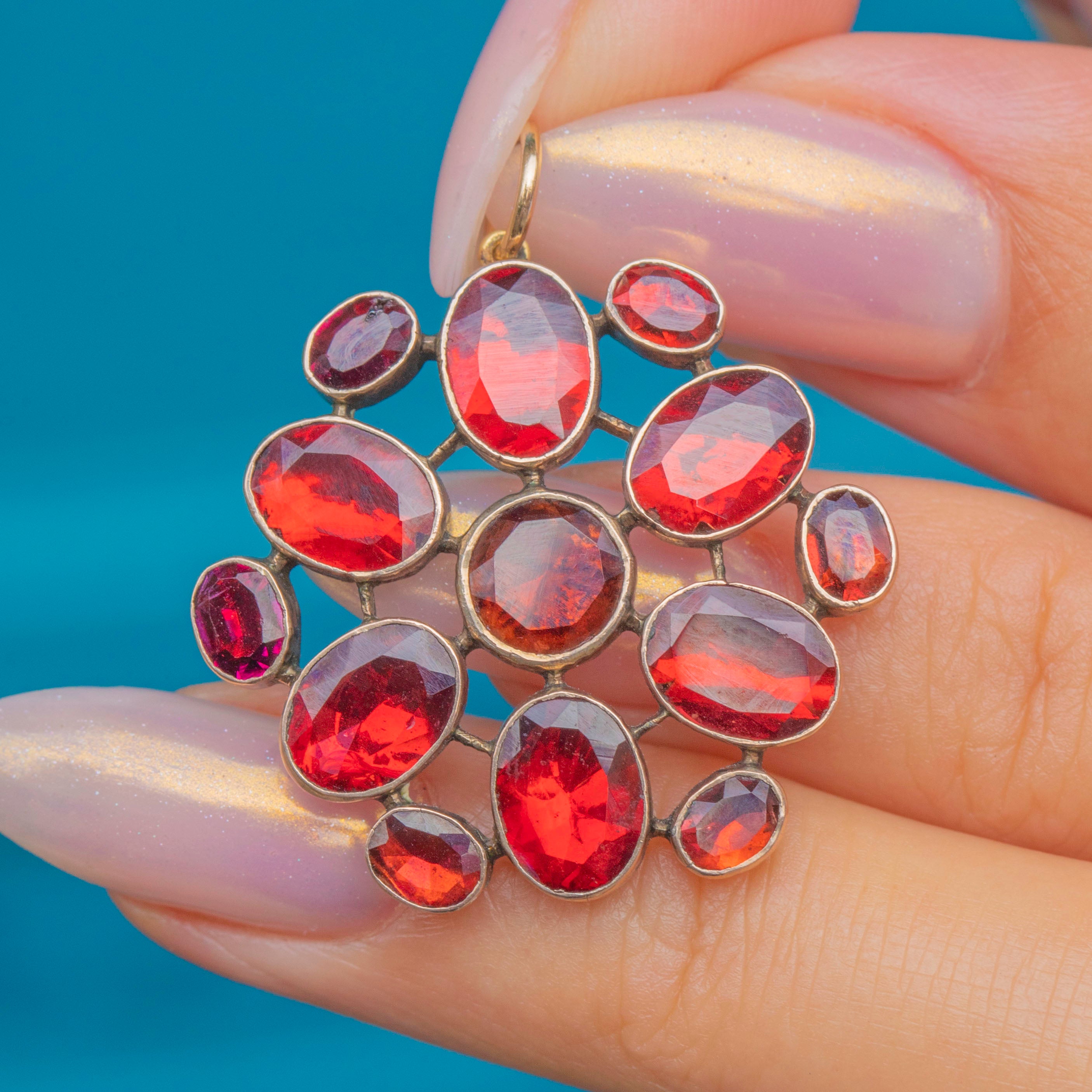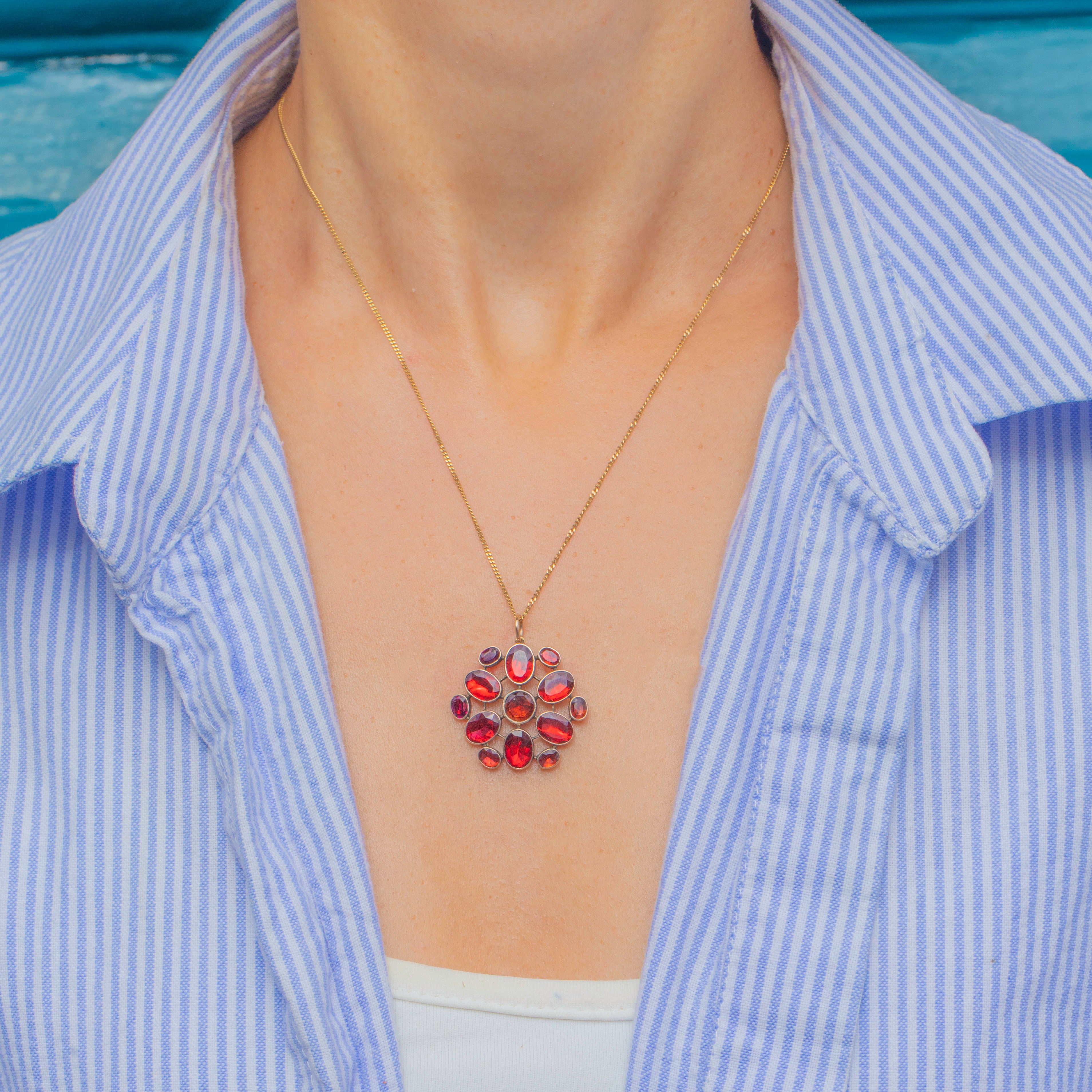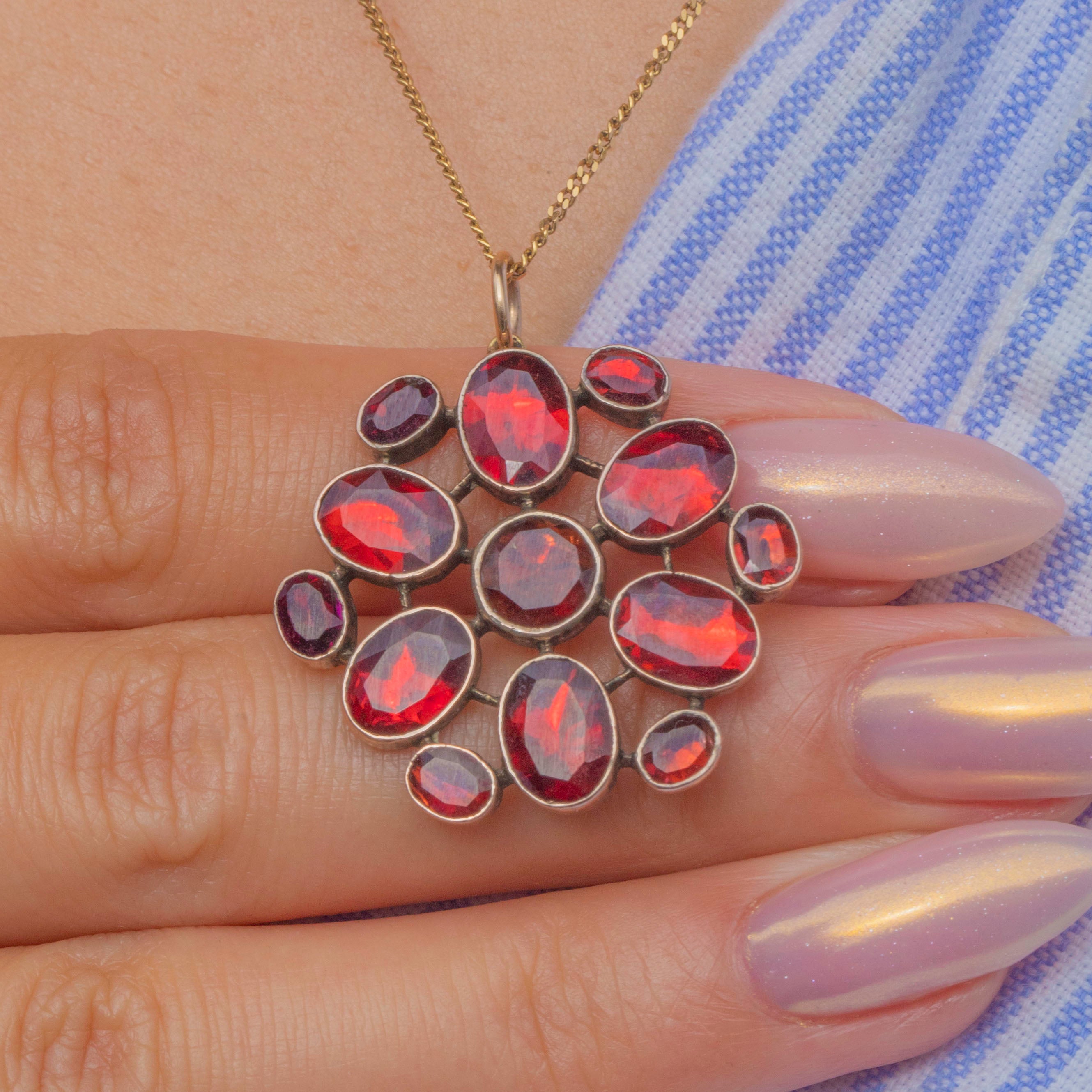 This charming antique pendant features a cluster of foiled flat-cut Garnets arranged in a delicate flower design.