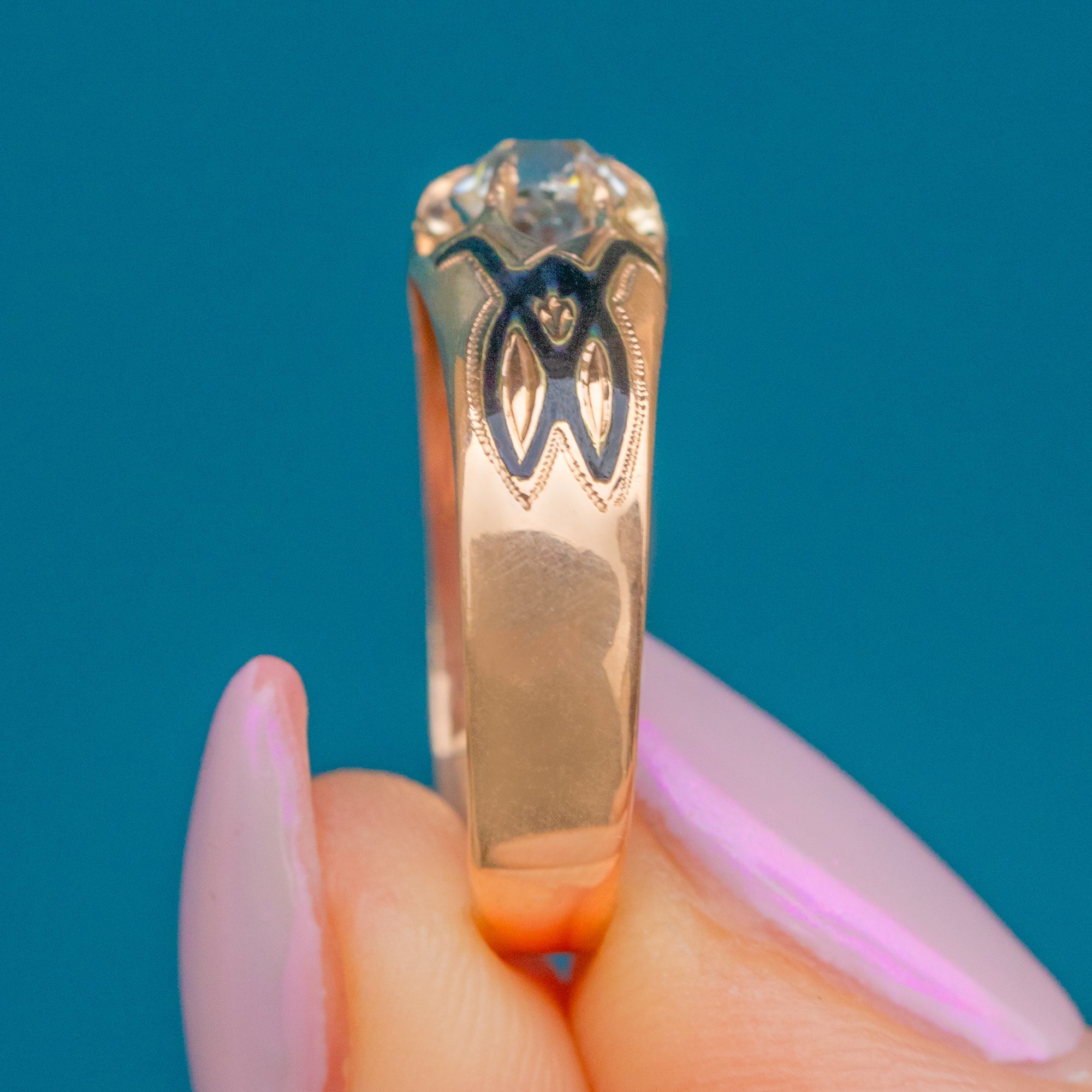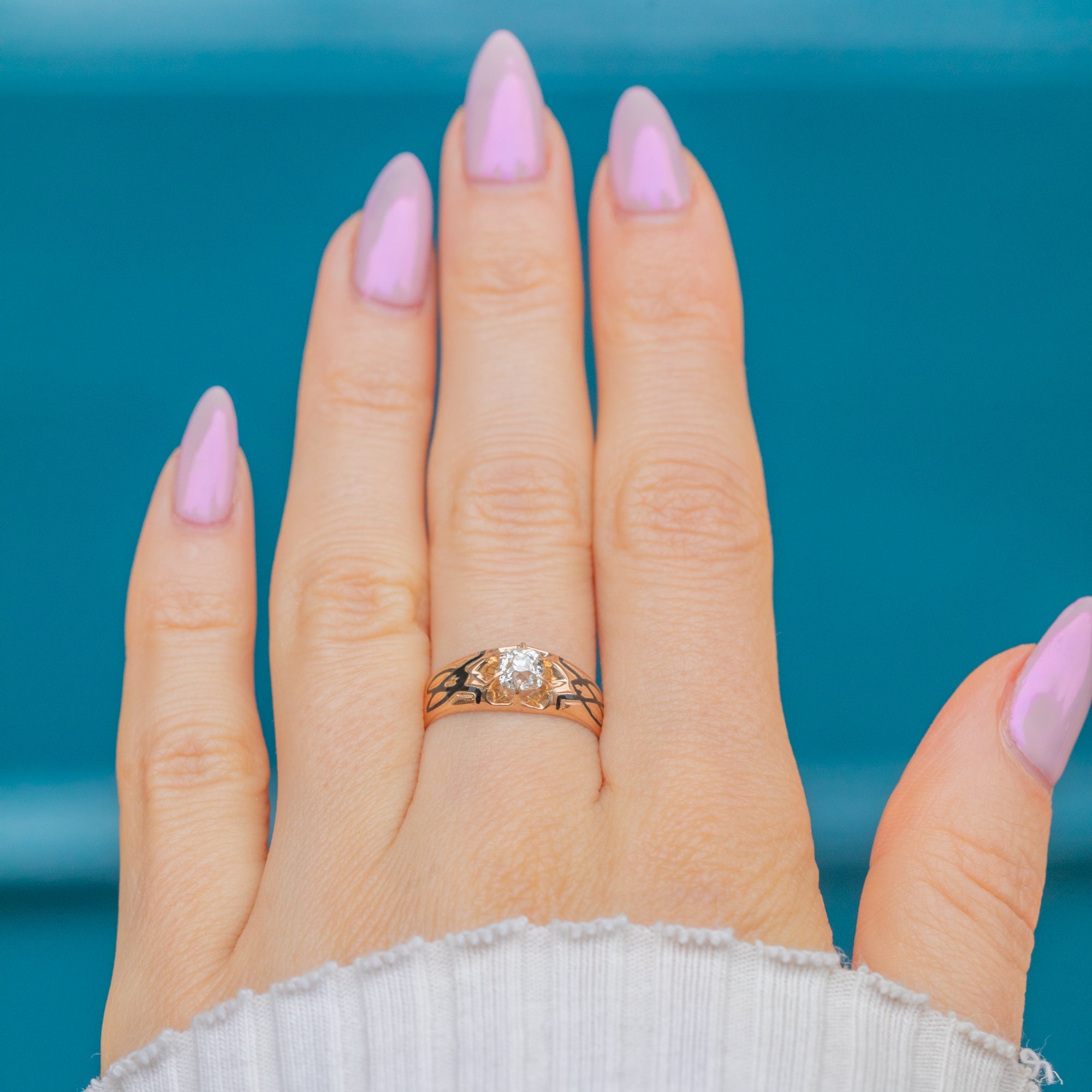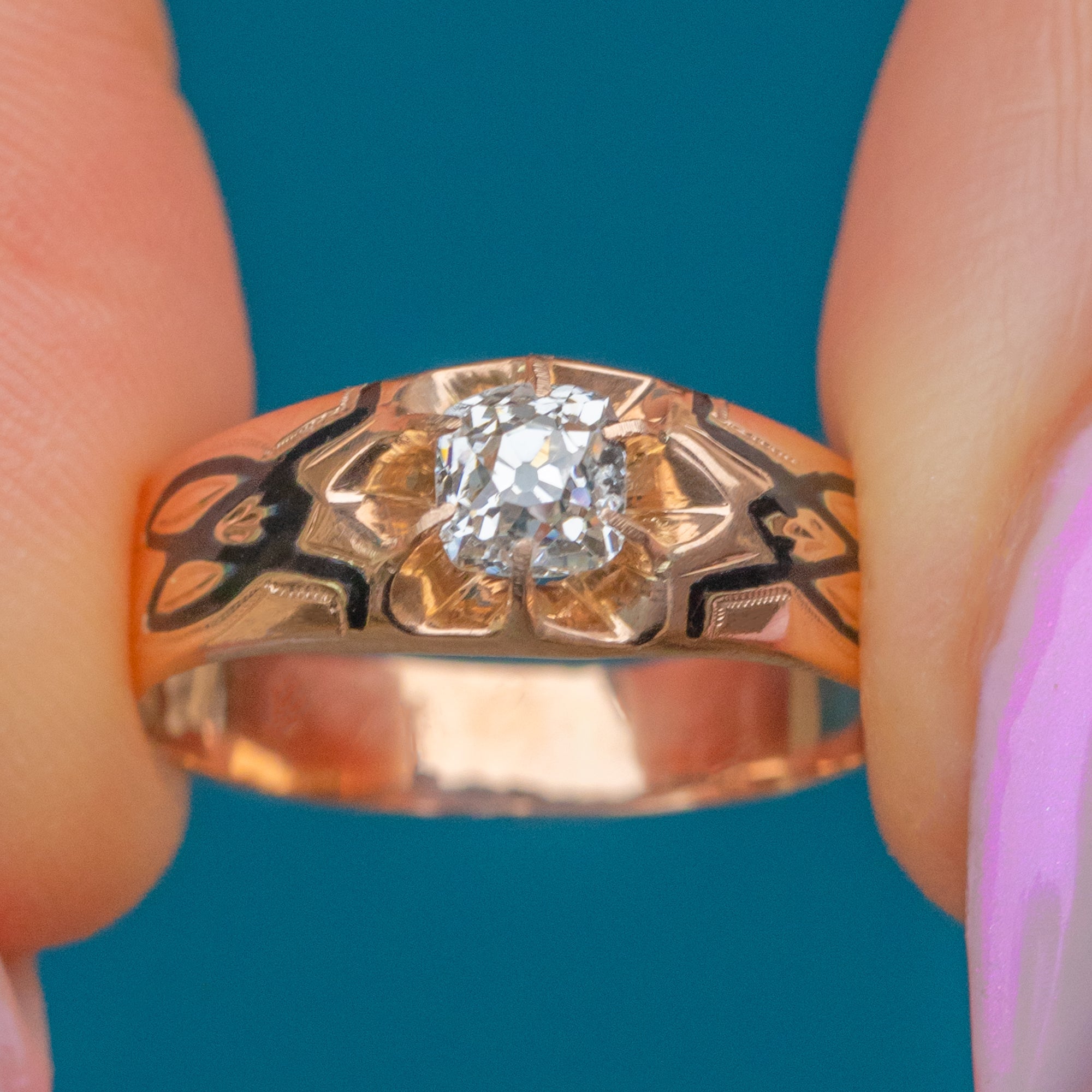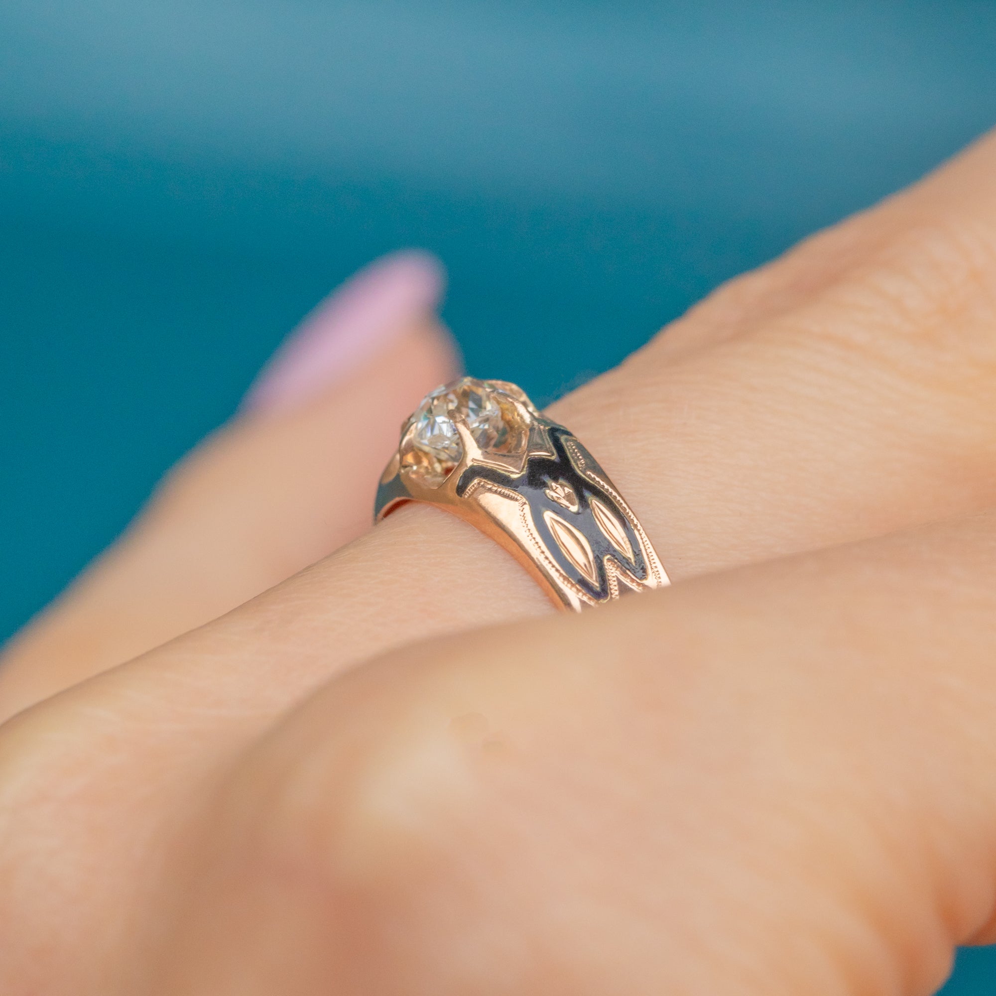アンティーク フランス製 15ct ゴールド ブラックエナメル ペルッツィカット ダイヤモンド リング