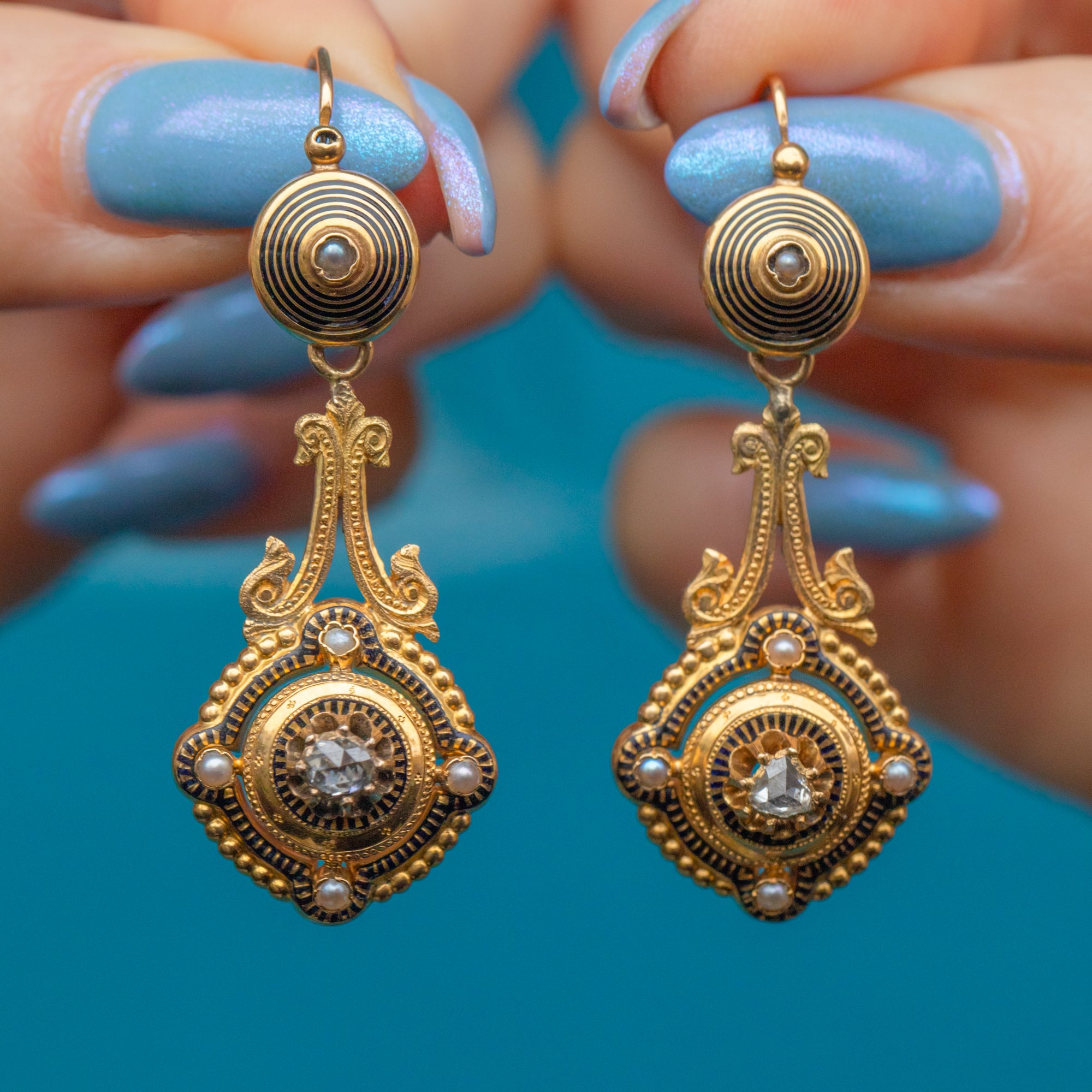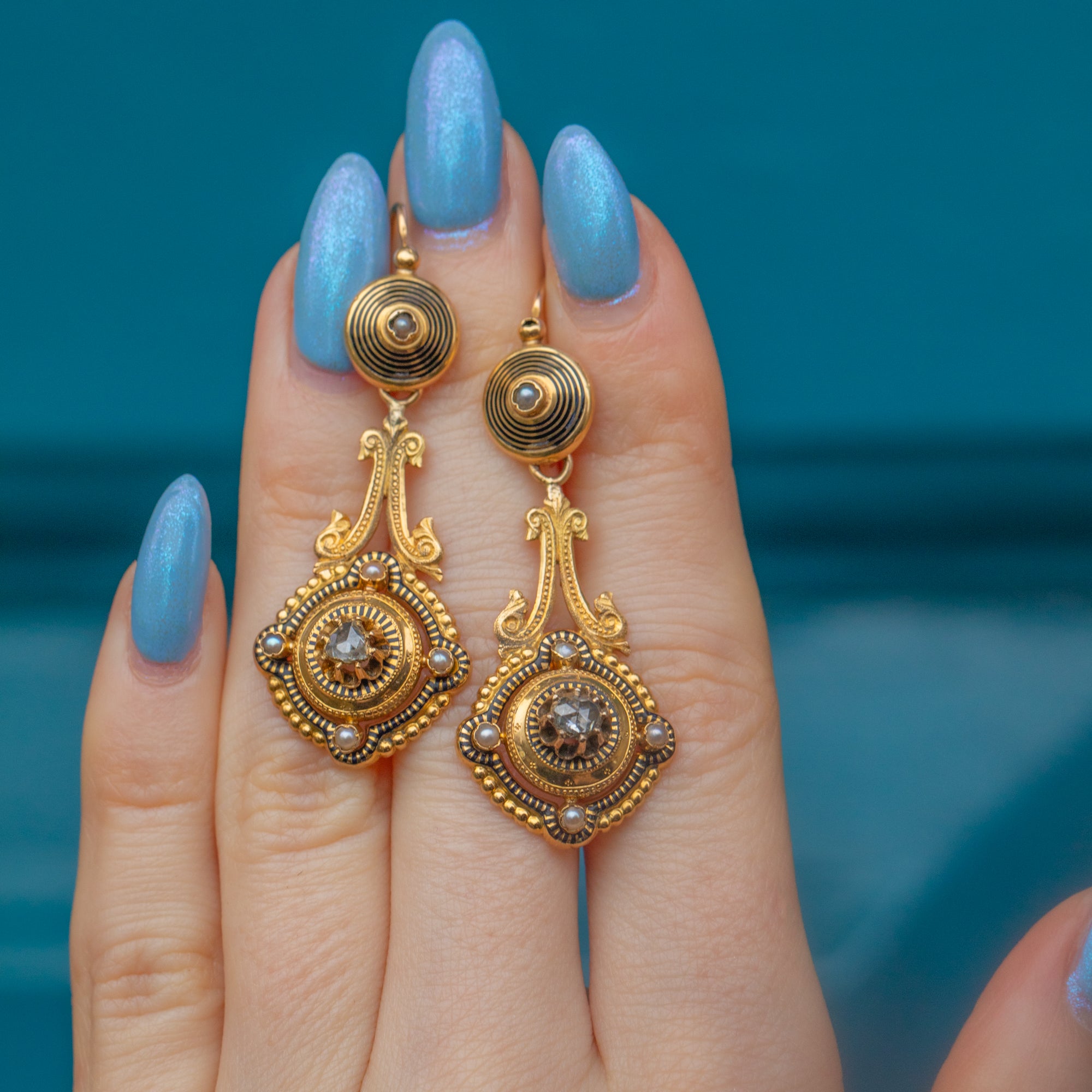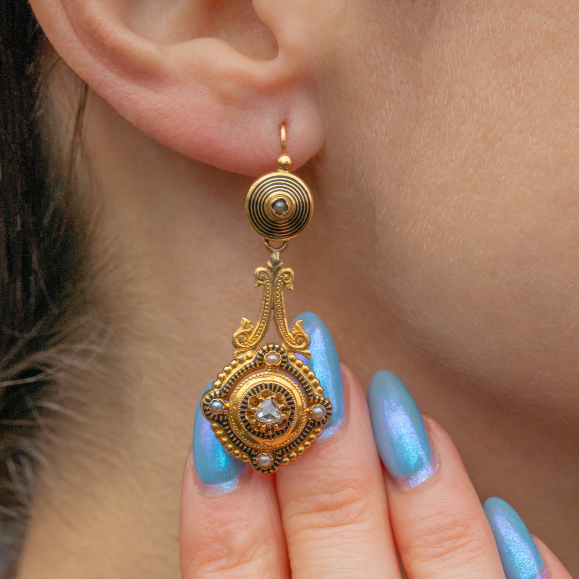 These outstanding antique French 18ct Gold black Enamel Diamond day & night earrings perfectly capture the exquisite craftsmanship of the Victorian era! The ornately formed 18ct Gold is bursting with intricate details, inlaid with striking black Enamel and studded with Pearls and a single rose-cut Diamond in the centre of each drop.