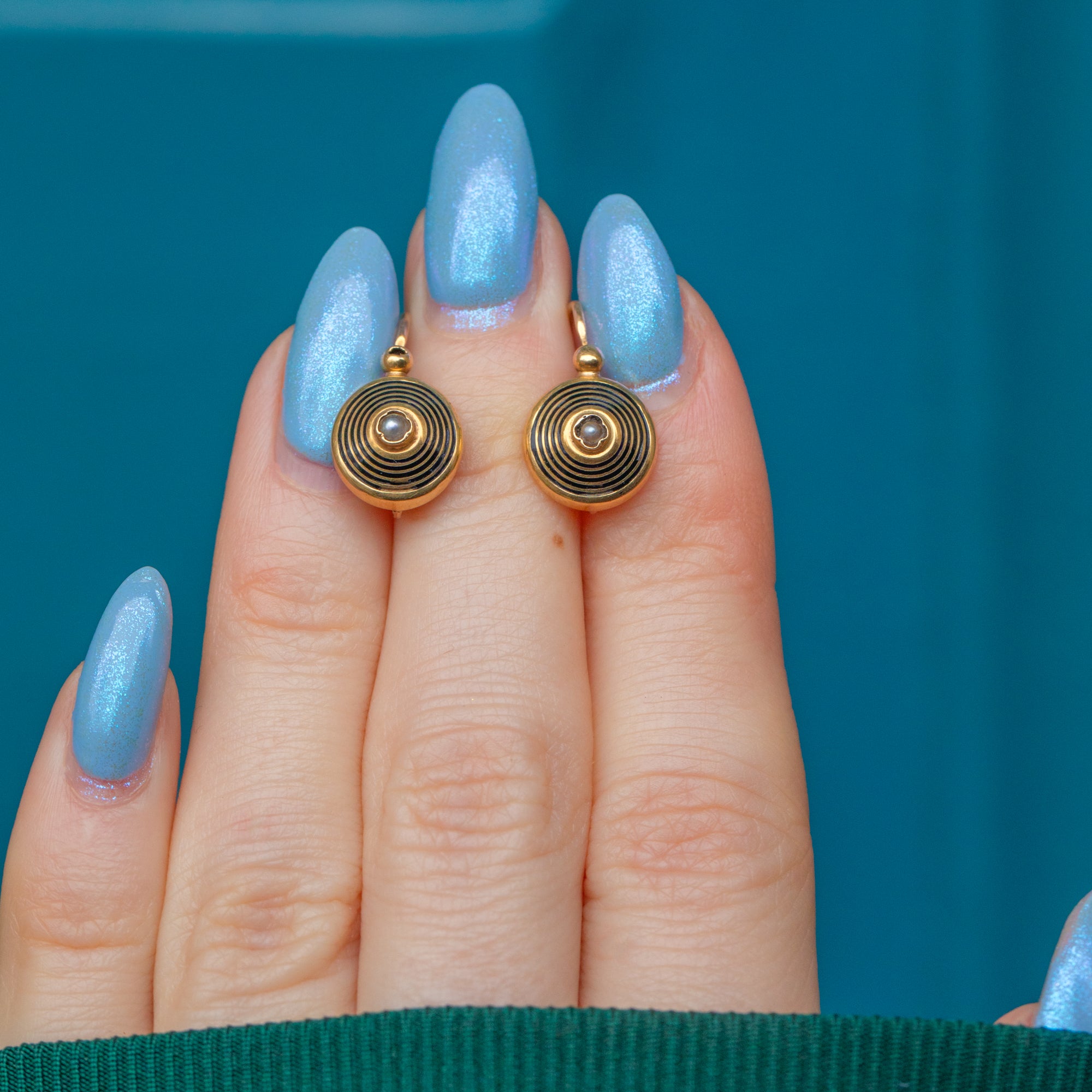 VERY GOOD-EXCELLENT. These antique French 18ct Gold black Enamel Diamond day & night earrings are in superb condition. The Gold is brightly saturated and the black Enamel is pristine and defined. Each rose-cut Diamond has crisp facets and is securely set, with no fleabites visible, and the Pearls are all present with a lovely silvery sheen. There is some general wear, to be expected from a piece of jewellery created over a century ago, and one of the ball details on one earwire has some damage, but this is barely noticeable amongst the fine details of the earrings. All the components are securely affixed with robust lever-backs that allow for confident wear!
