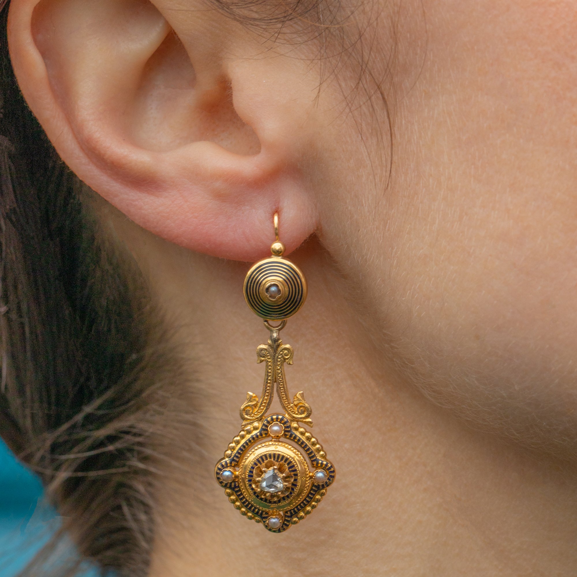 Day and night jewellery was incredibly popular during the 16th and 17th centuries, revered for their versatility, and these Fench beauties are a fine example. Each piece of jewellery was created with multiple components giving the wearer a choice in how to style them. With this pair, the top section can be worn alone for a more minimal "day" look, with the bottom sections affixed at "night" for special occasions.