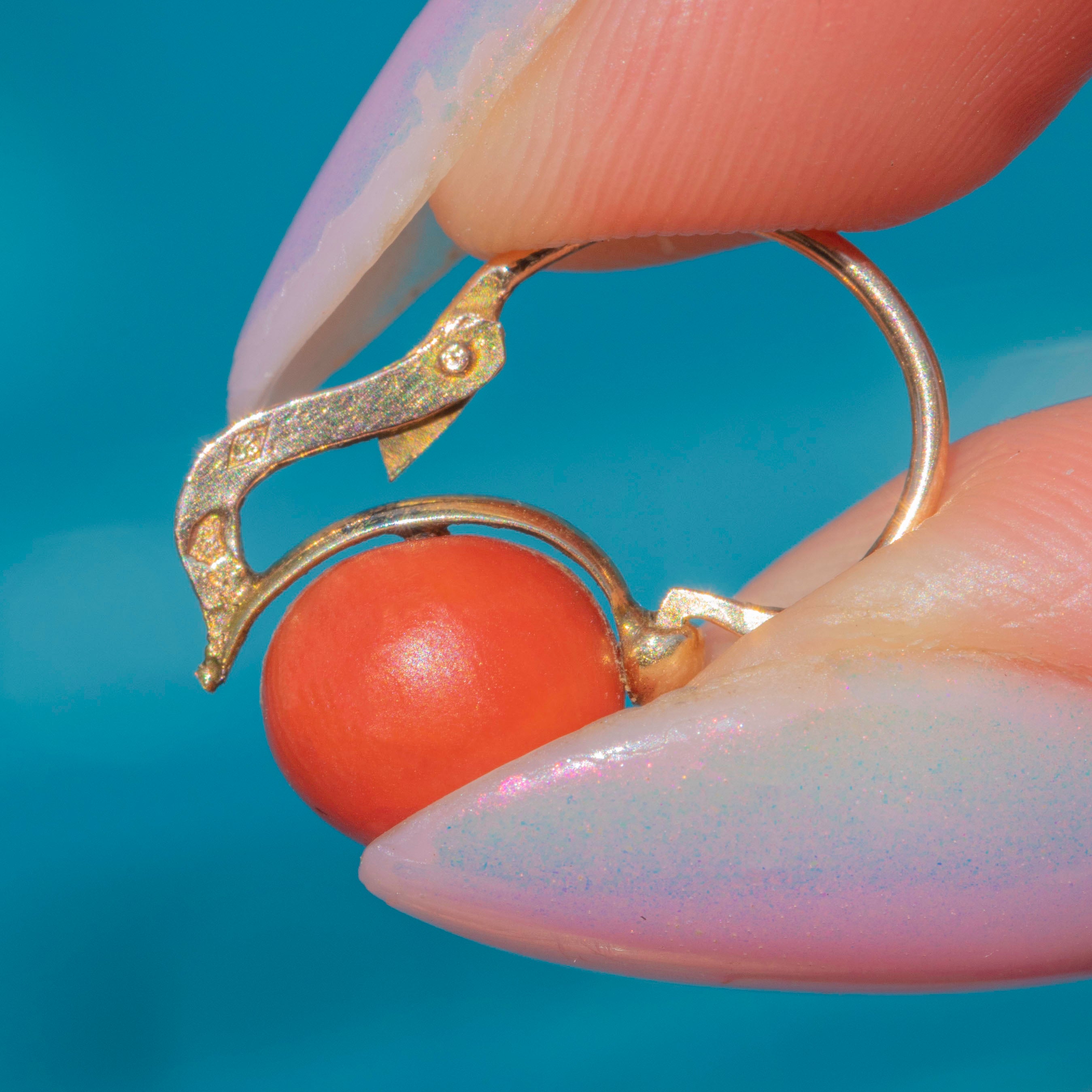 VERY GOOD: These French Coral earrings are in very good antique condition. The Coral orbs are delightfully domed and satisfying to touch. There is a small nick to the surface of one of the Corals, which is only noticeable under close inspection. Complete with 18ct Gold levers, they sit ever so elegantly in the lobe.