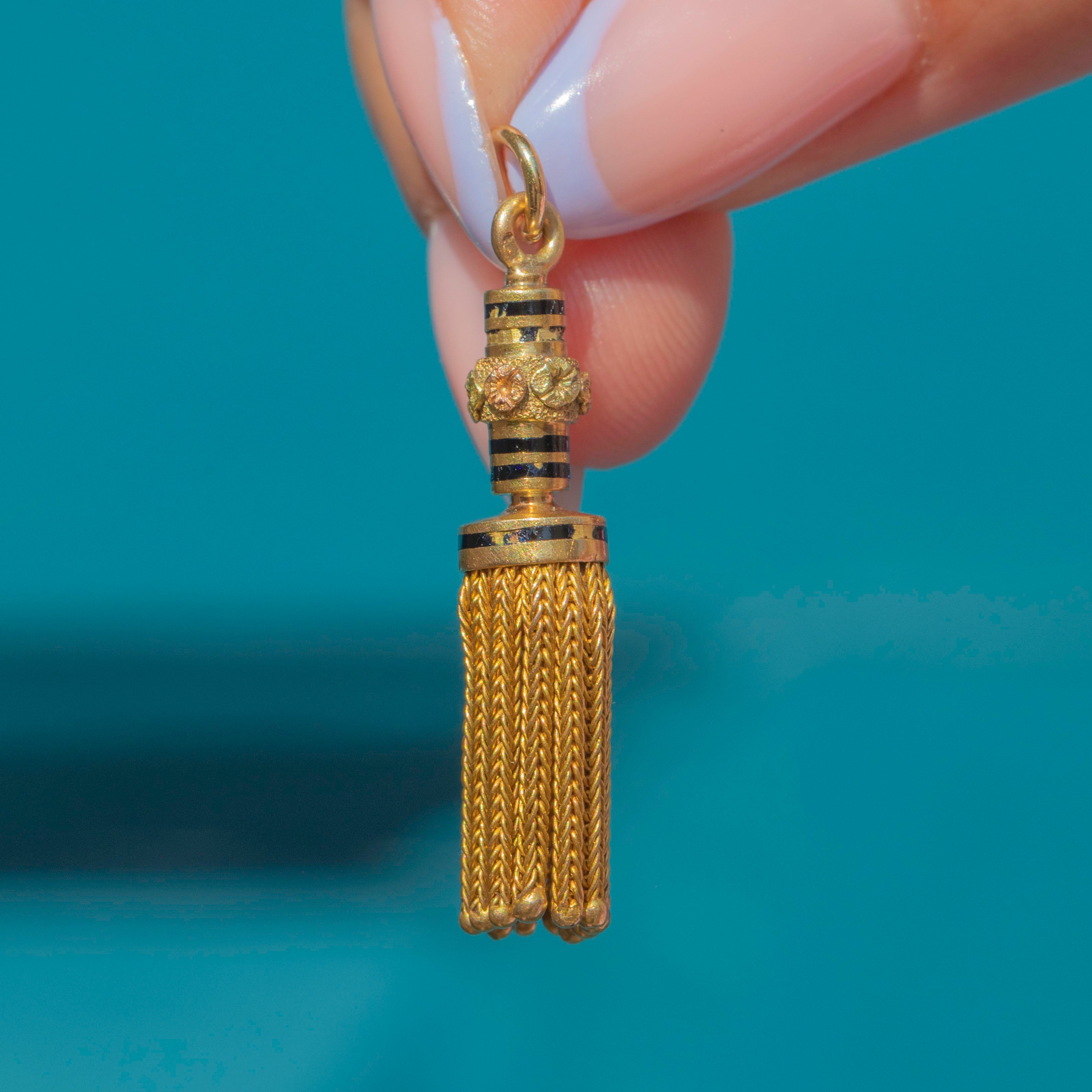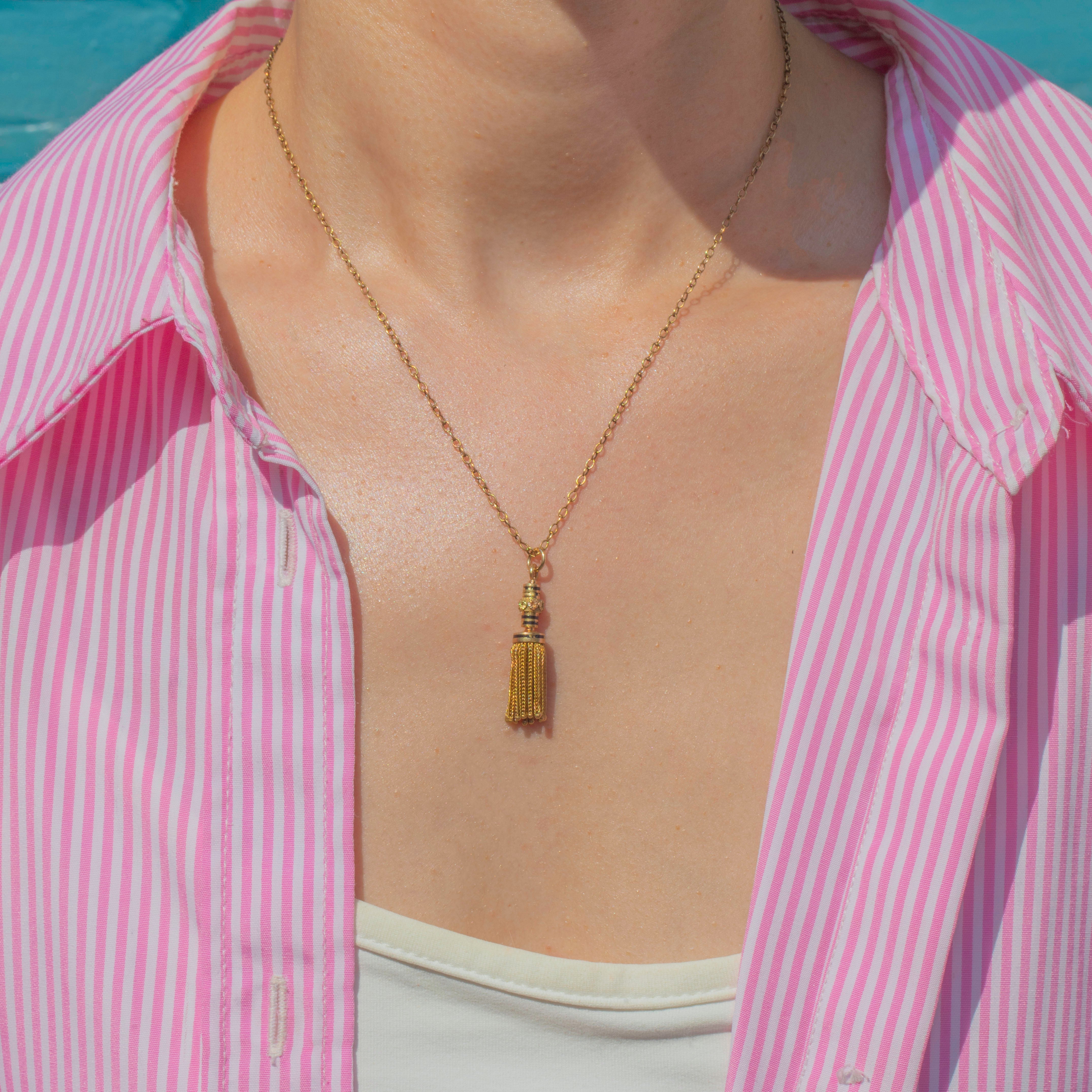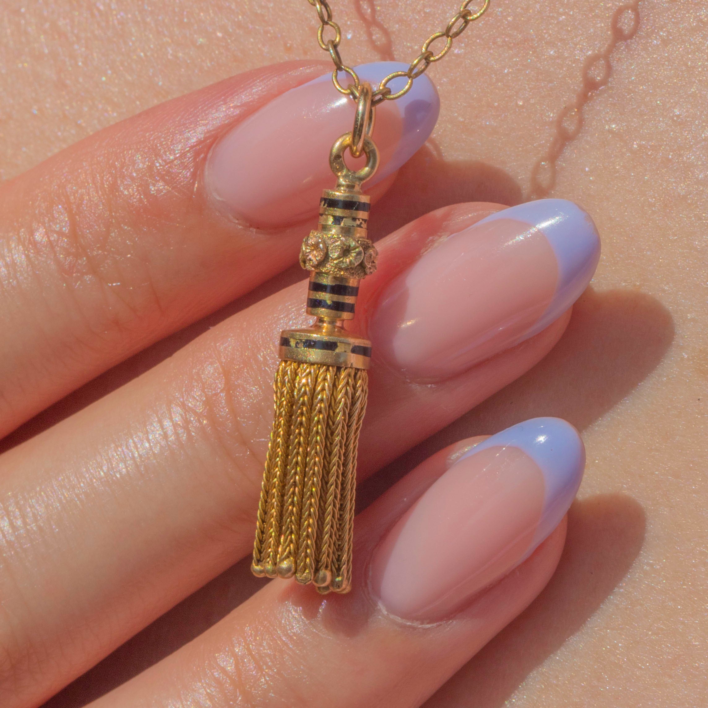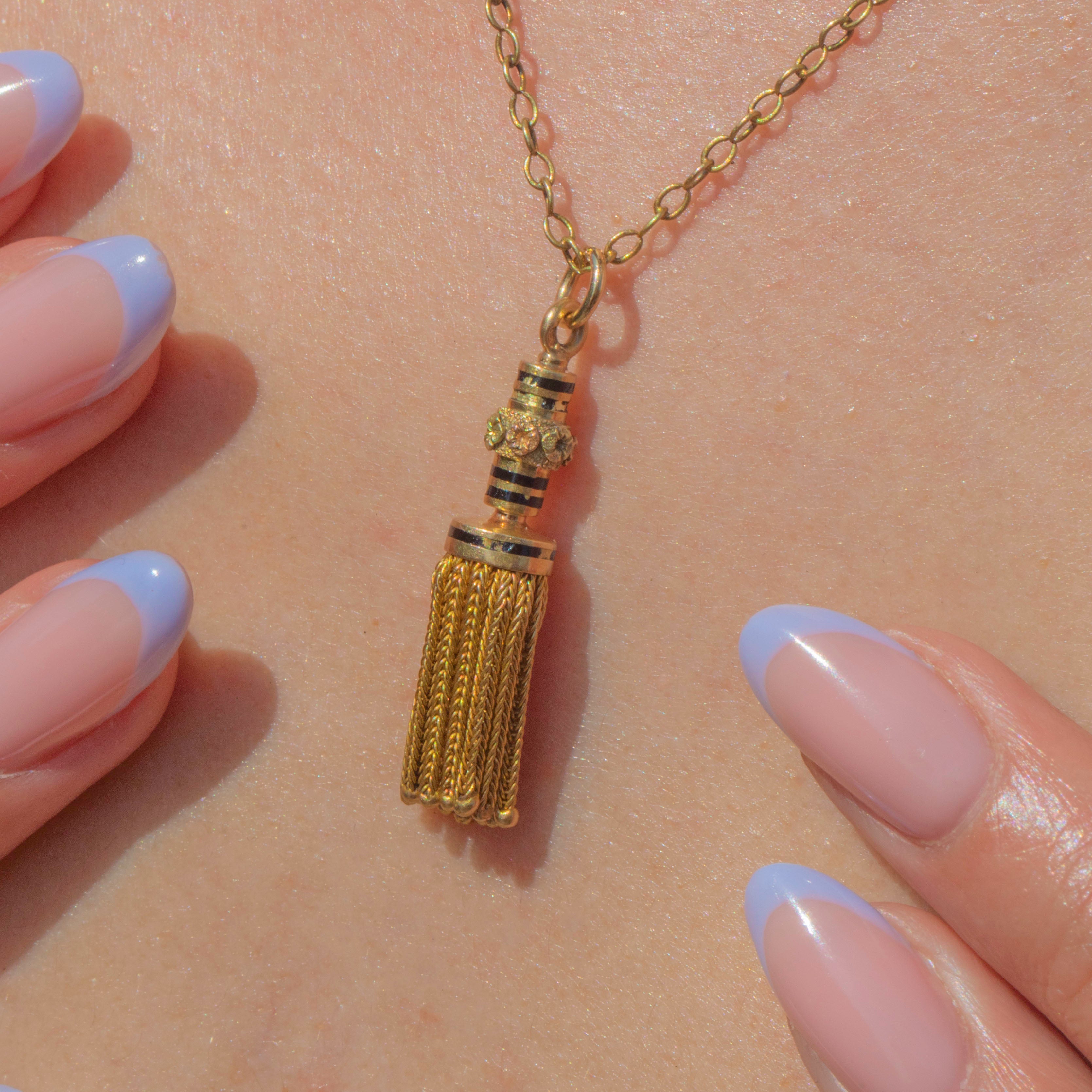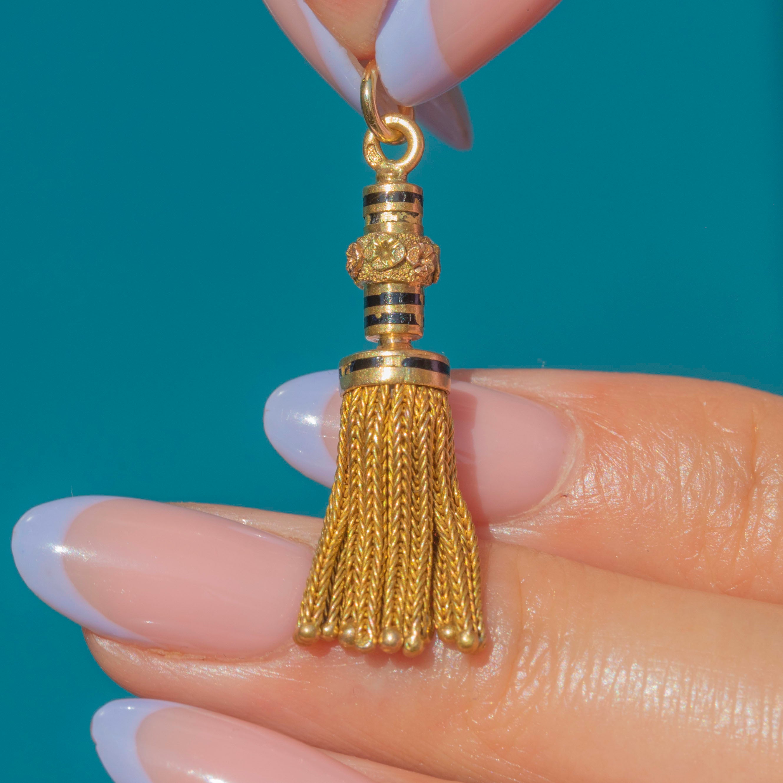 This antique French 18ct Gold & Enamel tassel pendant exudes elegance from every angle! The tassel is crafted from solid 18ct Gold, its rich saturation contrasted beautifully by inky black Enamel.
