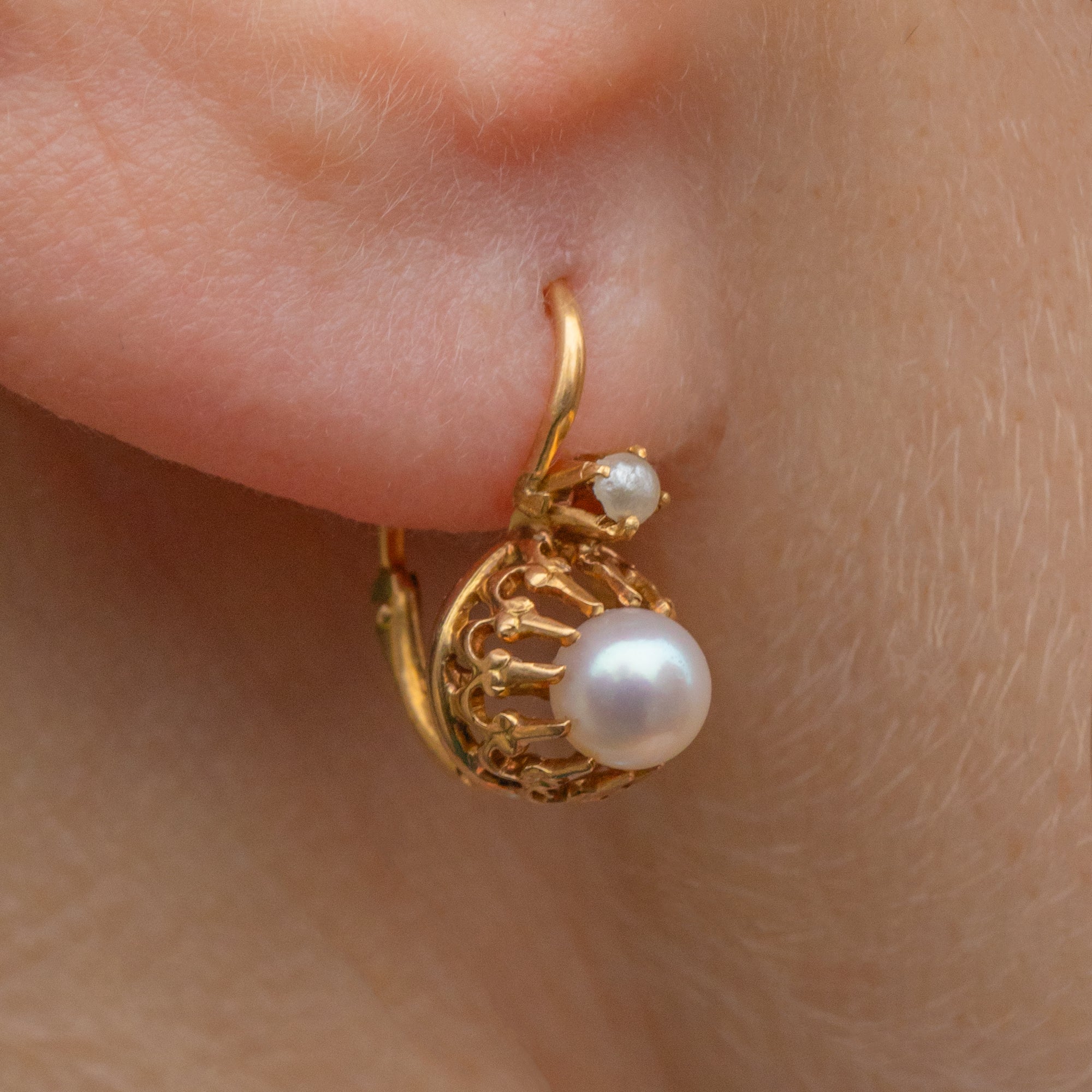 EXCELLENT. These antique French 18ct Gold Pearl dormeuse earrings are in wonderful condition! The Pearls are plump, sitting securely within their settings, and offer a lovely soft shimmer. The 18ct Gold is richly saturated throughout, with the structural integrity remaining robust. With little else to note, you can wear them with the utmost confidence and comfort!