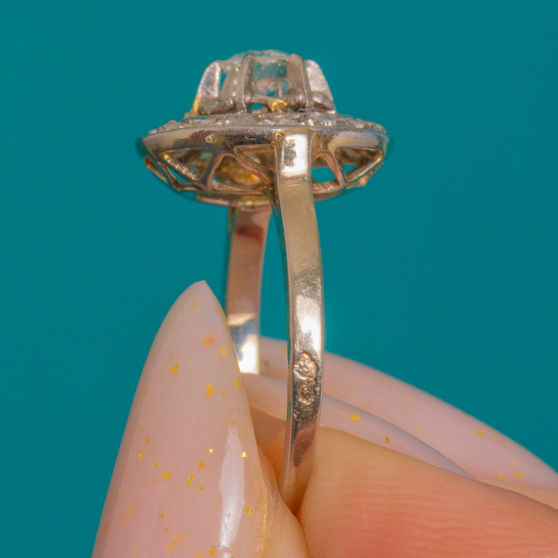 MATERIALS: Tests as 18ct Gold and Platinum, 0.35cts Diamonds (Old European cut centre and Rose-cut halo).