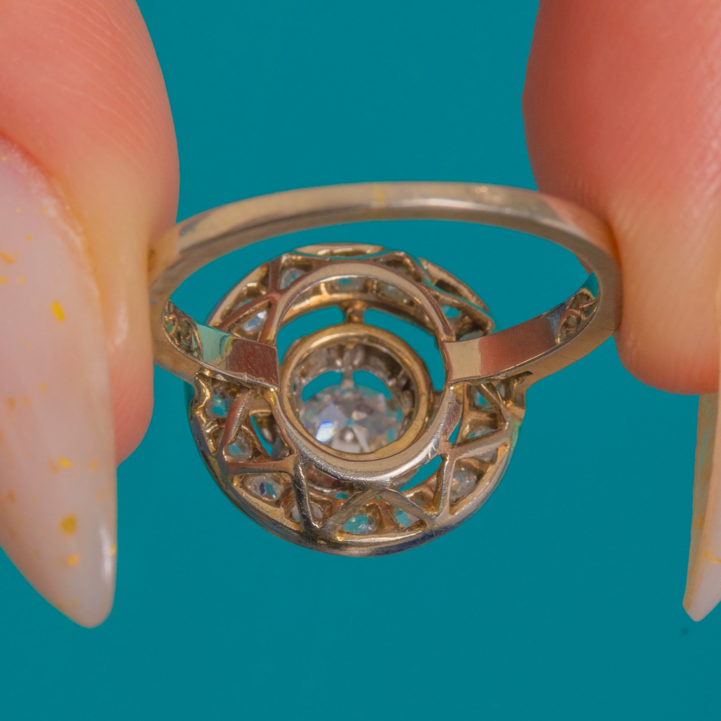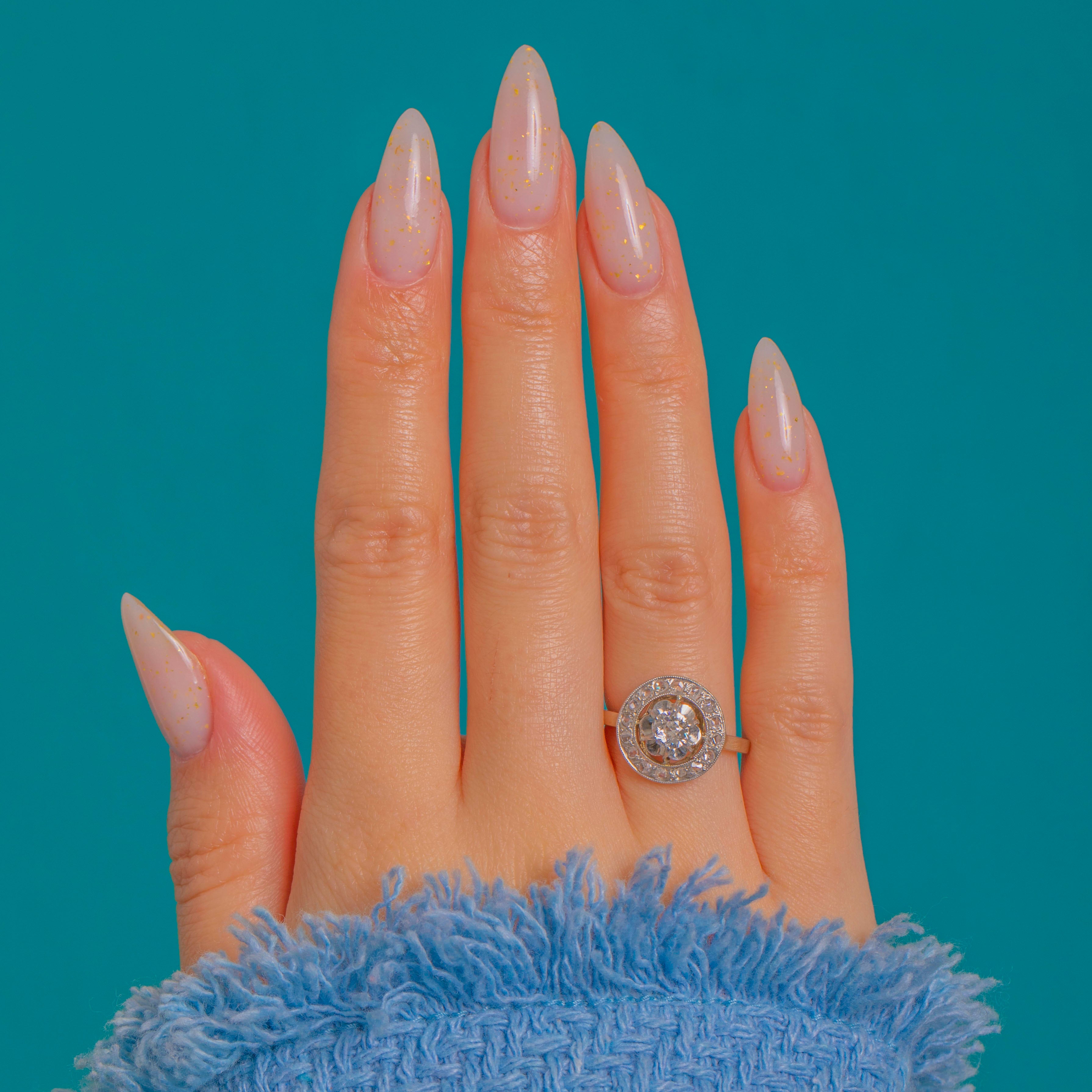 A quintessential Edwardian “target” cluster, this French Diamond halo ring is beautifully rendered in 18ct Gold with Platinum settings. A bright Old European cut Diamond of approximately 0.25ct takes centre stage in a scalloped, buttercup-style surround, encircled by a fine halo of glistening rose-cut Diamonds with delicate milgrain edges. The high profile and airy, pierced under-gallery lend an elegant lightness to the design while maximising sparkle.