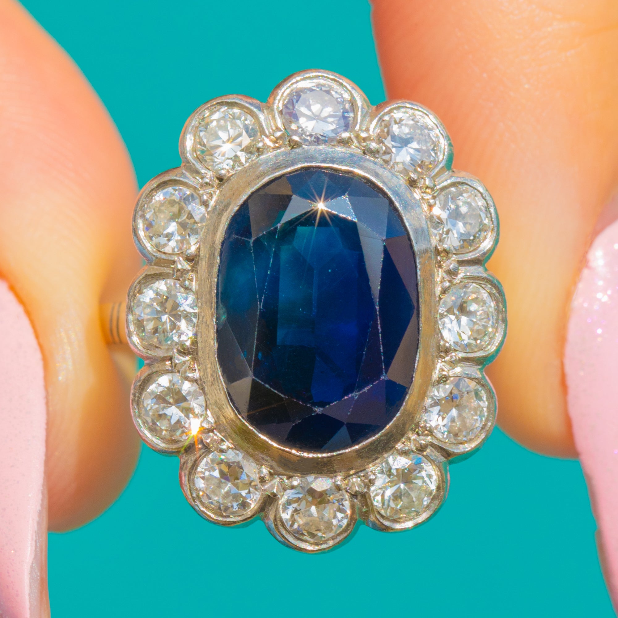 フランス製の輝かしいArt Decoクラスターリング。天然・非加熱の5.25カラット サファイアが贅沢で濃密なブルーを湛え、12石の鮮やかなダイヤモンドがスカラップ状のハローを描きます。オーバルサファイアは洗練されたベゼルに高くセットされ、その鮮烈な色彩が周囲のストーンのシャープな煌めきと調和し、時代を超えた存在感あるシルエットを生み出しています。