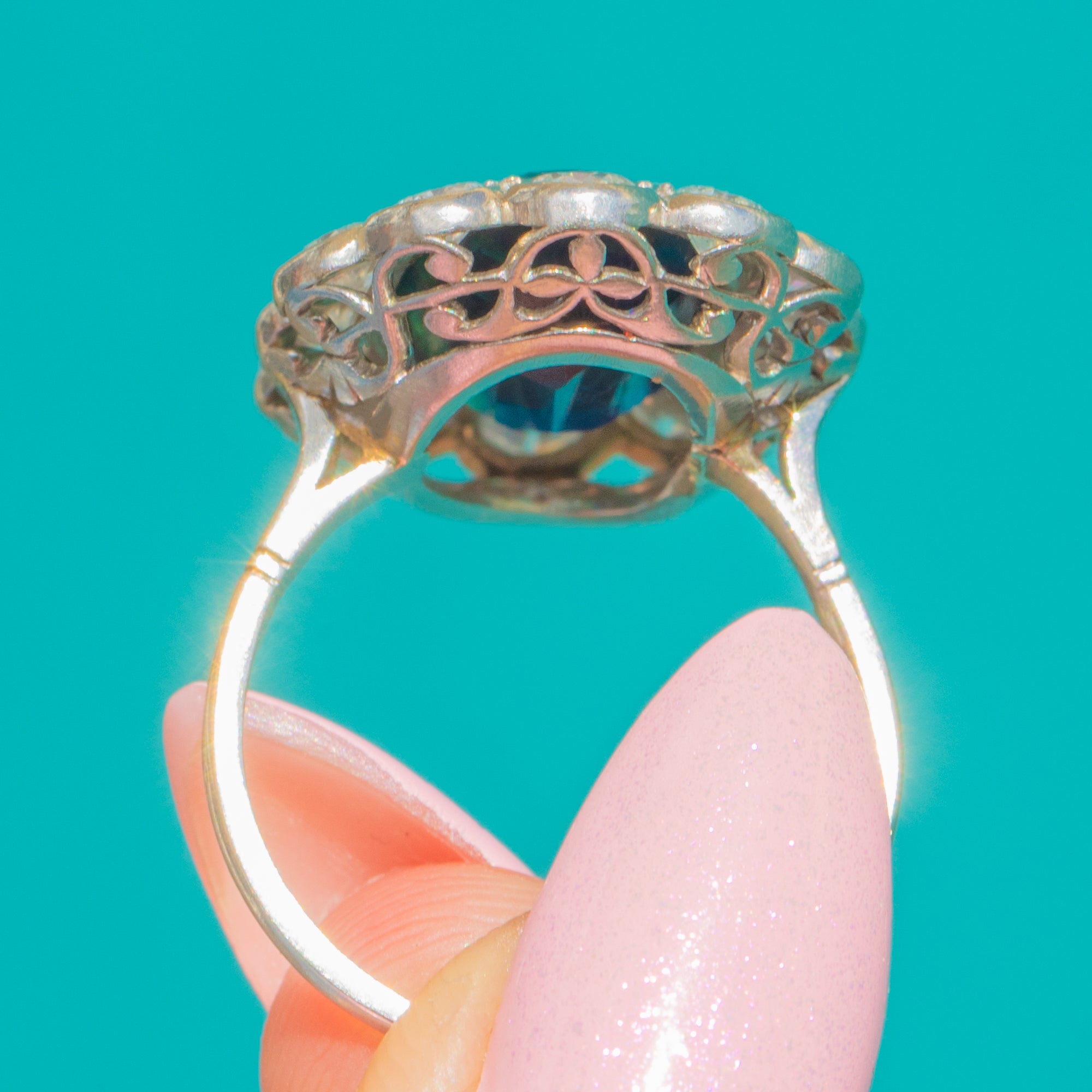 プラチナでトップを仕上げたセッティングは、エレガントな透かし細工が施され、スレンダーな18金ゴールドのバンドに載っています。美しさと耐久性を兼ね備えた、クラシックなArt Decoの組み合わせです。洗練と永続性を兼ね備えた本作は、エンゲージリングやシグネチャーとなる右手用リングとしても華やかな選択肢です。