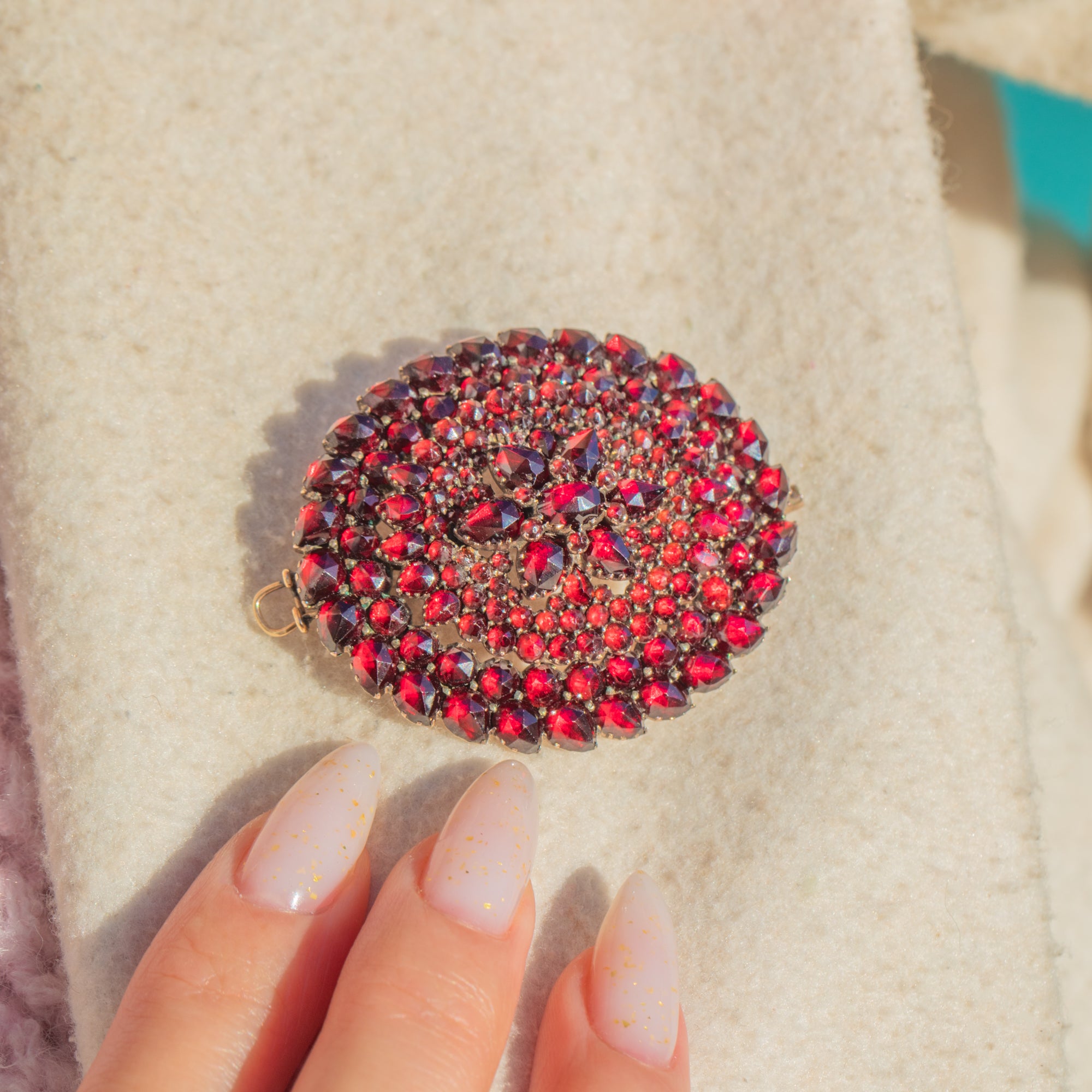 極上:ガーネットは鮮やかで揃いが良く、しっかりと留められています。拡大してわずかに経年に伴う微細な擦れが見られるのみです。金属部分には穏やかで均一な古色が現れ、金具も滑らかに作動します。目立つ修復跡はなく、全体的に非常に良好な保存状態です。