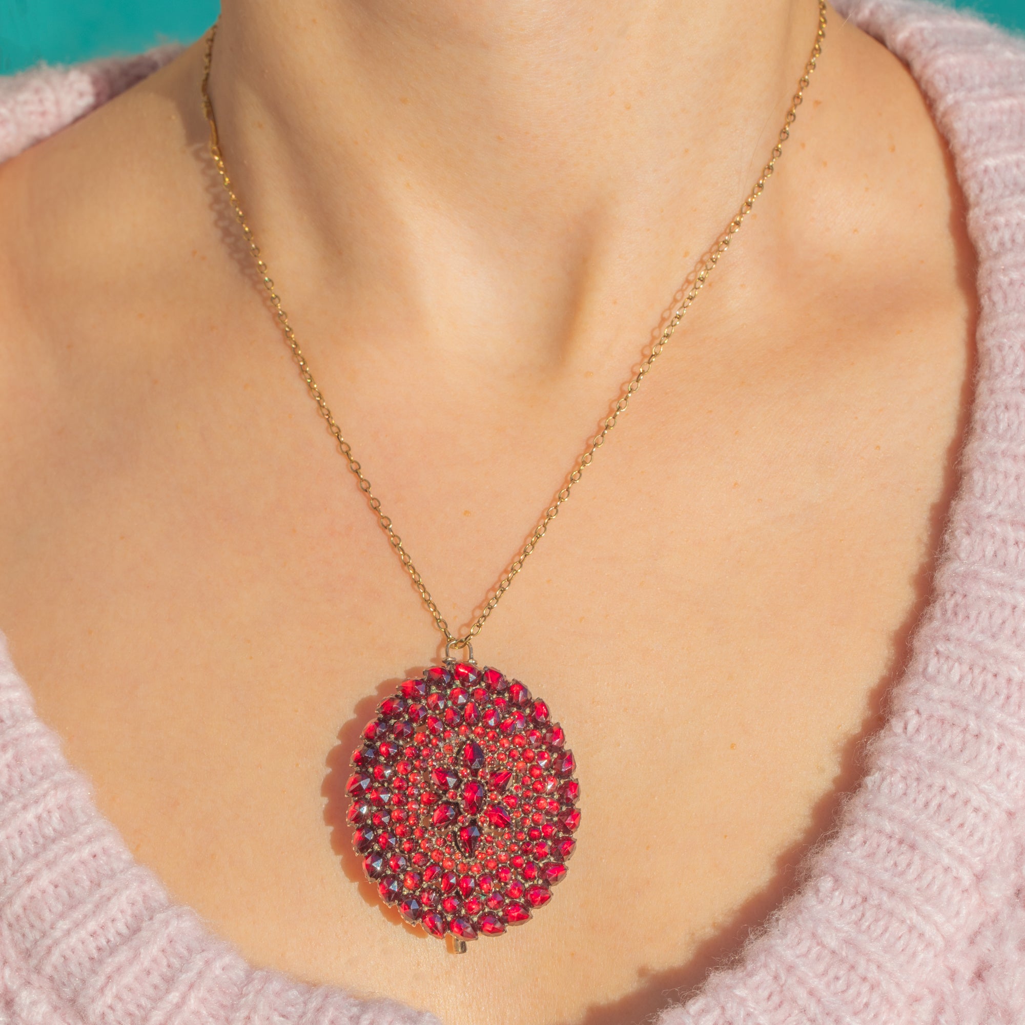 ガーネットゴールドで丁寧に作られ、多用途にお使いいただけるよう設計されています。ペンダント用の固定された9ctゴールド製ジャンプリングと、しっかりと留められるブローチ金具を備えています。密に配された石座が色彩の深みと輝きを一層引き立て、9ctゴールドのジャンプリングは安心感のある堅牢な吊り下げ部分となっています。