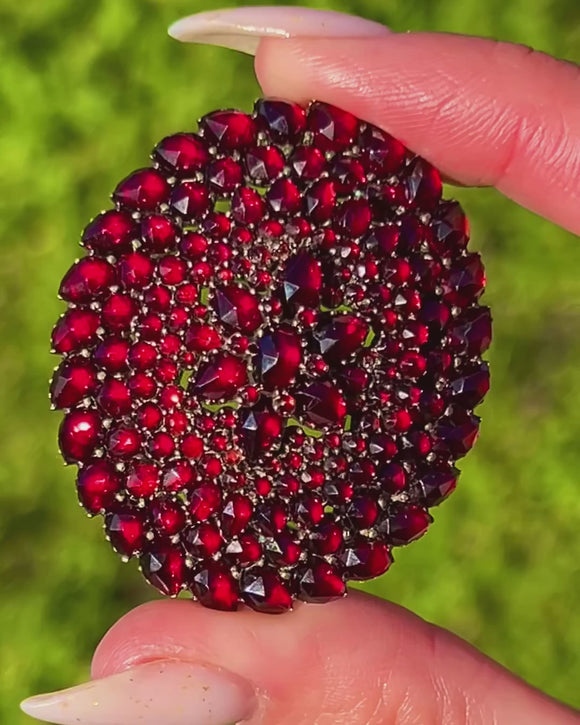 深みのあるざくろ色の輝きを放つこの印象的なVictorianブローチ兼ペンダントは、緻密に留められたガーネットが織りなす逸品です。盛り上がったクラスターは、同心円状の花模様に配され、中央には星形の意匠が施されています。周囲には洋梨形の石が波状に縁取られ、贅沢なVictorianの存在感を首元や襟元で美しく際立たせます。