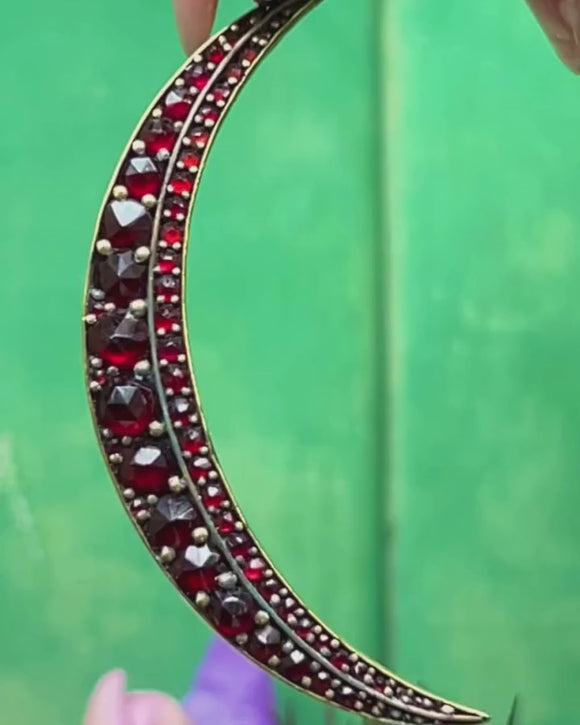 EXCELLENT. This antique Garnet crescent moon pendant is gorgeous! In excellent condition, every Garnet is present and secure, with beautifully hand-cut facets. The back of the pendant is smooth and has only a small sign of conversion from a brooch. This is a gorgeous pendant that will give you much wearing pleasure for years to come!