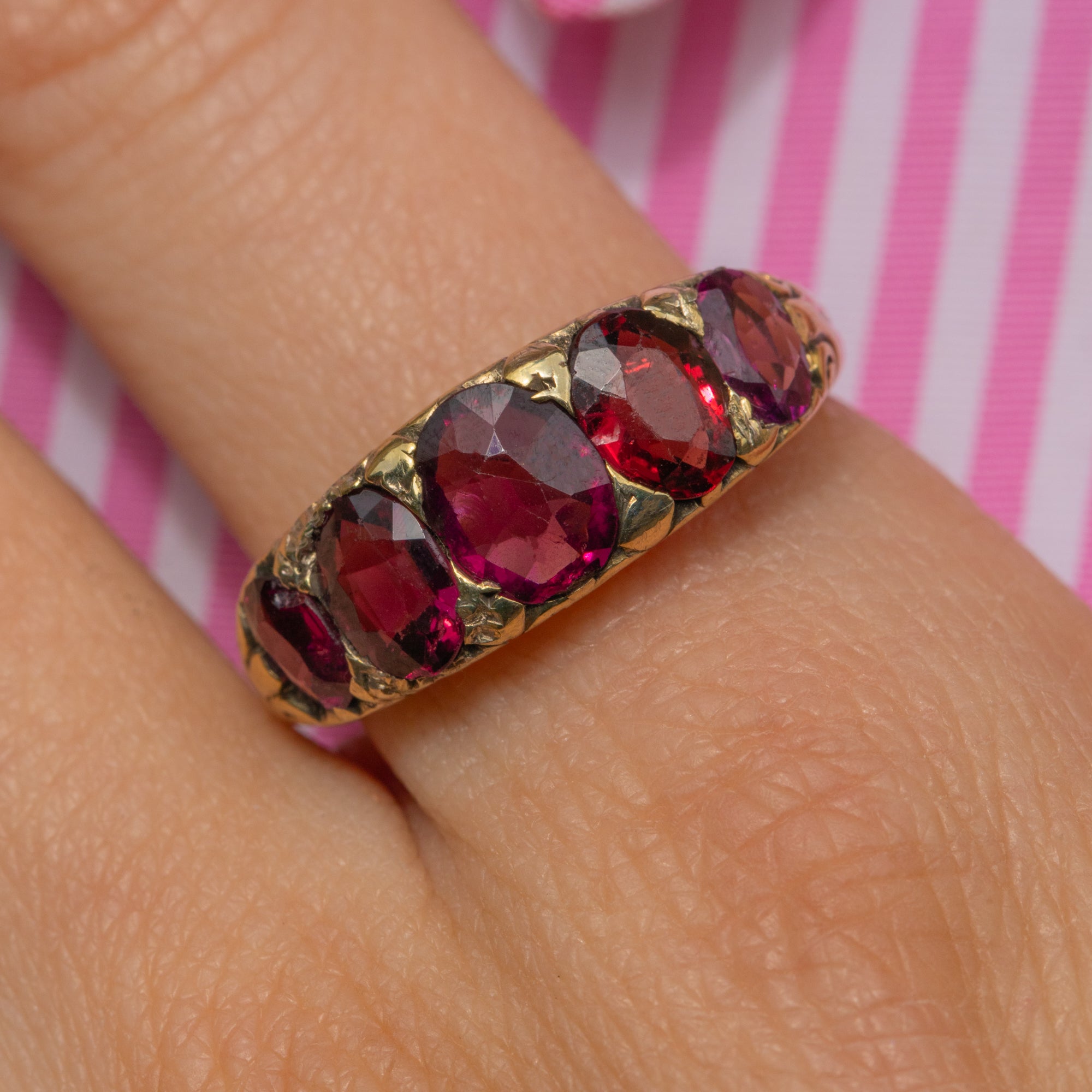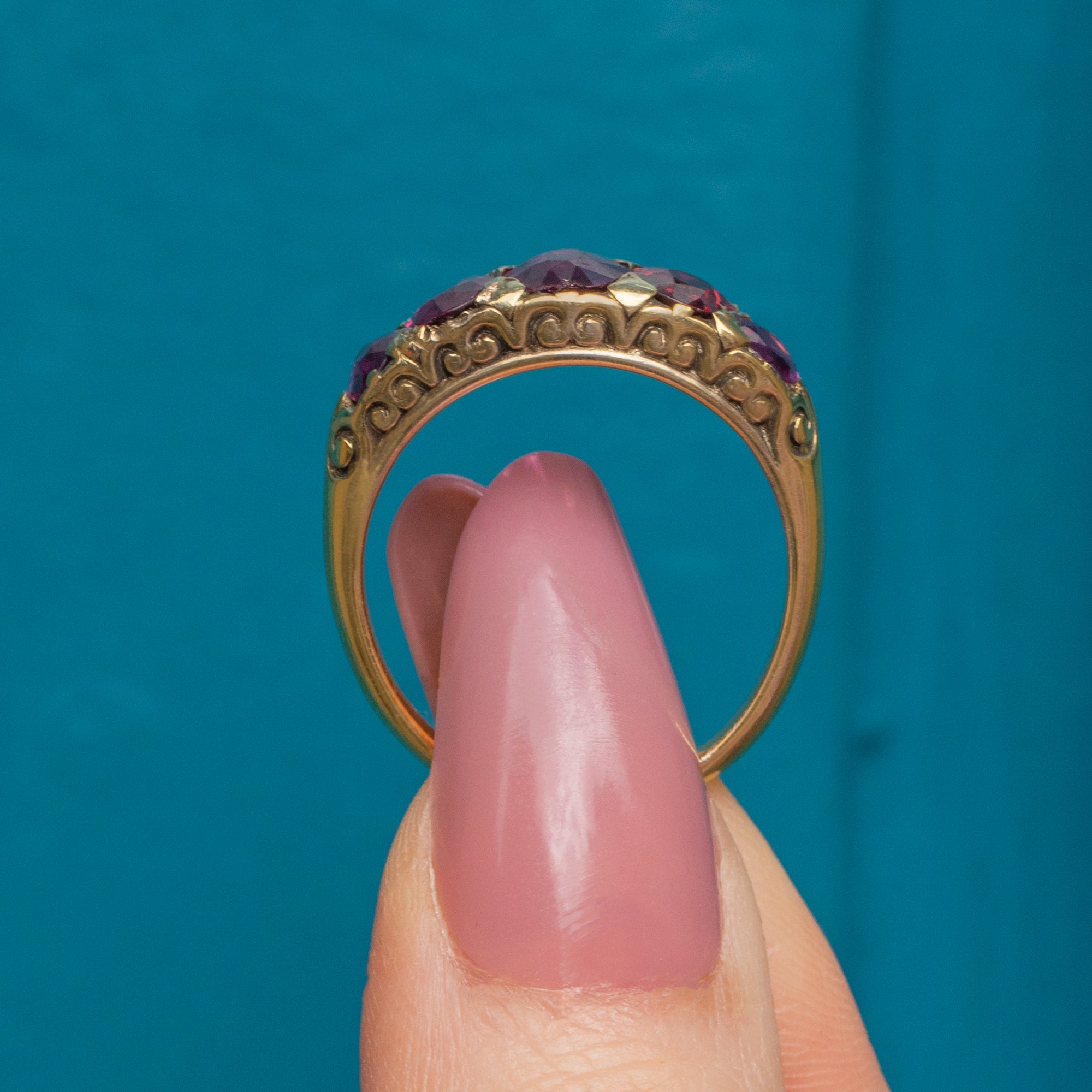 Plucked straight from the 19th century, this antique Garnet five stone ring is full of character! The Garnet gems flaunt a myriad of plum hues that dance between her facets, accompanied by scrolled shoulders for a decorative finish.