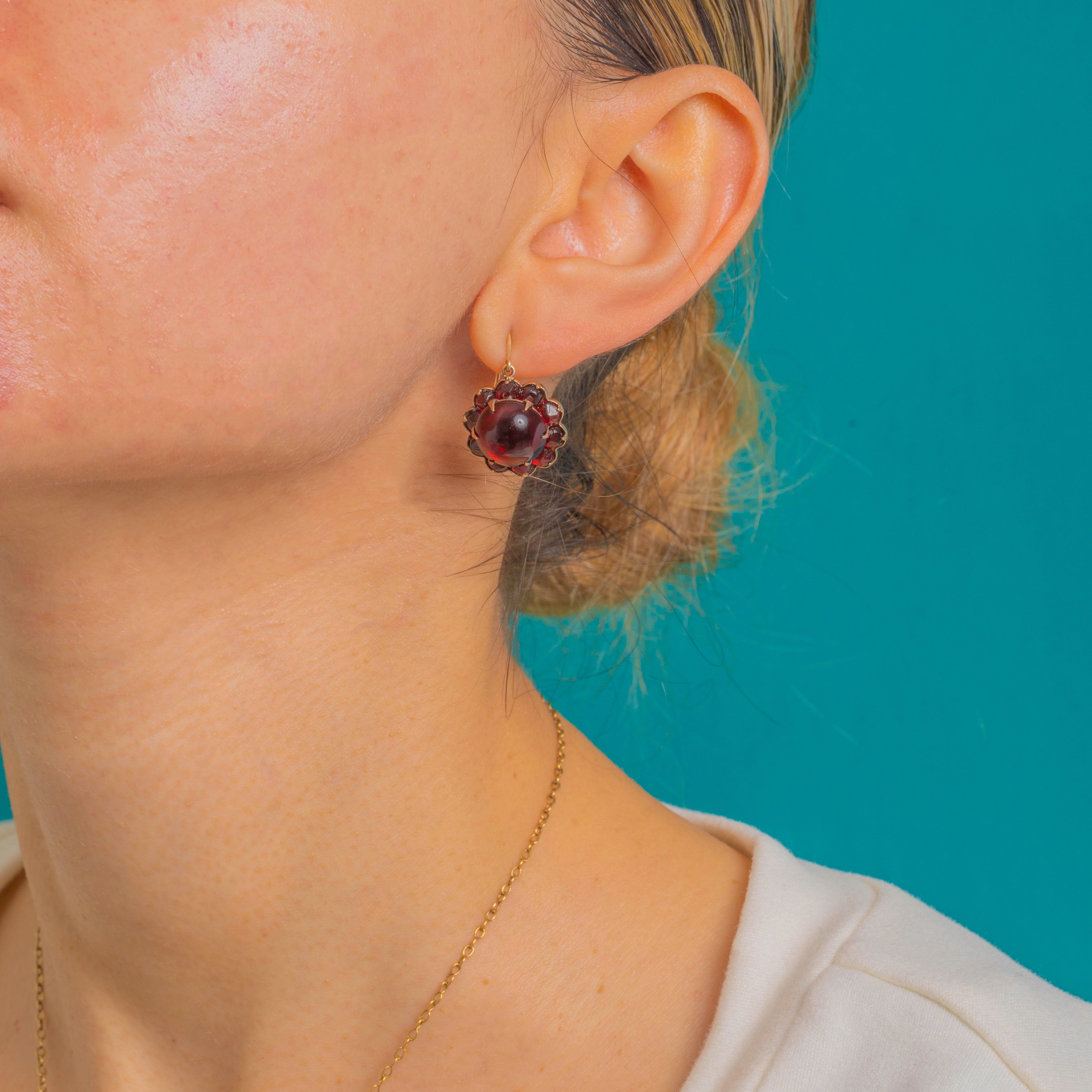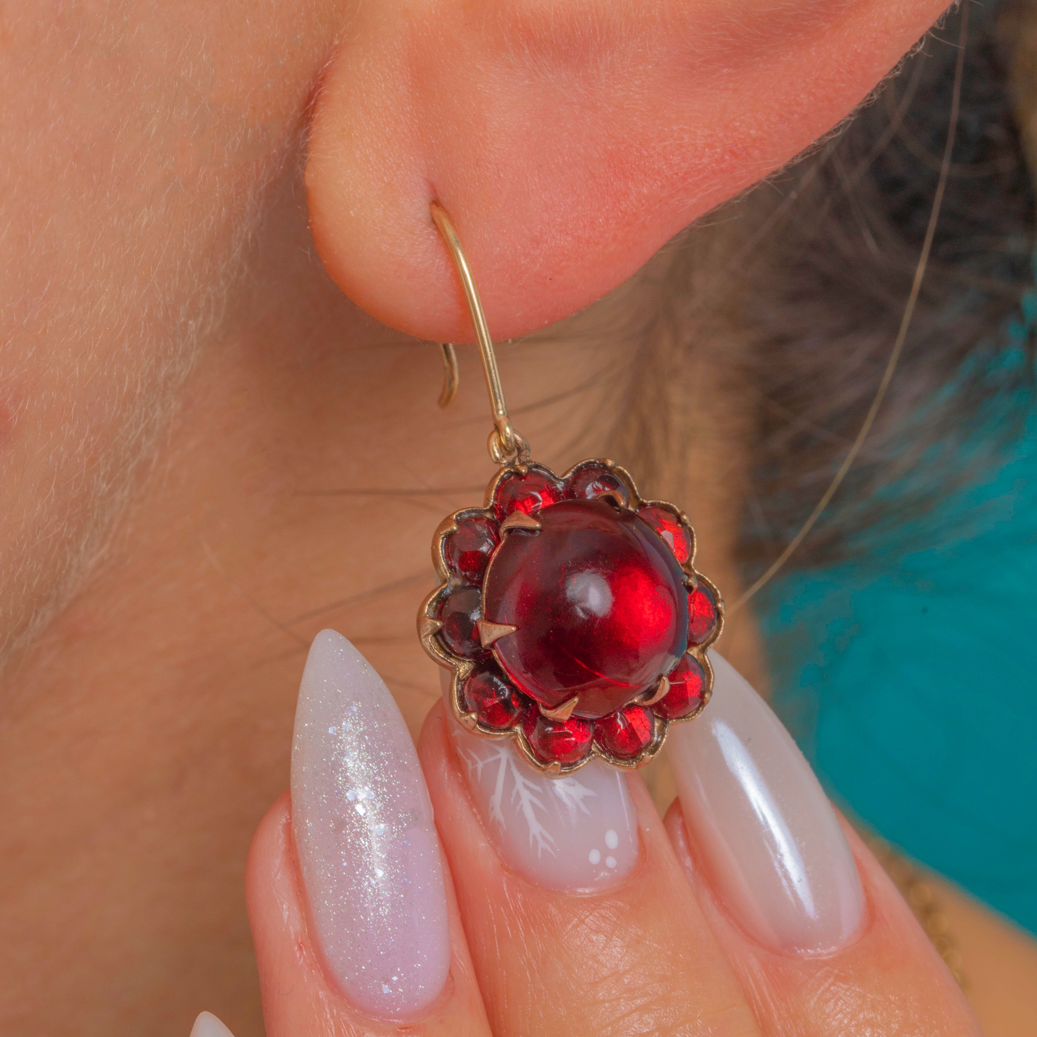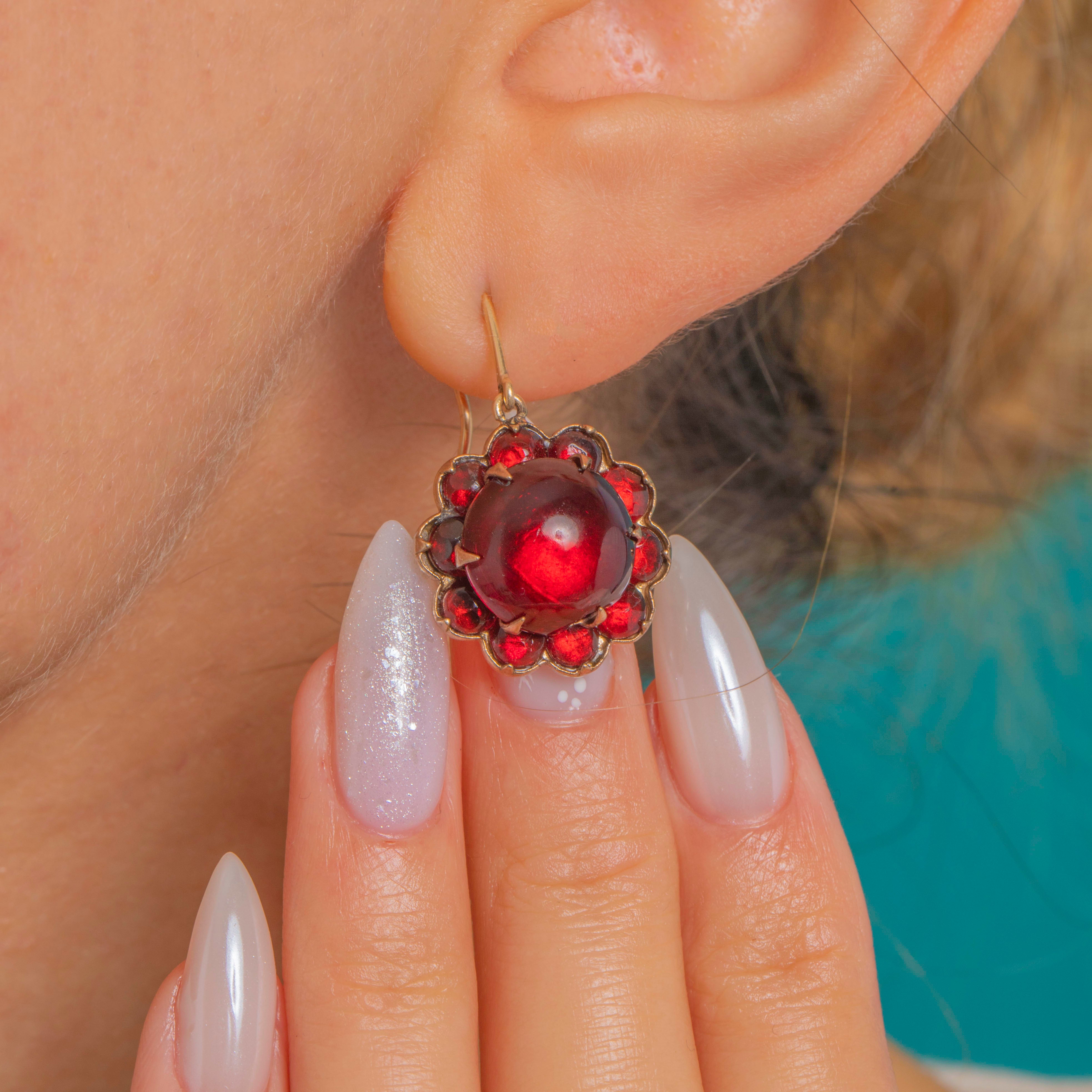 Romantic and richly toned, these Victorian rosette drop earrings bloom with deep wine-red Garnet glass. A high-domed central cabochon is framed by a tight halo of graduating red stones in scalloped collets, all glowing against warm Gold-toned metal. They sway from classic 9ct Gold shepherd hooks, bringing an elegant antique flourish to every look.