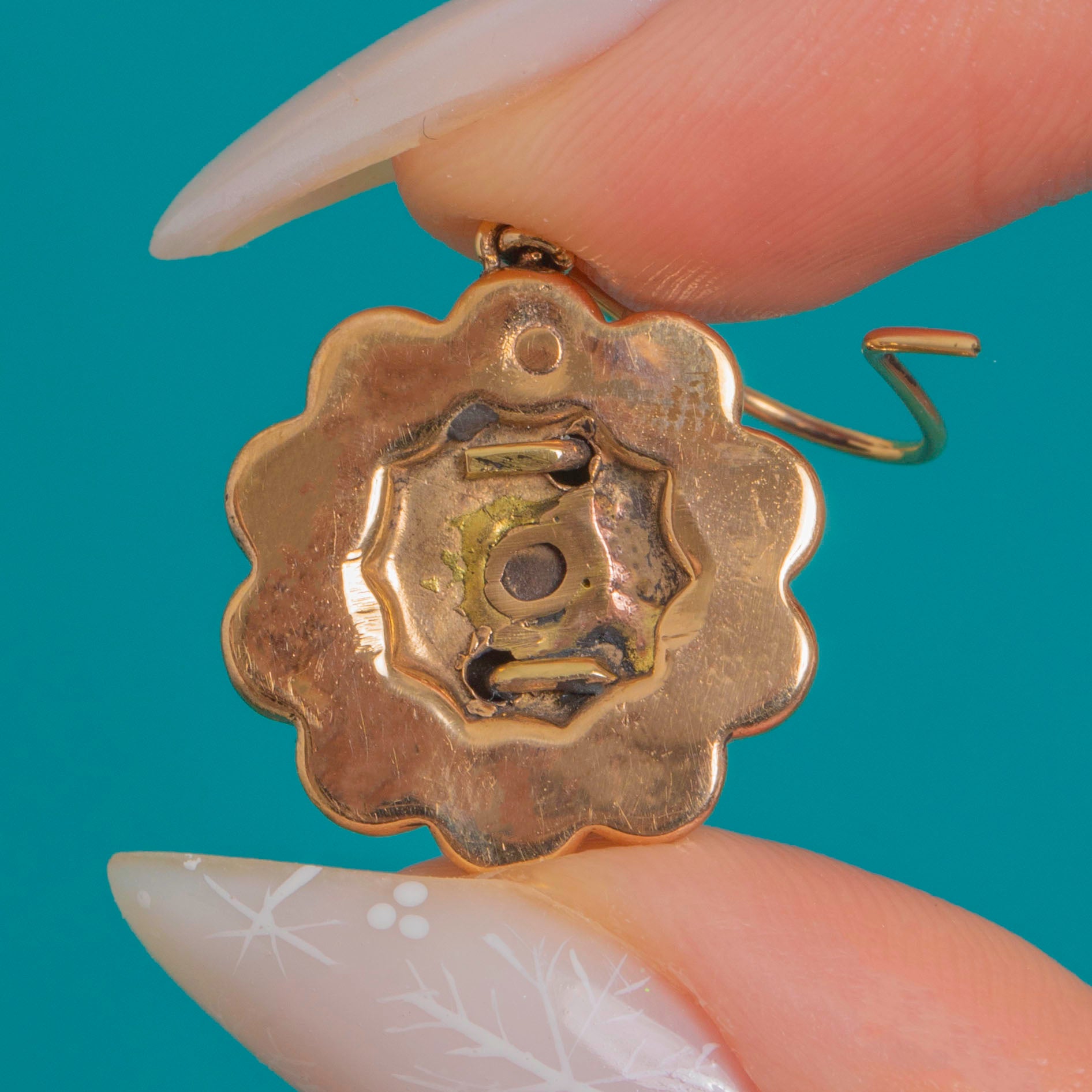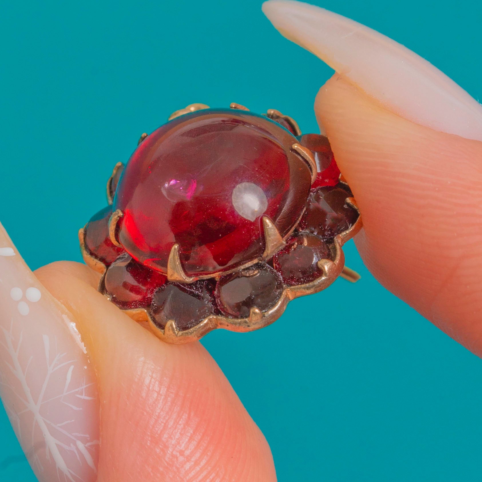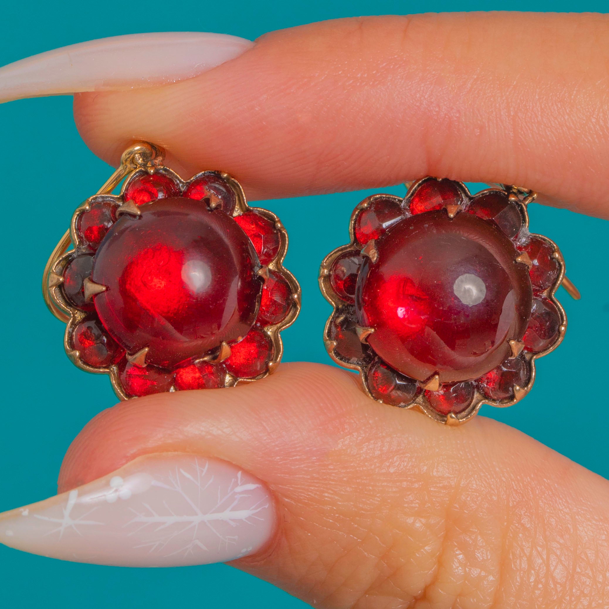 EXCELLENT: Garnet glass is bright with light surface abrasions to the domes; the halo shows minor wear and subtle colour variation consistent with age. Settings and claws are intact and secure, with tool marks and solder visible to the reverse from hand fabrication; ear wires show a slight bend but function well. Well cared for overall with no losses or structural issues observed.