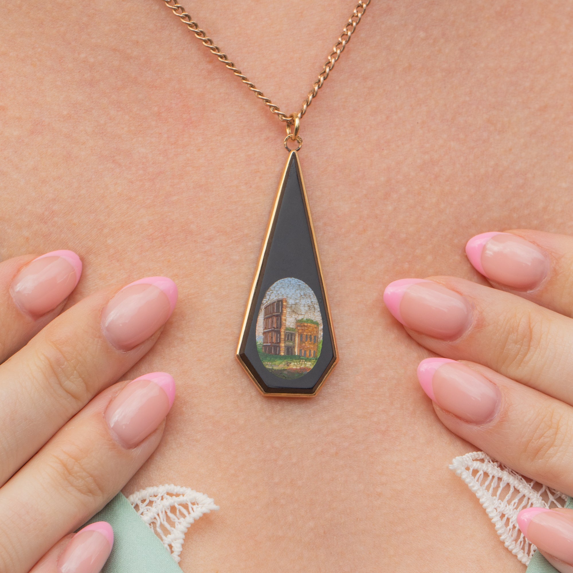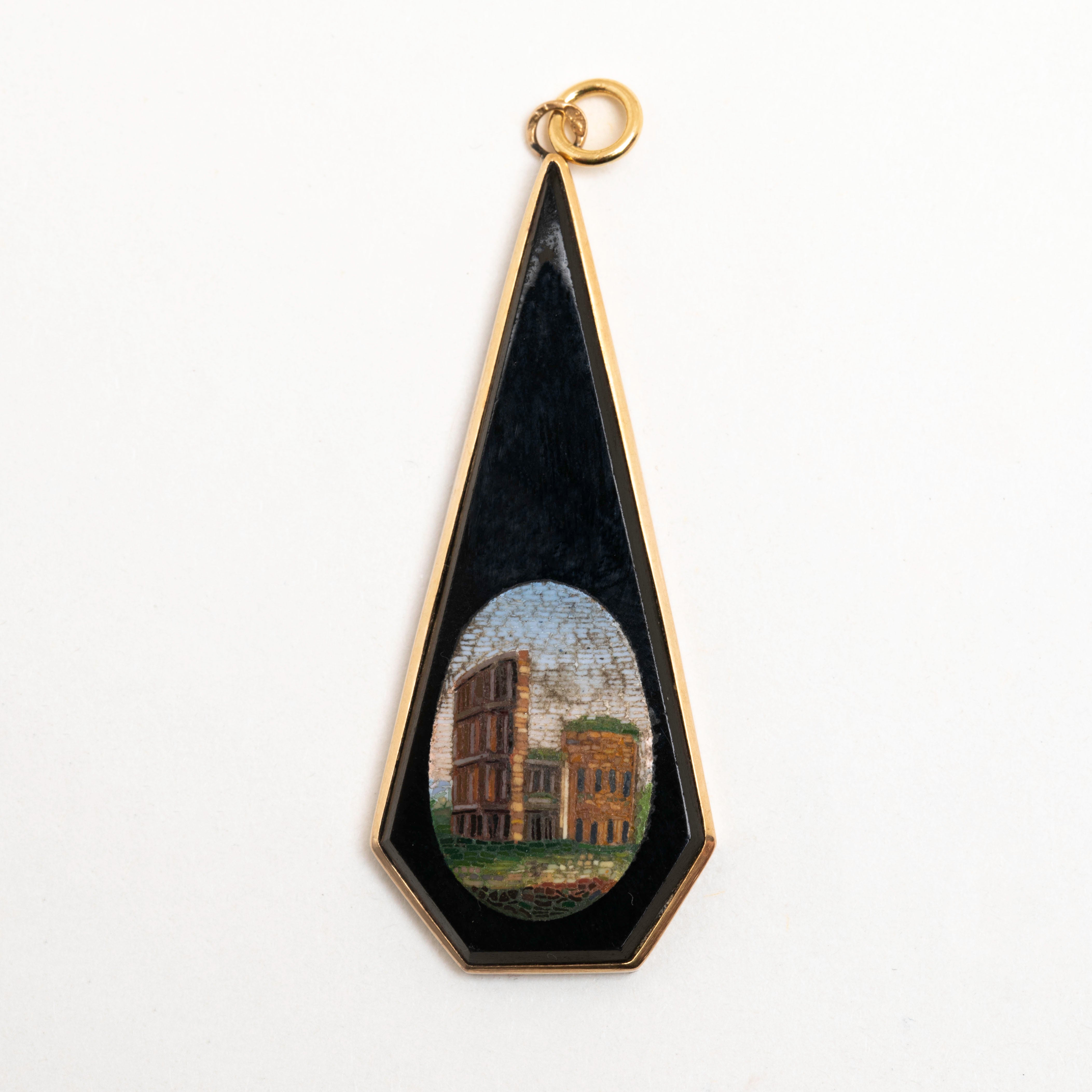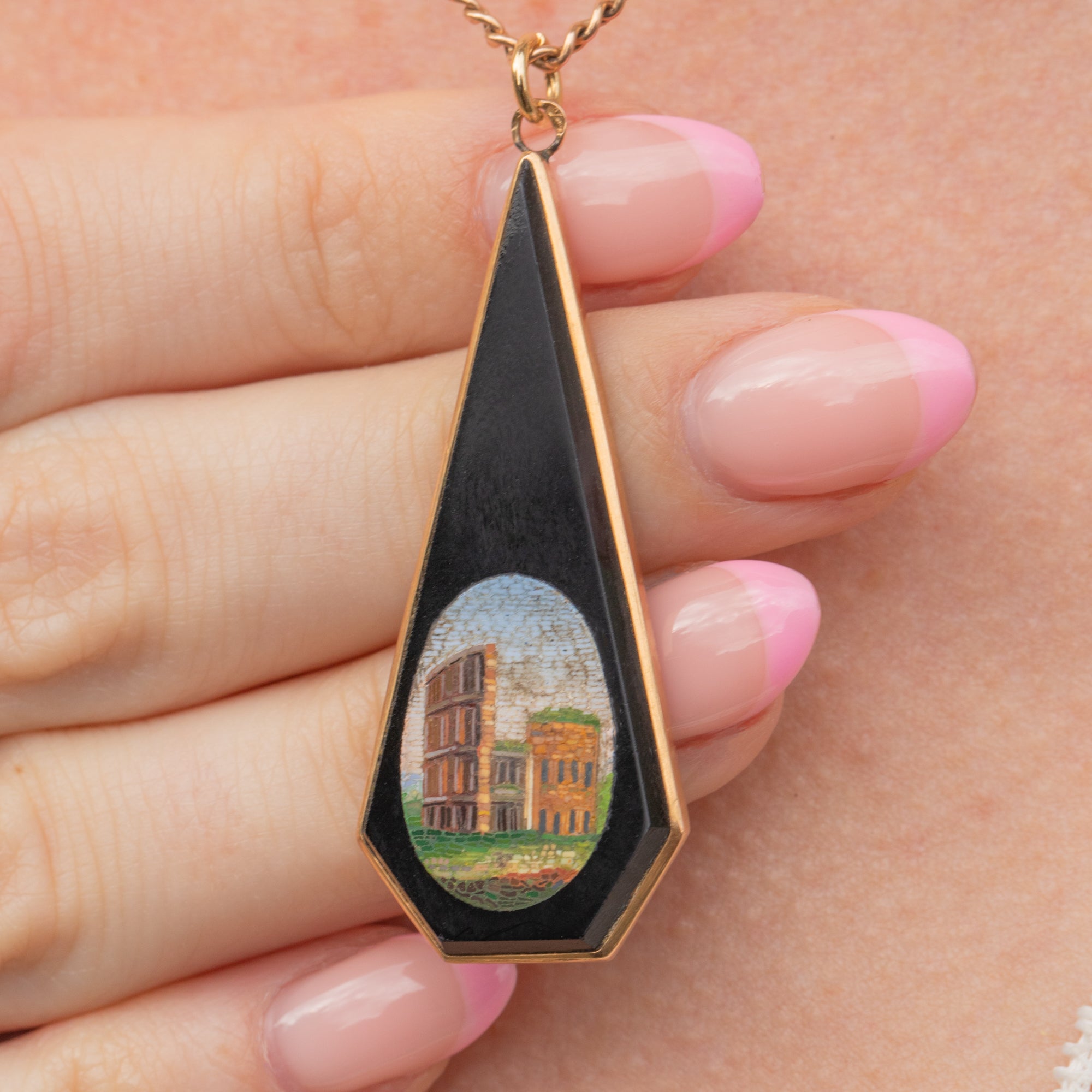 Antique Italian 18ct Gold Onyx Micro Mosaic Pendant, Rome Colosseum