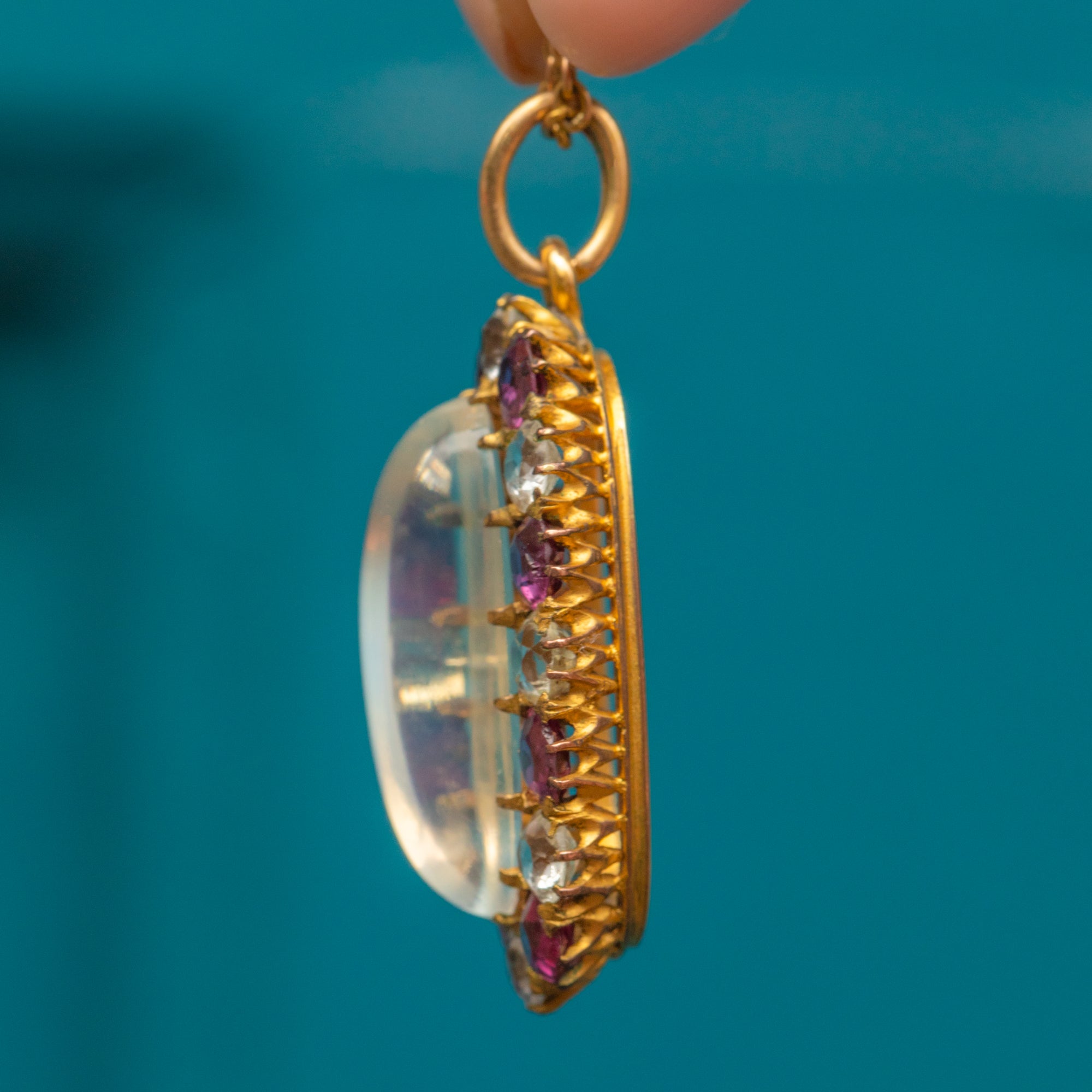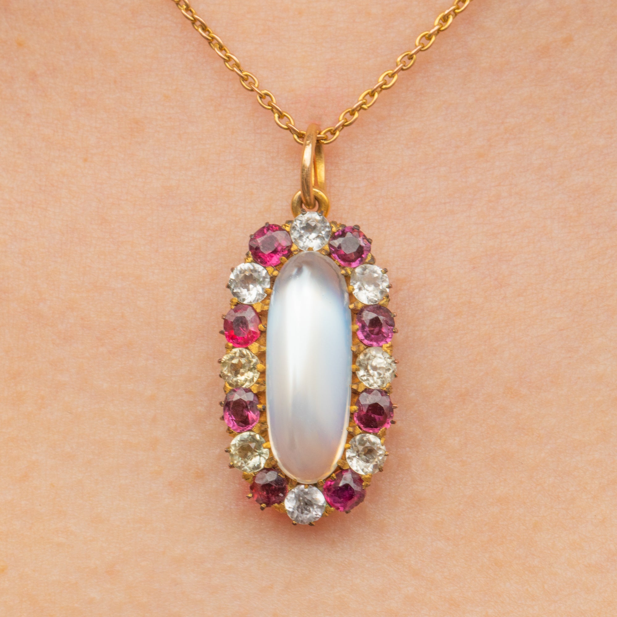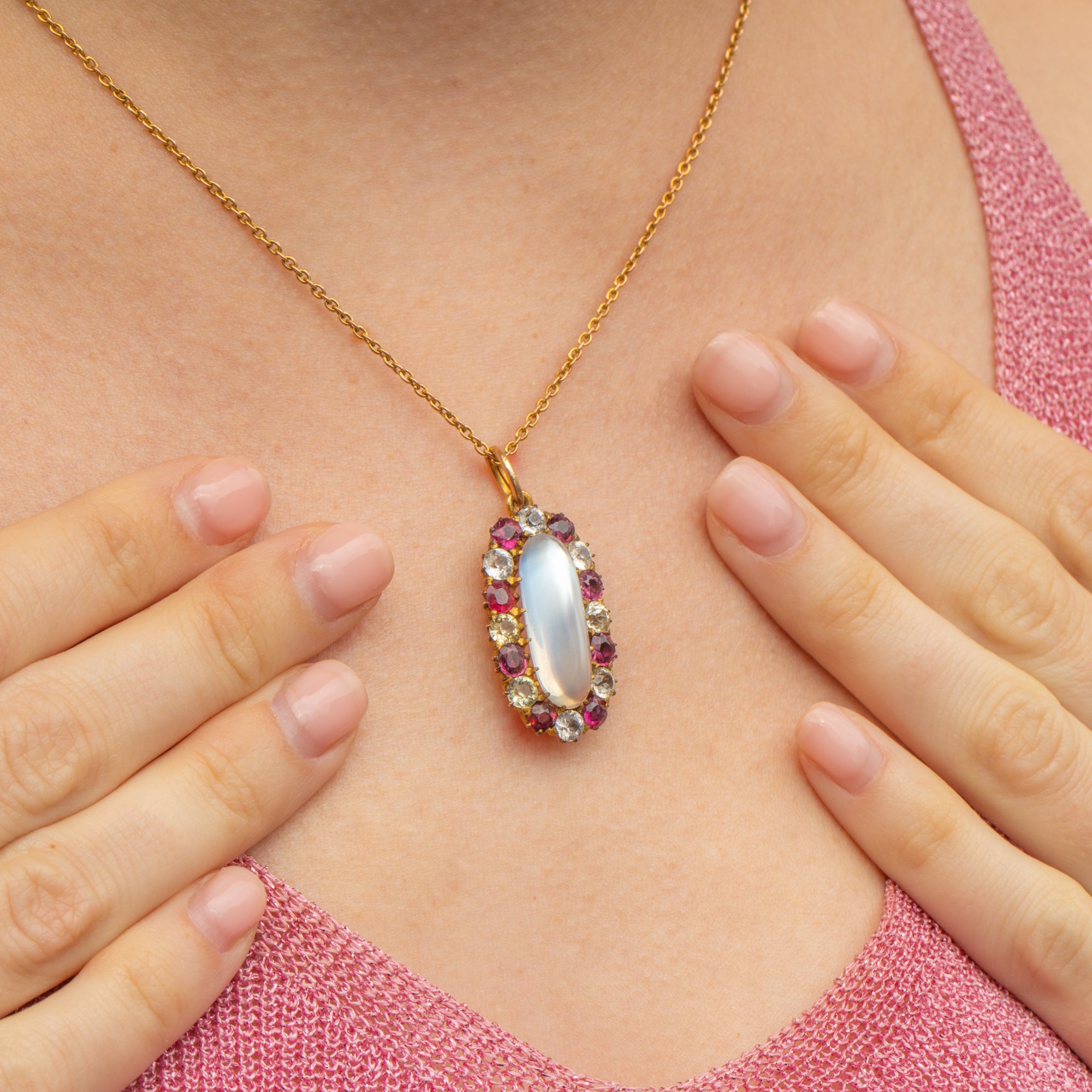 Fuchsia-hued Rubies and white Sapphire gemstones halo the Moonstone, creating a mouthwatering combination. This delectable pendant is bursting with colour; she will make a splendid addition to your antique jewellery collection!