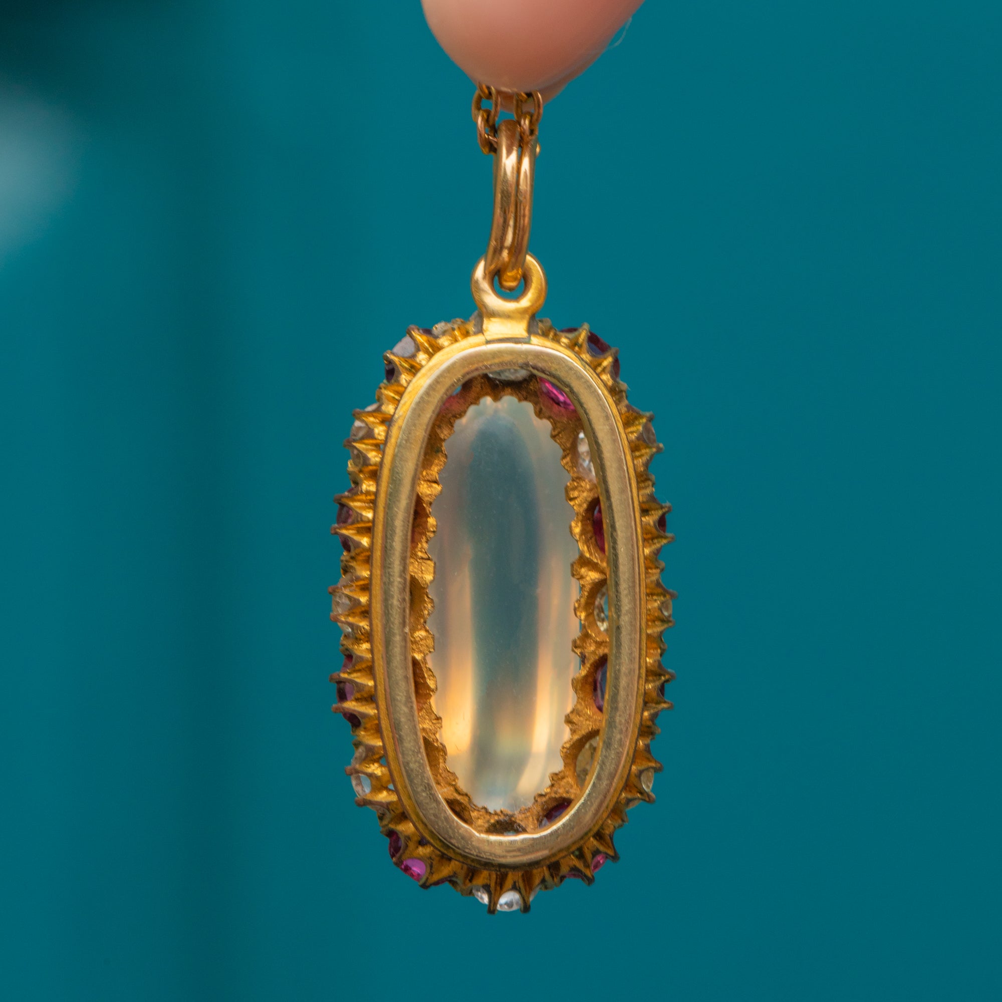 We adore this antique Moonstone Ruby & white Sapphire Cluster pendant! The sleek 5.70ct Moonstone cabochon captures the eye with its mystical moonlight hue, displaying a magnificent silver schiller under the light.