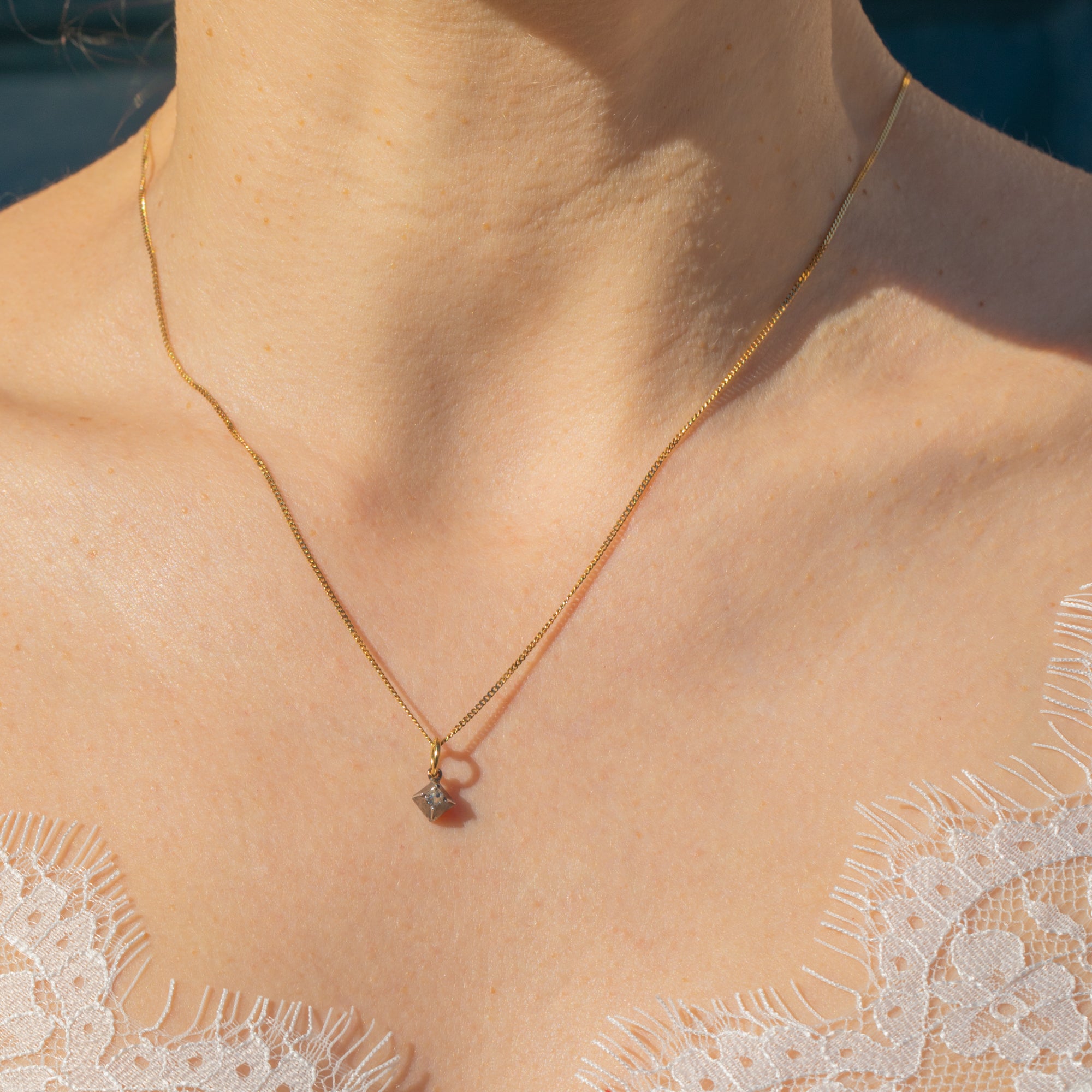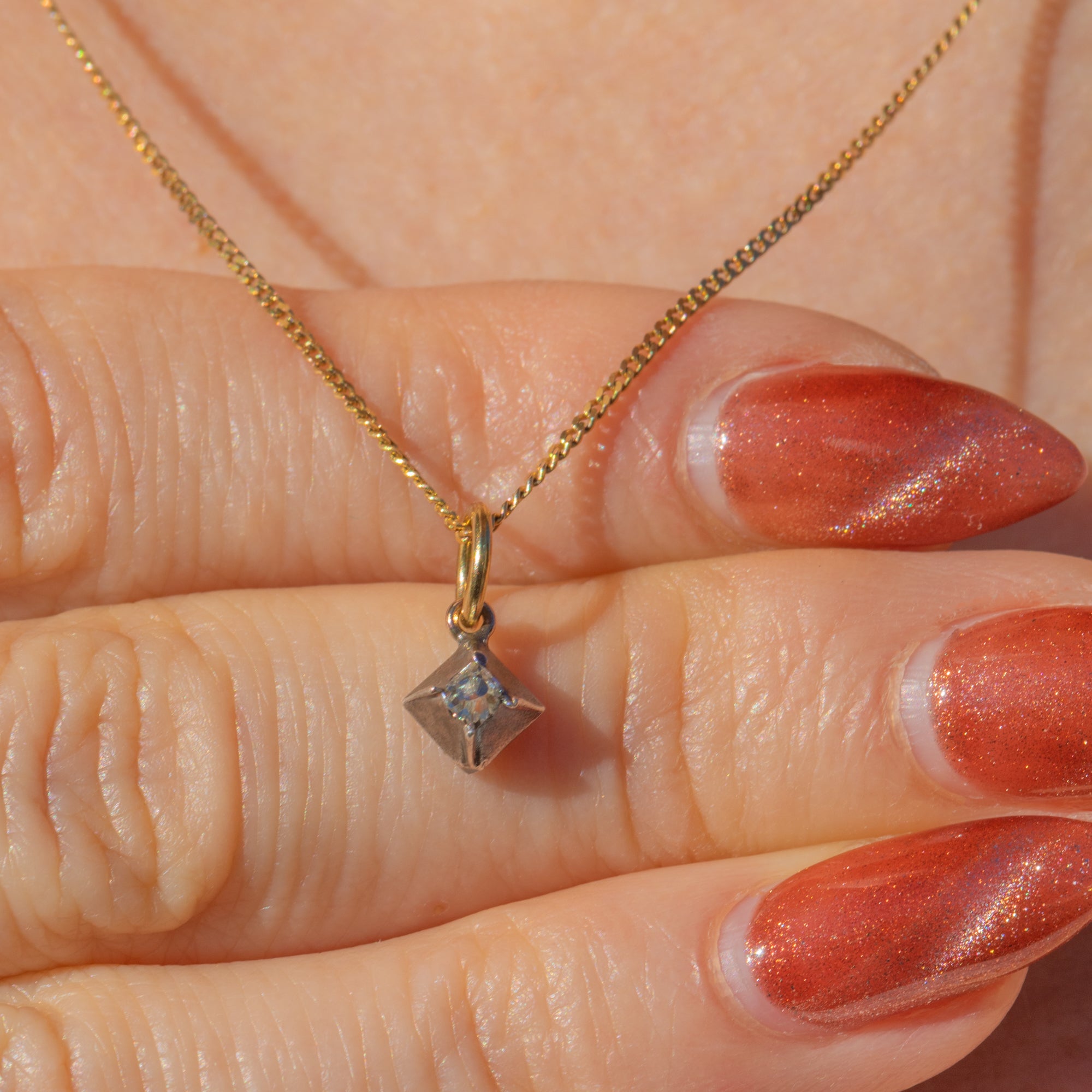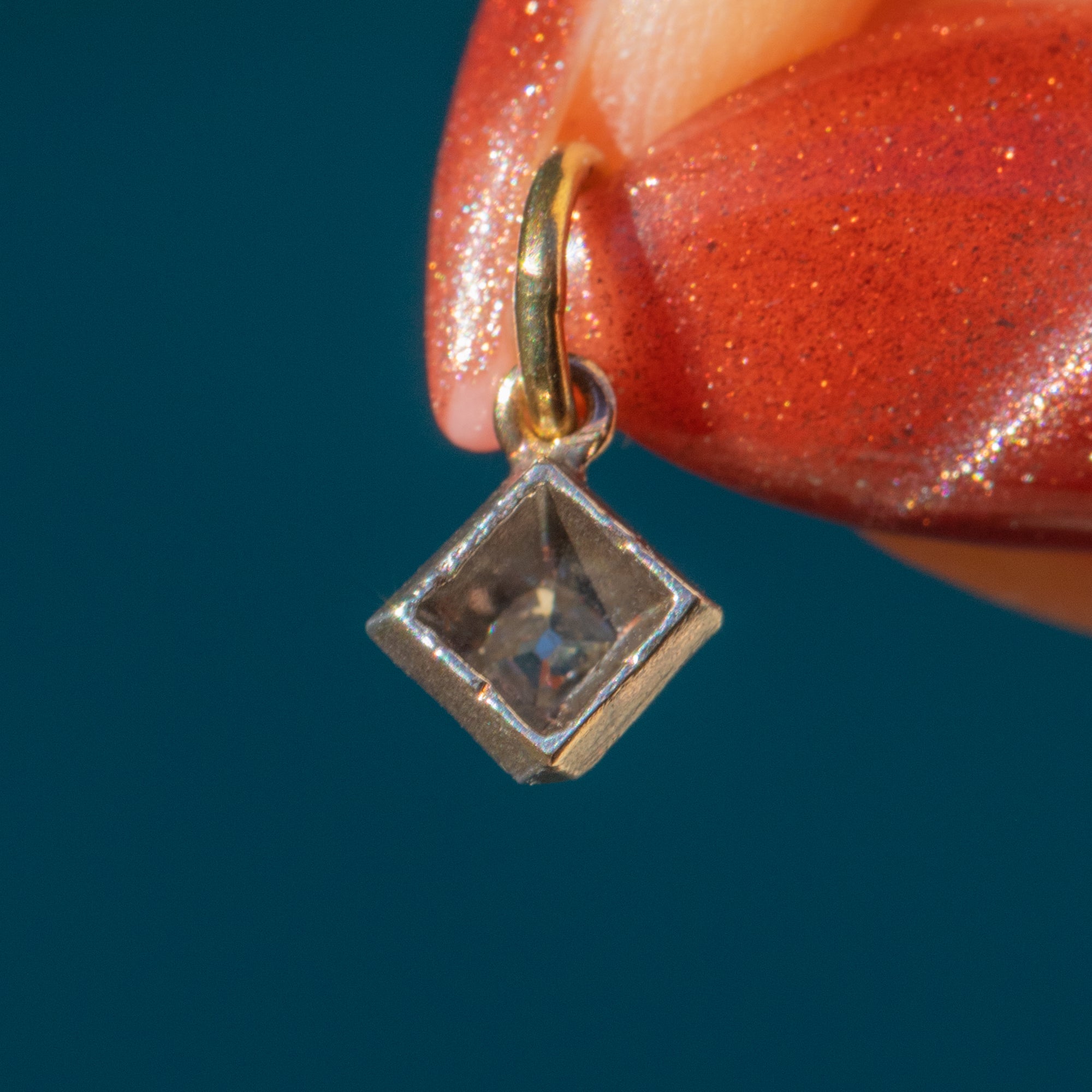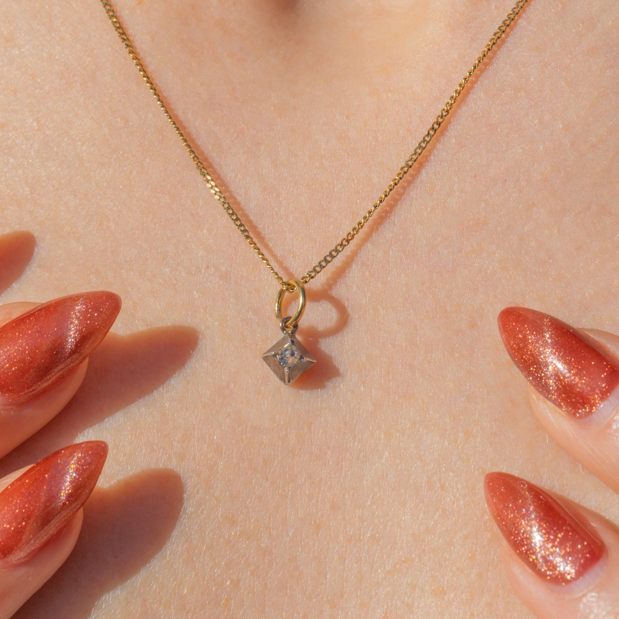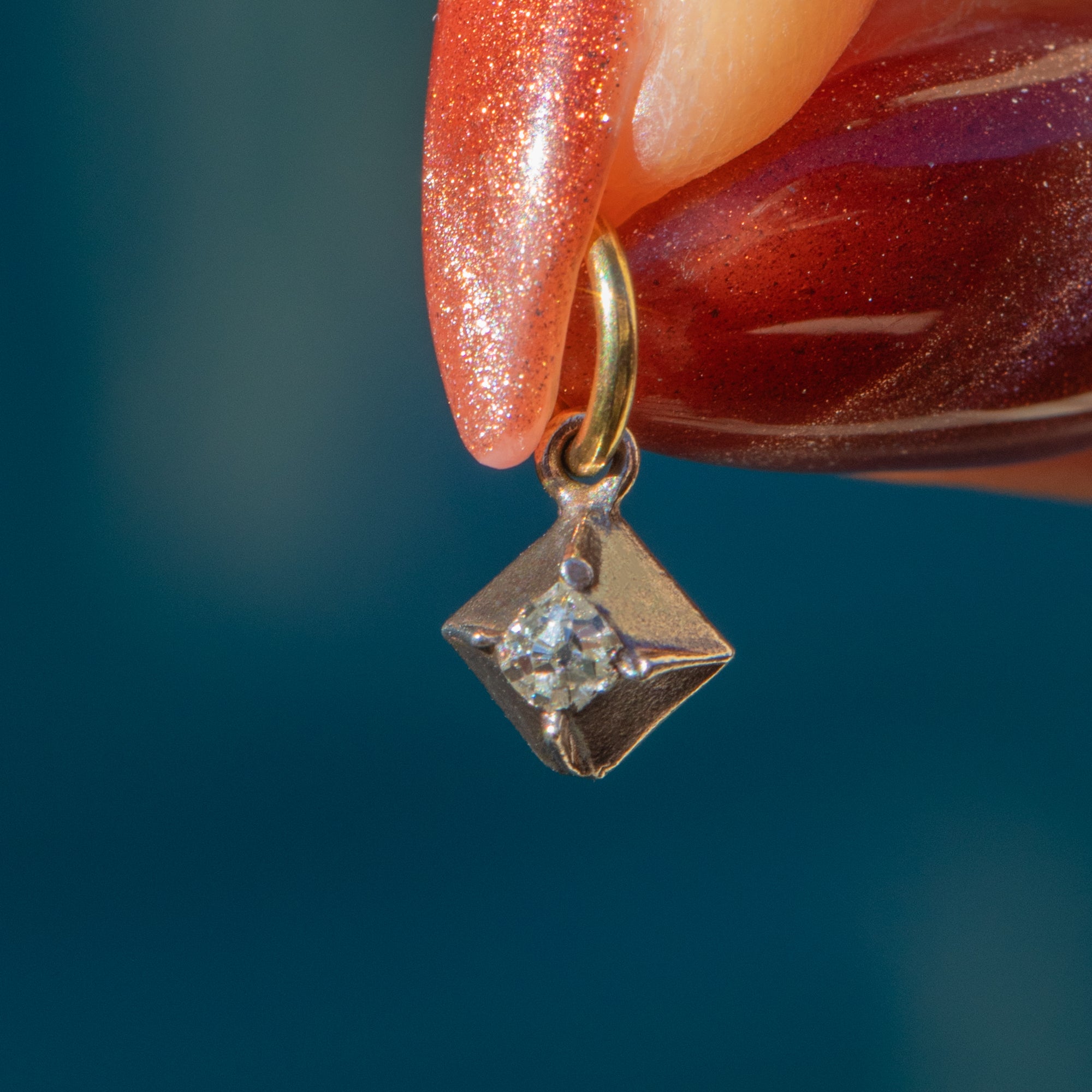 EXCELLENT. With no chips or fleabites, this antique old-mine cut Diamond charm is in excellent condition! She is securely held within a collet setting and is guaranteed to last a lifetime. The Diamond is radiant as ever! Incredible, especially when considering her age!