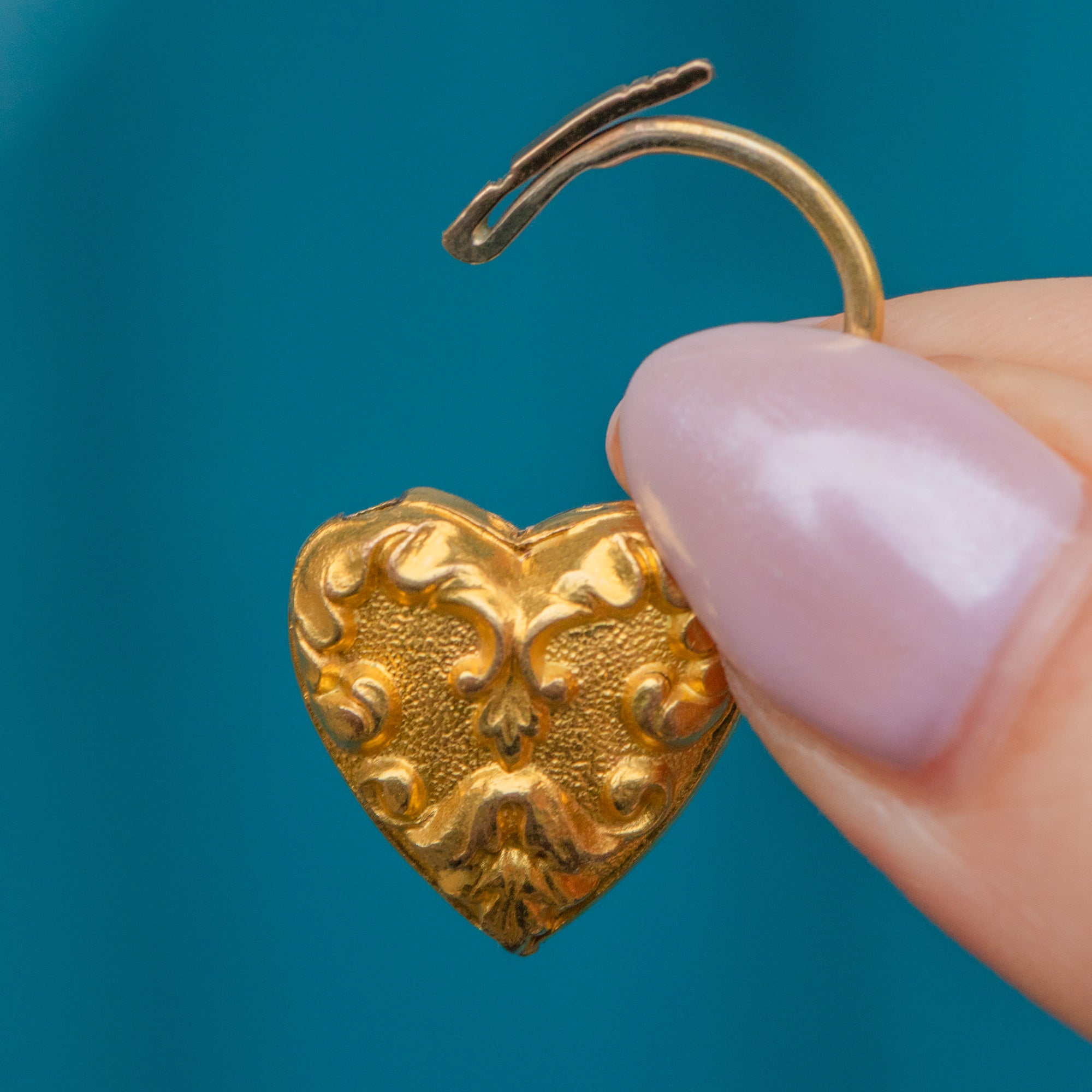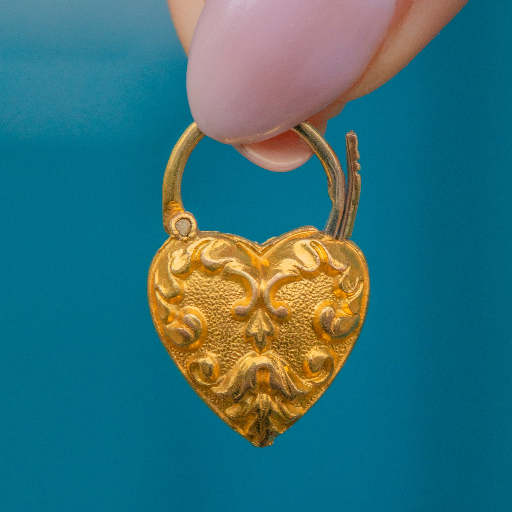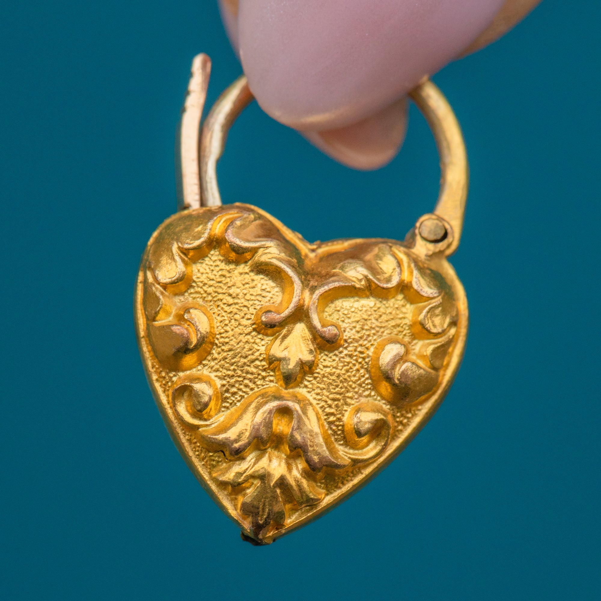 We can't get enough of this antique Pinchbeck repoussé heart padlock pendant! A snippet of history, she is formed entirely of Pinchbeck, a Metal that was at the height of popularity due to its close resemblance to Gold.