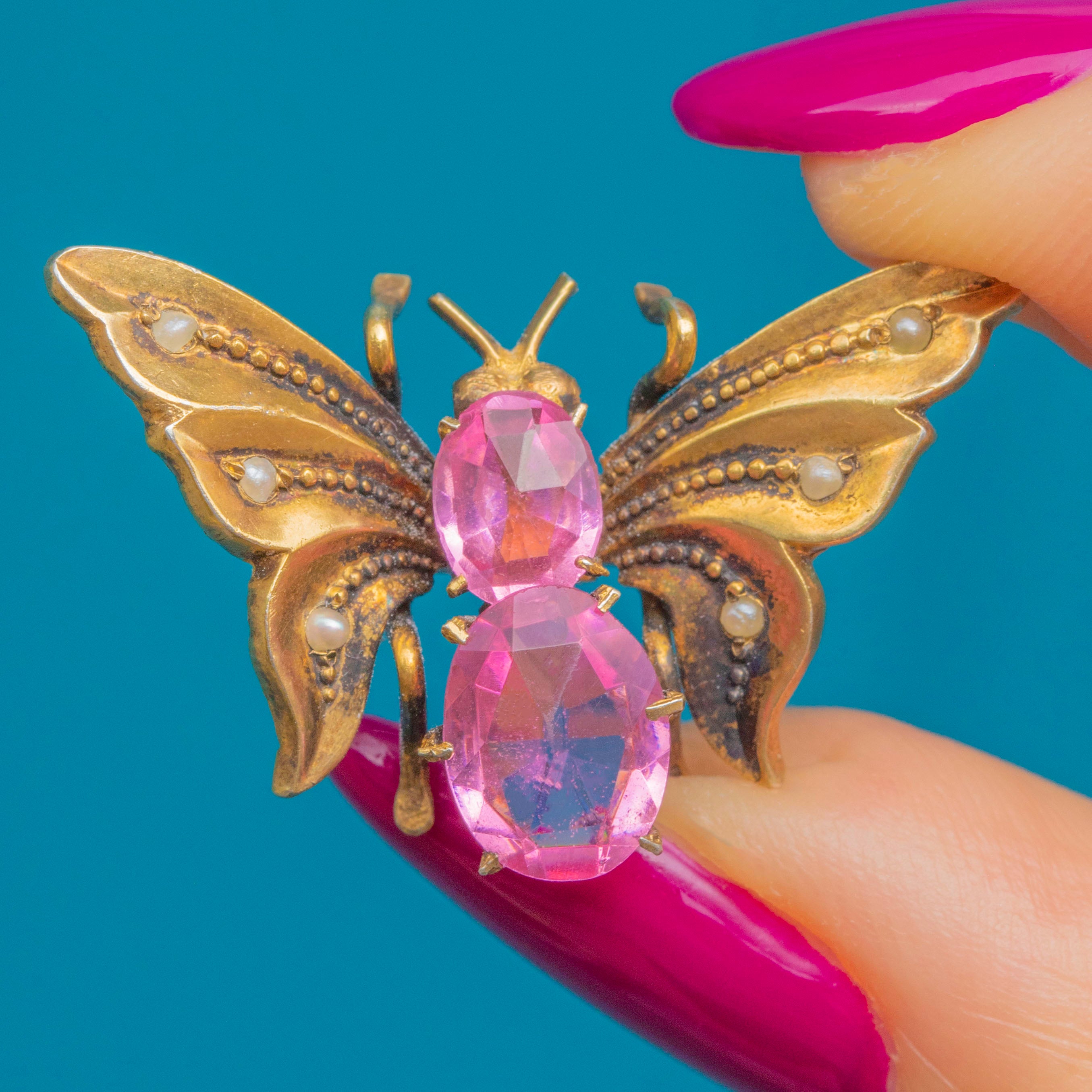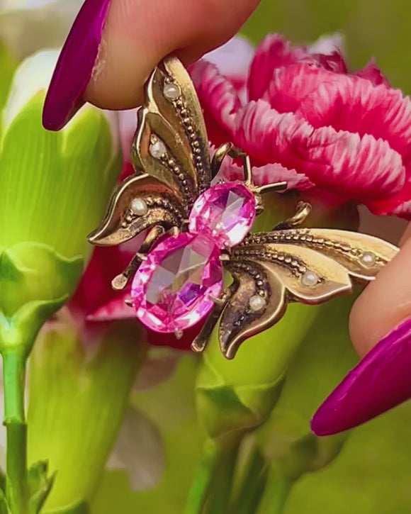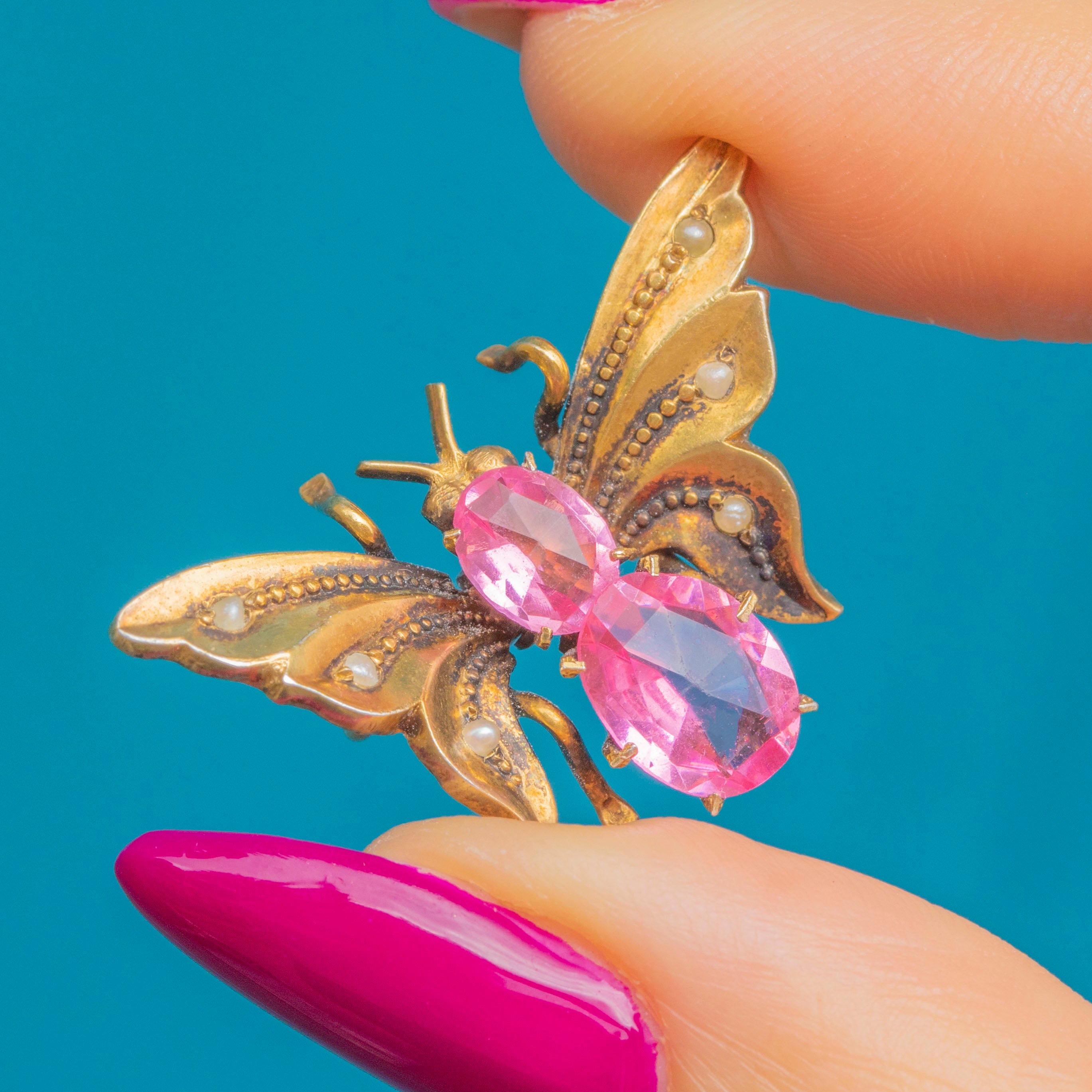 This cute Victorian butterfly hair clip is crafted from 800 Silver gilded with Gold, its rich saturation perfectly complemented by two blush pink Paste with dainty Seed Pearls accenting the wings.