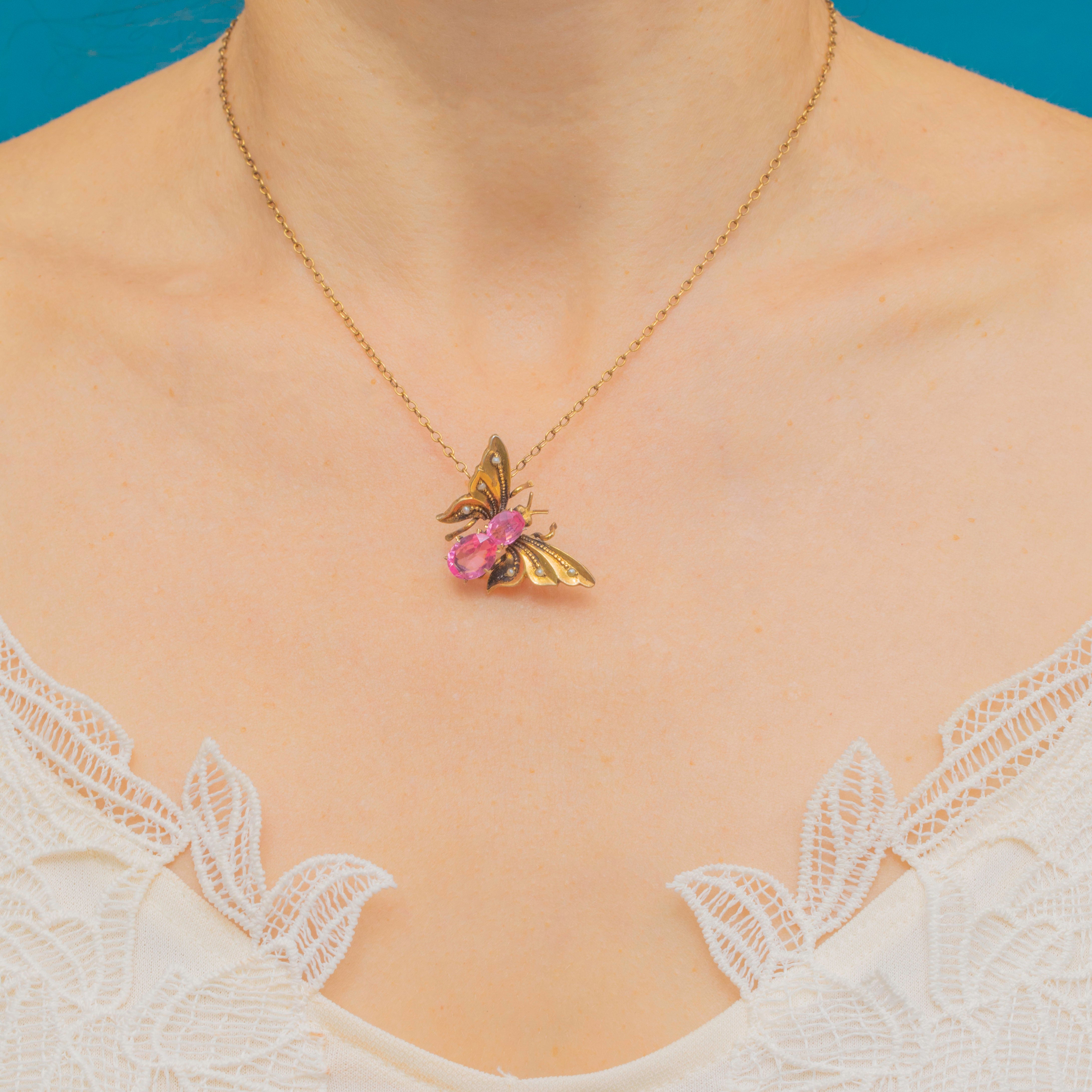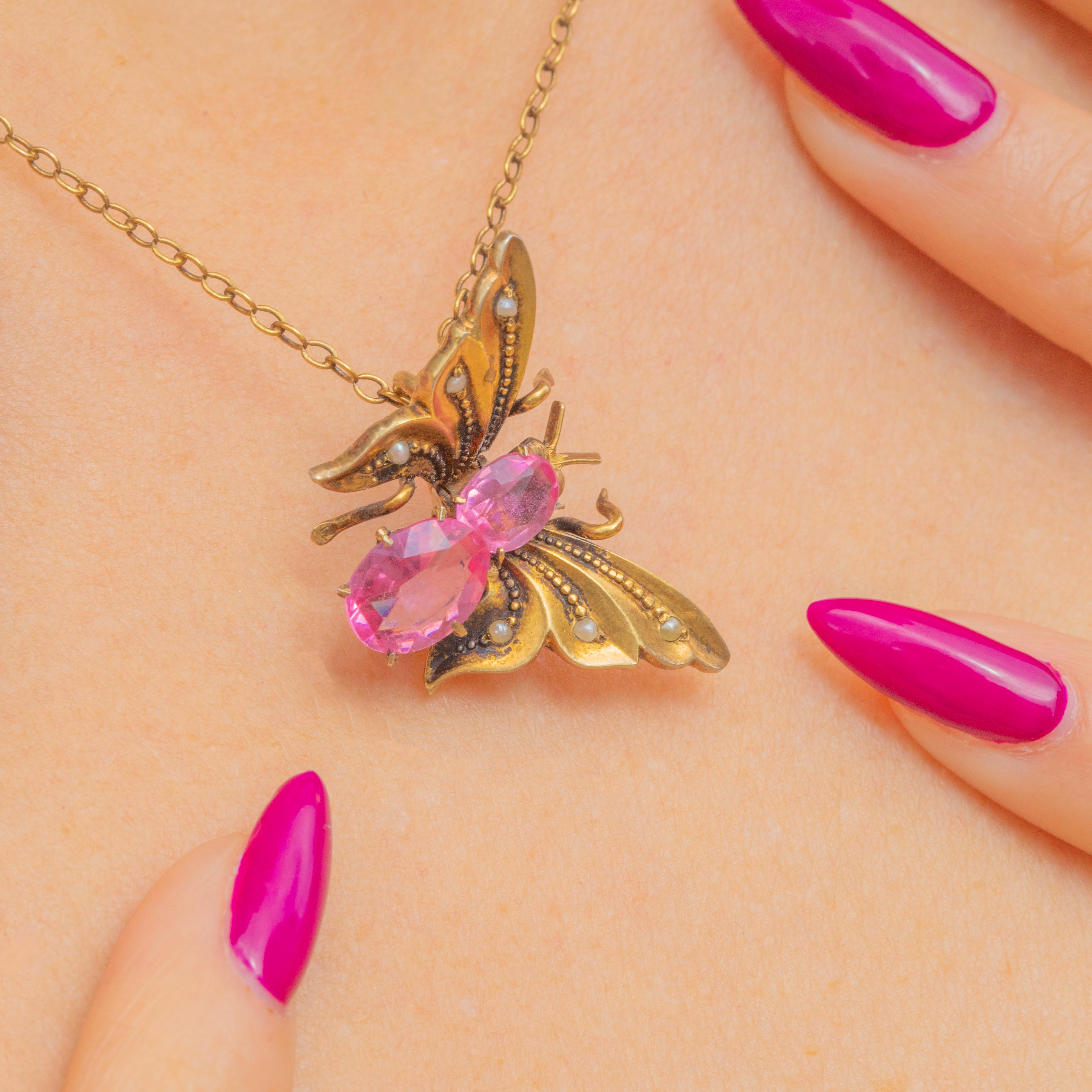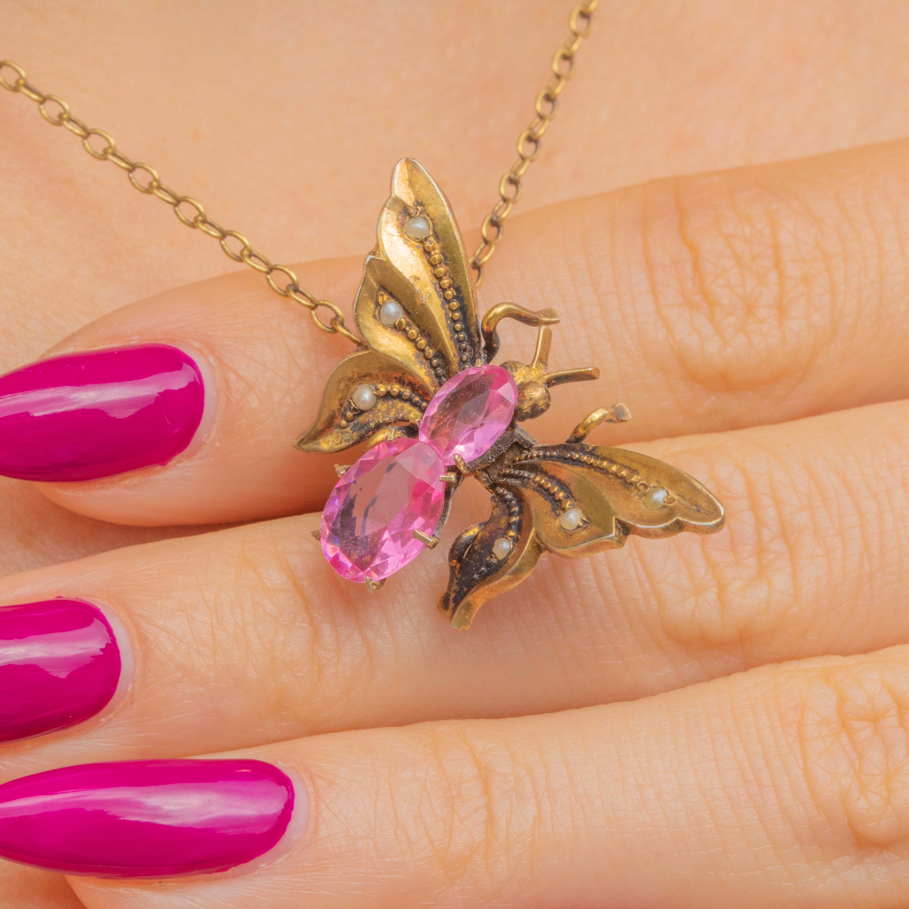 This cute Victorian butterfly hair clip is crafted from 800 Silver gilded with Gold, its rich saturation perfectly complemented by two blush pink Paste with dainty Seed Pearls accenting the wings.