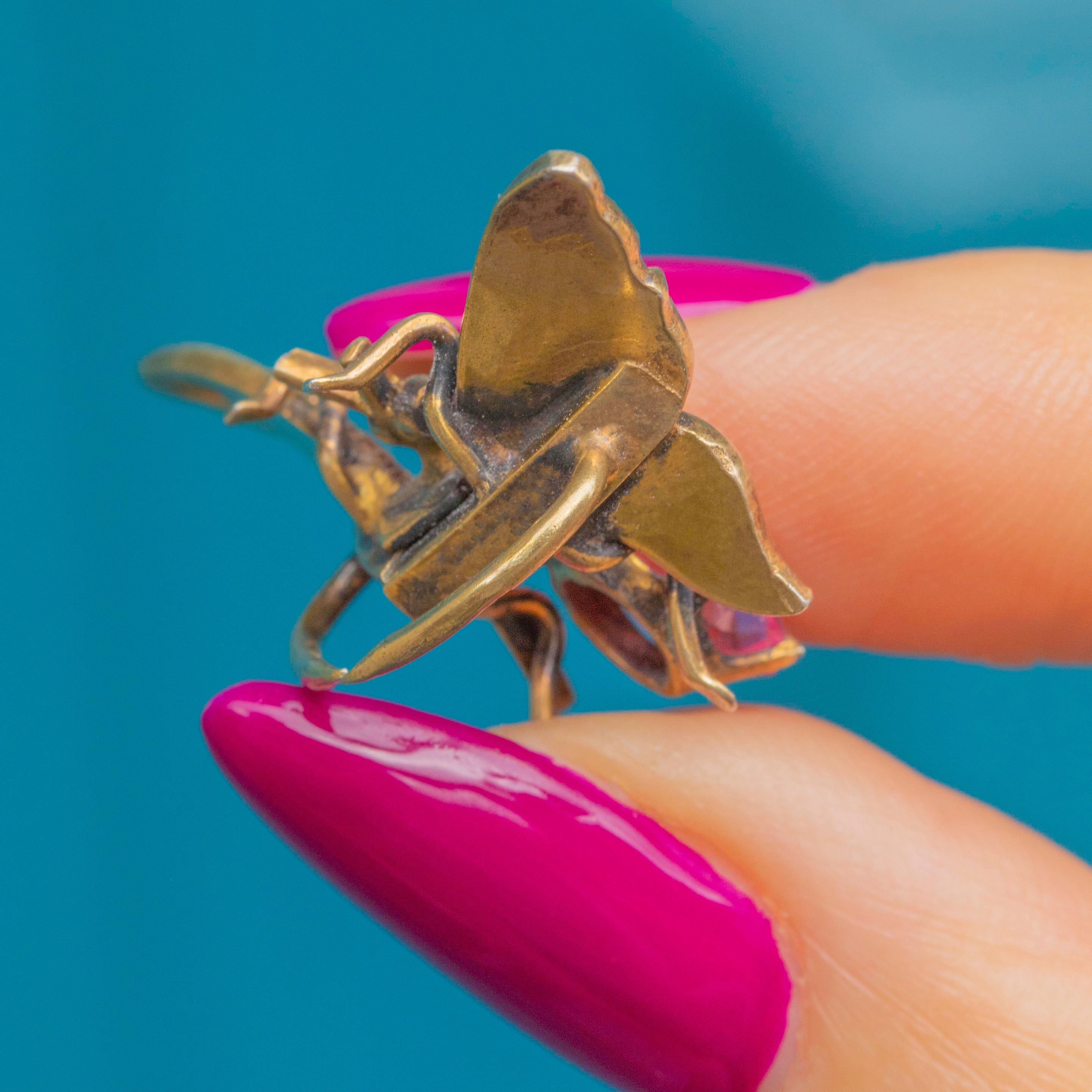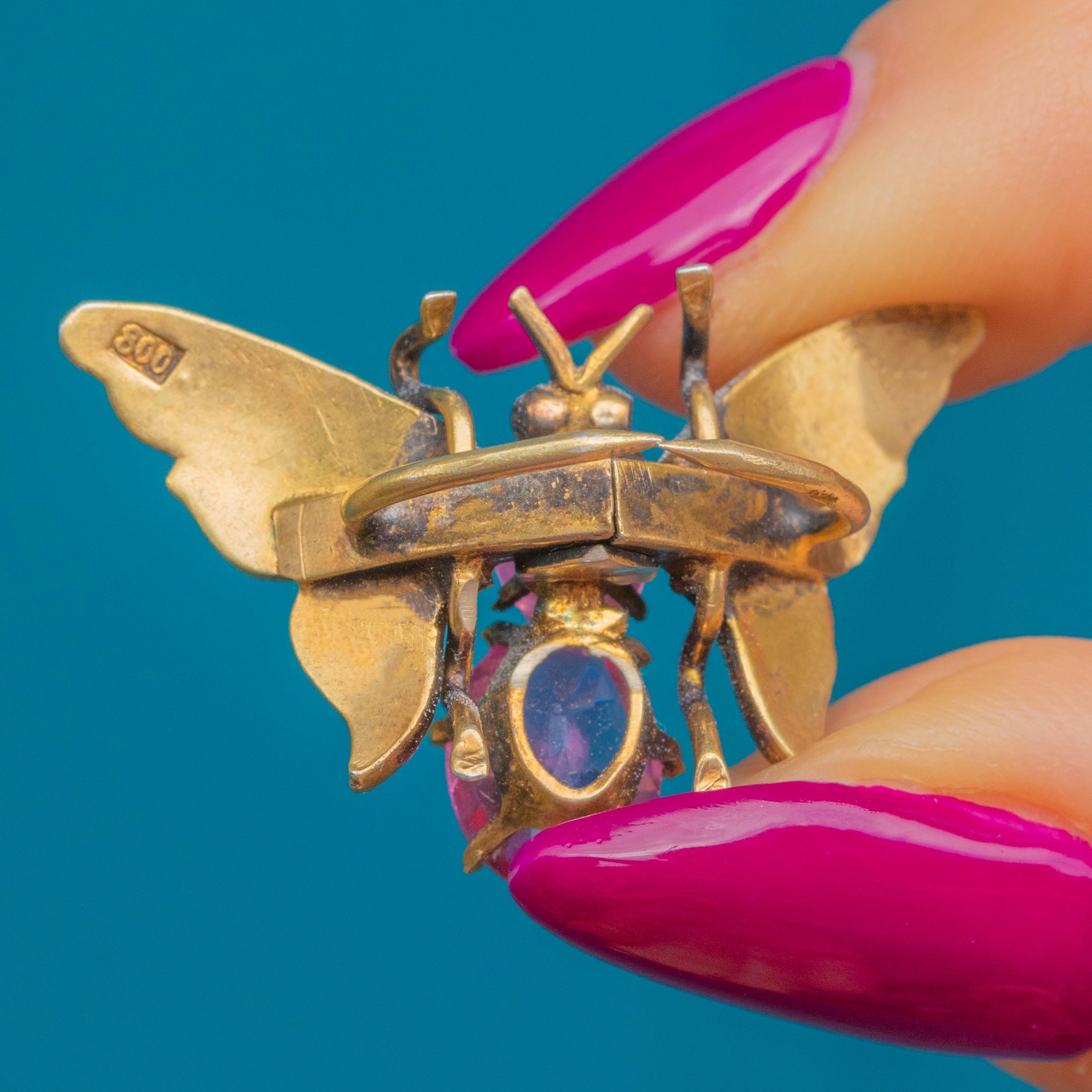 EXCELLENT: The Gold gilt has a deeply saturated hue with no signs of wear, and the body of the butterfly has held its form well. The gems are securely set, with no chips or cracks visible on the Paste. The claws are sharp, though we'd recommend not putting too much pressure on the clip as it might snap.