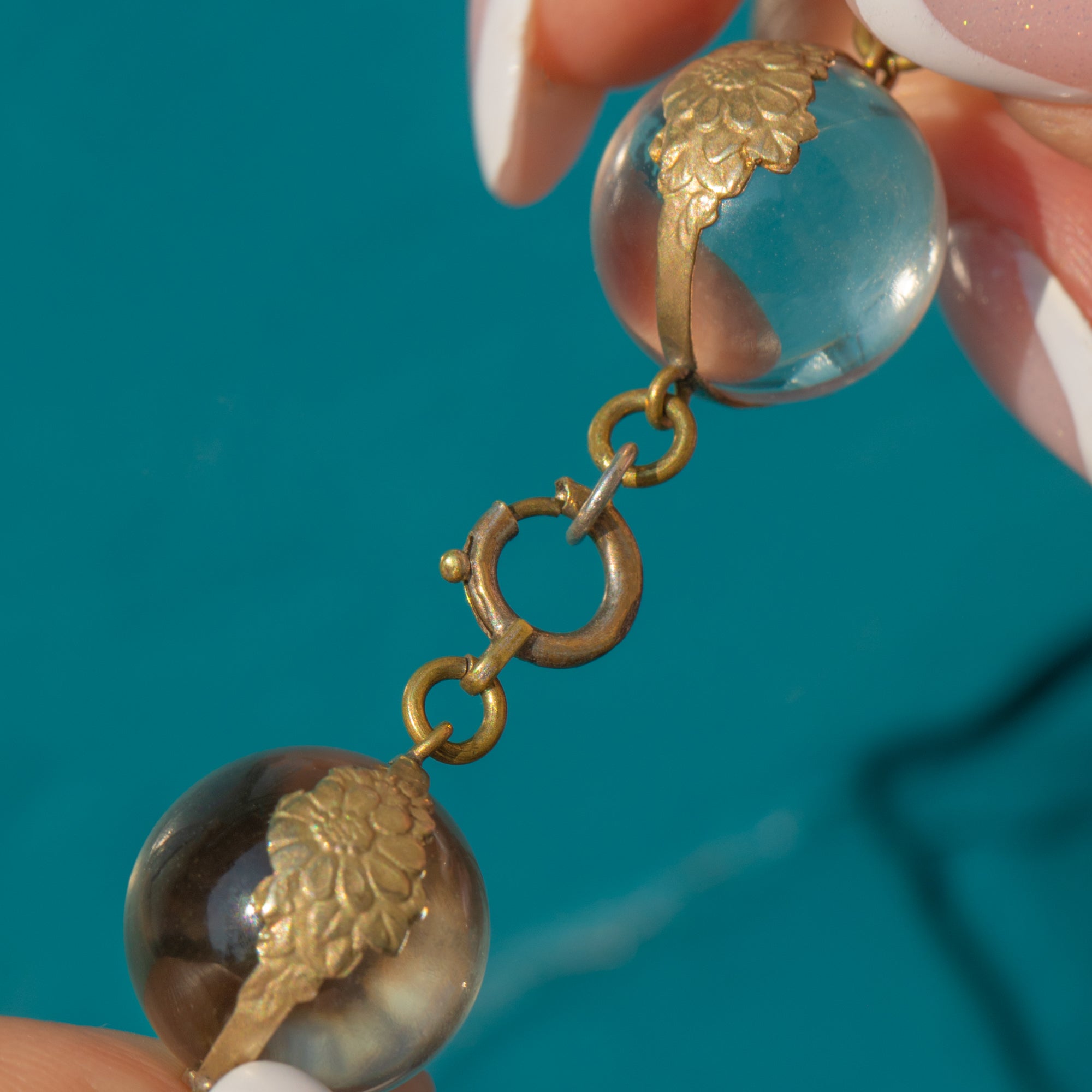 VERY GOOD: This antique Pools of Light Rock Crystal floral bracelet is in very good condition. The Rock Crystal spheres have been immaculately preserved, which is no mean feat when considering their grand age! The settings show sign of wear and their Gold gilt has worn over the years. The engraved details have remained defined, adding a lovely whimsical touch. With a fully functioning bolt ring, you can wear this Victorian Rock Crystal bracelet with utmost confidence!