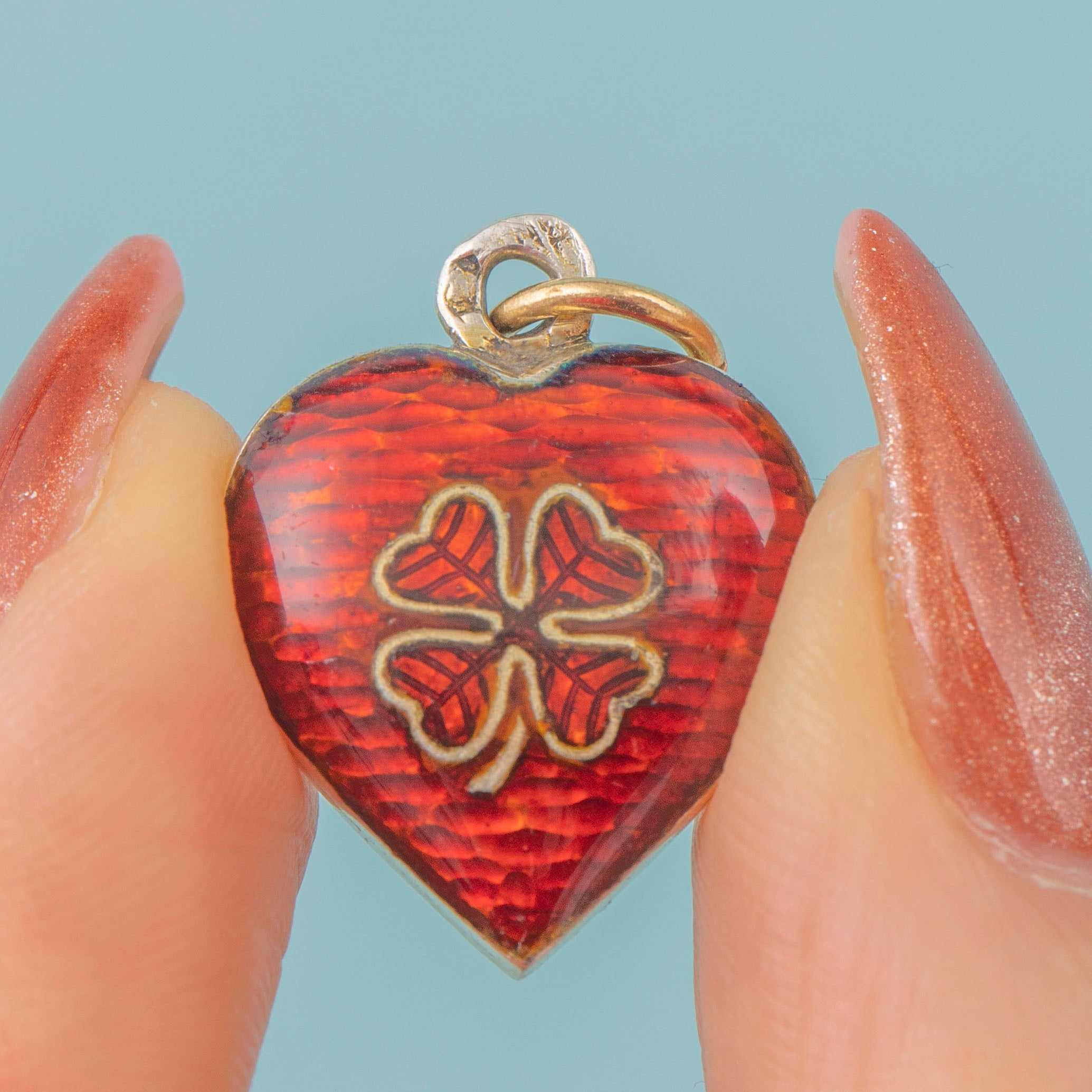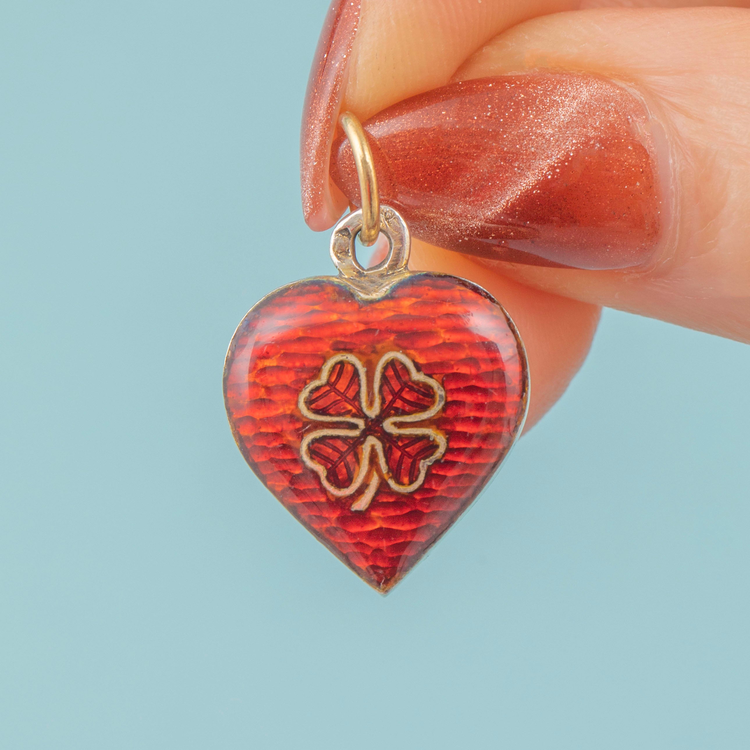Antique Red Enamel Heart Pendant with Shamrock Motif