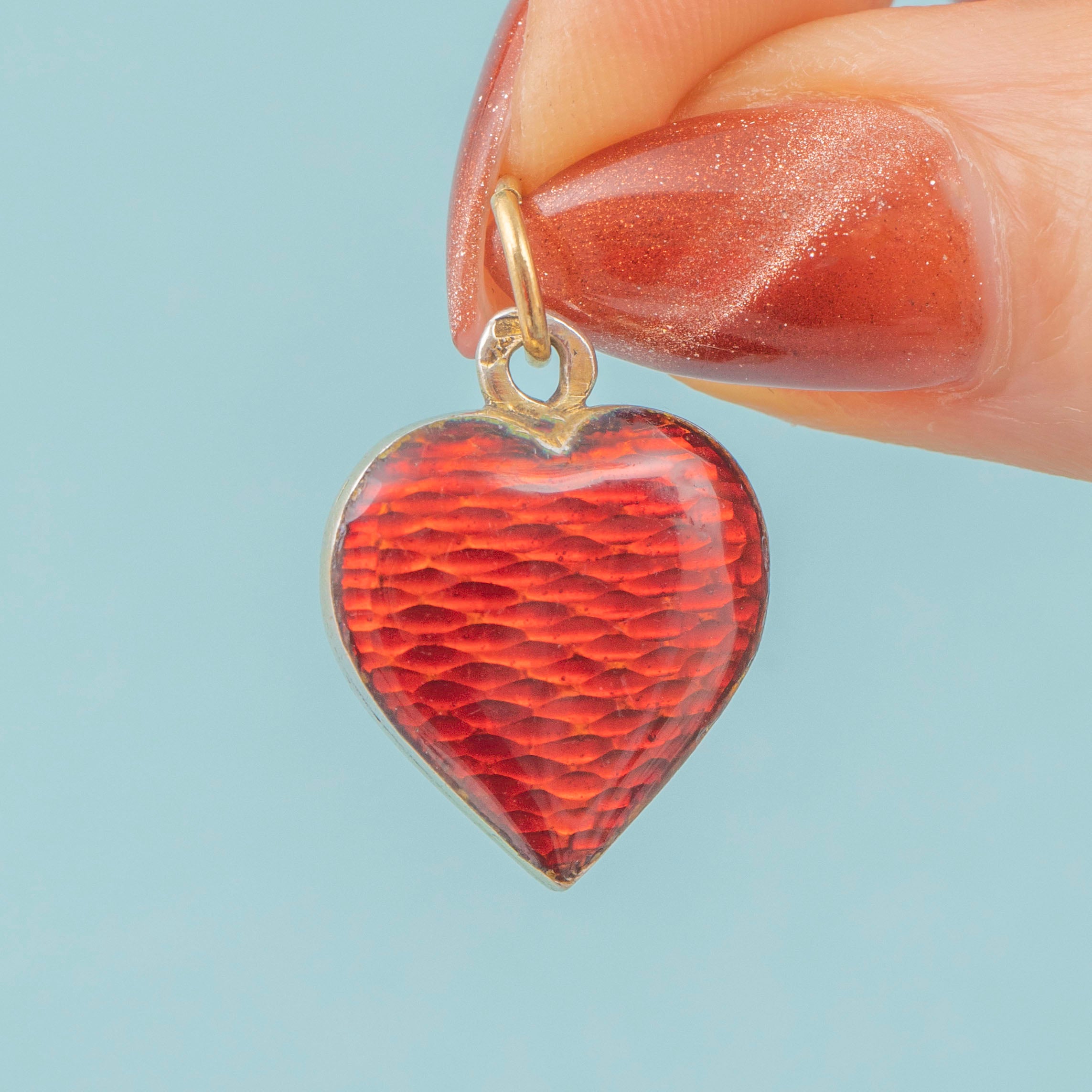 VERY GOOD: This antique red Enamel heart pendant is in very good condition. Her Enamel is bright and saturated, with a lovely depth. There are some notable signs of wear to her Silver settings, however this is commensurate with age and is difficult to notice when wearing and does not affect her functionality. A great piece steeped in history, she is a must-have!