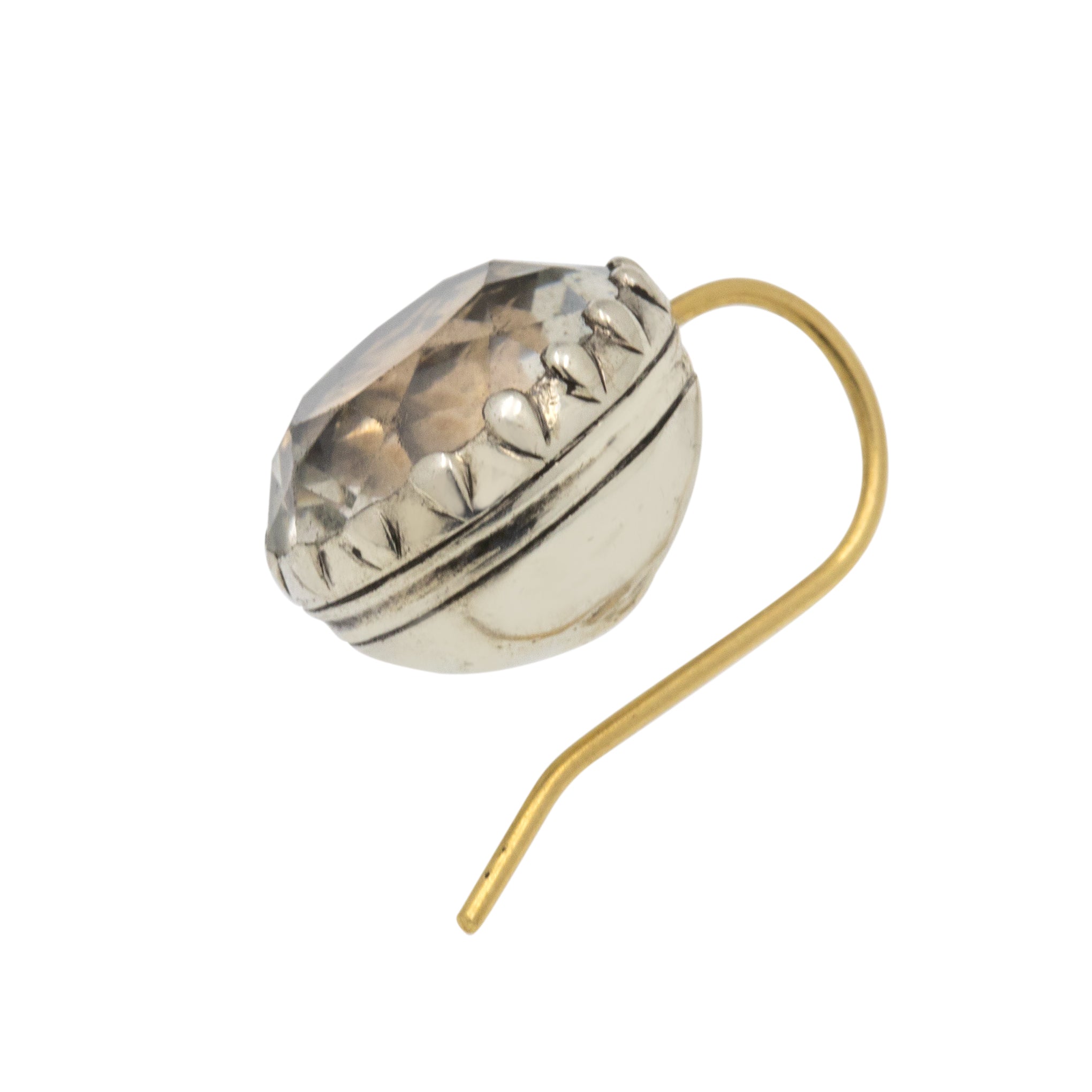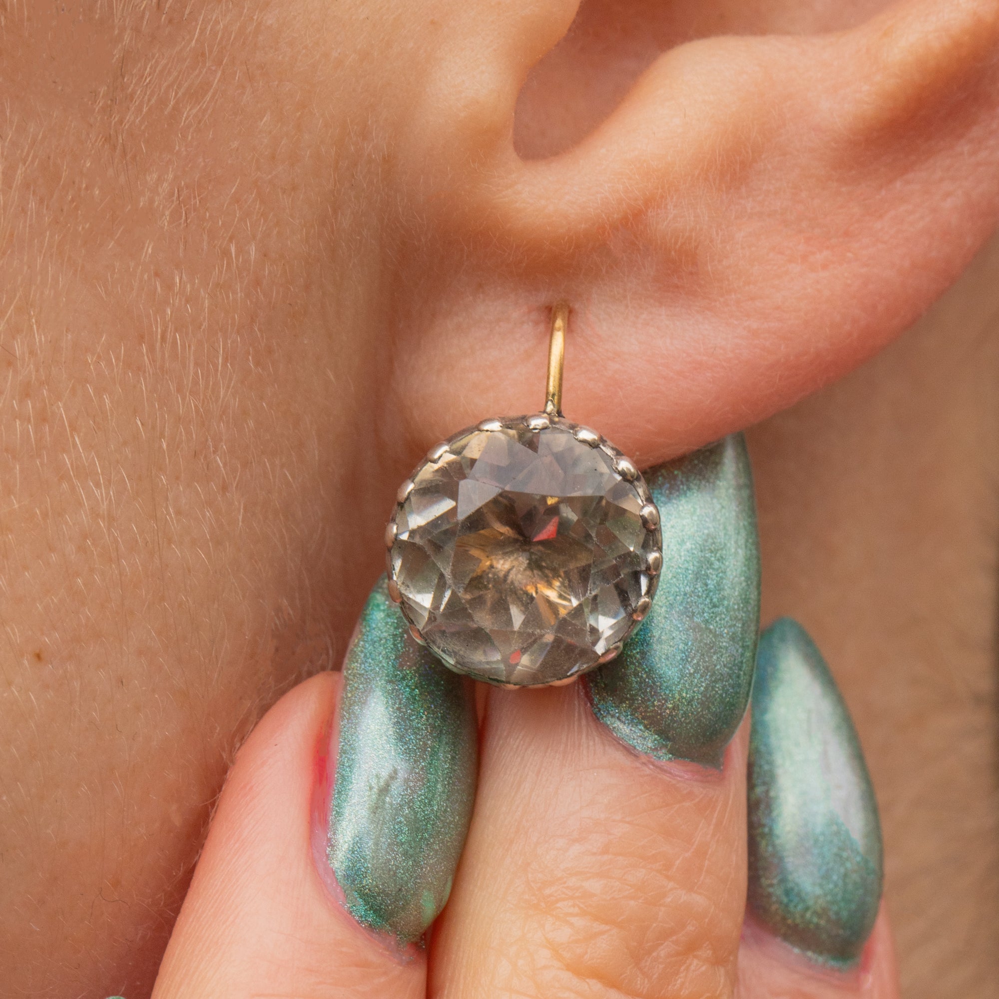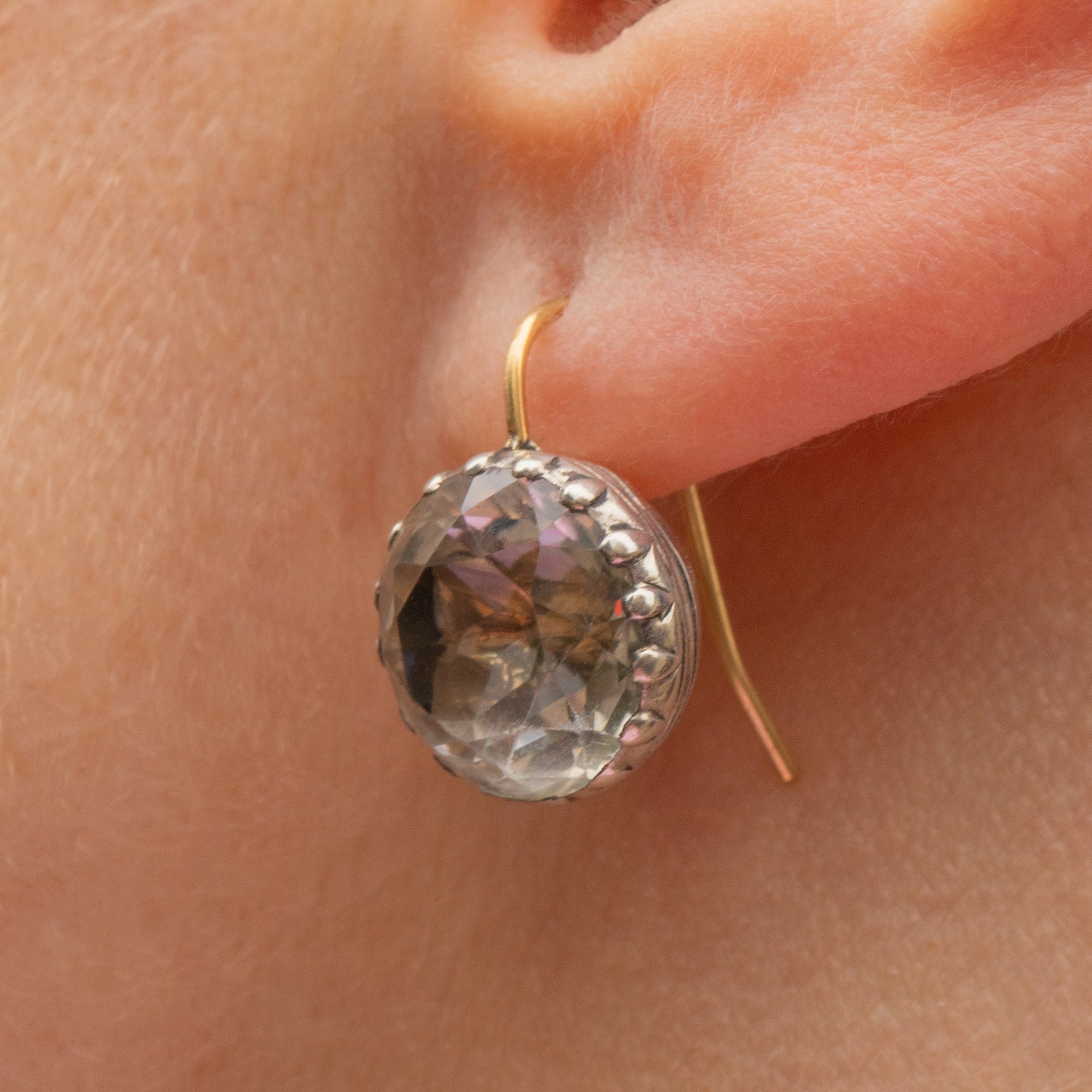 VERY GOOD. These antique Rock Crystal button earrings are in very good condition! The Rock Crystals are secure within their settings and have mesmerising sparkle. There is some wear to the facets, but nothing untoward. To the back at the centre there is some wear from a previous conversion, however the Silver has a bright lustre and the 18ct Gold hooks hold goof form.